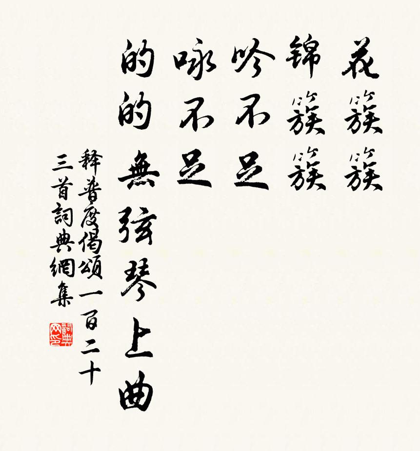 詩詞名句歷史字典書法欣賞書法字典國語詞典說文解字康熙字典古漢語字典標 題 作 者 詩 句 偈頌一百二十三首作者:釋普度 朝代:宋代偈頌一百二十三首原文花簇簇,錦簇簇。吟不足,詠不足。的的無弦琴上曲。詩詞問答問:偈頌一百二十三首的作者是誰?答:釋普度問:偈頌一百二十三首寫於哪個朝代?答:宋代釋普度偈頌一百二十三首書法欣賞偈頌一百二十三首書法作品詩詞推薦何遜徐鈞〔宋代〕水曹文學自名家,重到揚州興未涯。怪底新吟清入骨,一生只為愛梅花。扇子詩李石〔宋代〕秋扇秋風不怕寒,喜攀明月傲霜團。自知奪{左火右胥}無他過,造命何如活命丹。寄處州季侍御二首趙蕃〔宋代〕已上湘祠請,猶須漢臘期。側聽惟此雁,發興在南枝。貧已長年事,官寧向老為。舊聞煙雨觀,猶擬和公詩。病中知皇子陂荷花盛發寄王繢裴夷直〔唐代〕十里蓮塘路不賒,病來簾外是天涯。煩君四句遙相寄,應得詩中便看花。游襄陽山寺張籍〔唐代〕秋色江邊路,煙霞若有期。寺貧無利施,僧老足慈悲。薜荔侵禪窟,蝦蟆占浴池。閒遊殊未遍,即是下山時。江樓寫望釋文珦〔宋代〕危欄朝獨倚,千里望中閒。旭日穿層浪,明霞際斷山。京華襟帶里,于越有無間。鼓枻知誰子,長歌去不還。游始興道館詩陰鏗〔南北朝〕紫台高不極。清溪千仞余。壇邊逢藥銚。洞裡閱仙書。庭舞經乘鶴。池游被控魚。稍昏蕙葉斂。欲暝槿花疎。徒教觀慶雲圖李程〔唐代〕五雲從表瑞,藻繪宛成圖。柯葉何時改,丹青此不渝。非煙色尚麗,似蓋狀應殊。渥彩看猶在,輕陰望已無。方將桑茶坑道中八首楊萬里〔宋代〕秧疇夾岸隔深溪,東水何緣到得西。溪面秪銷橫一視,水從空里過如飛。送周仲固寺正提舉湖北茶鹽餘建炎己酉歲嘗為曾幾〔宋代〕洞庭湖北飽知聞,嘗以輶軒犯楚氛。遠有光華新令尹,分投閒散故將軍。武陵源口自碧水,古德山頭多白雲。一路靈芝寺避暑因攜茶具汎湖共成十絕張鎡〔宋代〕高峰南北兩浮圖,桂隱相看四載余。休怪出關猶從我,有詩處處得儂居。塞上寄家兄高駢〔唐代〕棣萼分張信使希,幾多鄉淚濕征衣。笳聲未斷腸先斷,萬里胡天鳥不飛。早梅芳近李德載〔宋代〕深院靜,小闌傍。標緻不尋常。盡他桃杏占風光。誰敢斗新妝。玉堂中,梁苑裡。休把雪來輕比。莫吹長笛巧摧殘和御製瓊林宴賜進士余復等詩楊萬里〔宋代〕聖主臨軒士袖然,曲江花底宴群賢。九天日月開清照,四海豪英看廣延。秪合致君上堯舜,不應侔德止宗宣。草萊好事近仲並〔宋代〕今古滿胸中,韜略一時人傑。高臥溪山好處,遲十年齋鉞。朱轓休傍武陵溪,梅花記曾別。早晚殿前歸侍,總周廬胡葦航寄古劍盛世忠〔宋代〕有人尺錦長安來,遠寄寶匣手自開。紅雲紫氣燦虛室,鋏中青蛇鱗生苔。誠攜掌握一揮動,瞬息天地興風雷。少年一錢行贈林茂之吳嘉紀〔清代〕先生春秋八十五,芒鞋重踏揚州路。故交但有丘塋存,白楊催盡留枯根。昔游倏過五十載,江山宛然人代改。滿地偈頌七十一首釋了惠〔宋代〕七手八腳,三頭兩面。歡喜冤家,頭頭撞見。山僧建立宗旨,直須為我成褫。學人未達其源,也要請師方便。有方漁村雜句十首薛嵎〔宋代〕猿鶴何曾肯受羈,仙來亭畔立多時。物情未到忘機地,步步行行只自疑。過錢員外司空曙〔唐代〕為郎頭已白,跡向市朝稀。移病居荒宅,安貧著敗衣。野園隨客醉,雪寺伴僧歸。自說東峰下,松蘿滿故扉。知名句推薦愁凝處,渺渺殘照紅斂吳文英《宴清都·秋感》 守職而不廢,處義而不回。黃石公《素書·正道》 忽聞歌古調,歸思欲沾巾。杜審言《和晉陵陸丞早春遊望》 塞下秋來風景異,衡陽雁去無留意。范仲淹《漁家傲·秋思》 豪傑向簡淡中求,神仙從忠孝上起。陳繼儒《小窗幽記·集醒篇》 故父母、學、君三者,莫可以為治法。墨子《墨子·04章 法儀》 年年端午風兼雨,似為屈原陳昔冤。趙蕃《端午三首》 欲將輕騎逐,大雪滿弓刀。盧綸《和張僕射塞下曲·其三》 長安故人問我,道尋常、泥酒只依然。辛棄疾《木蘭花慢·滁州送范倅》 天下雖安,忘戰必危。姜子牙《司馬法·仁本》