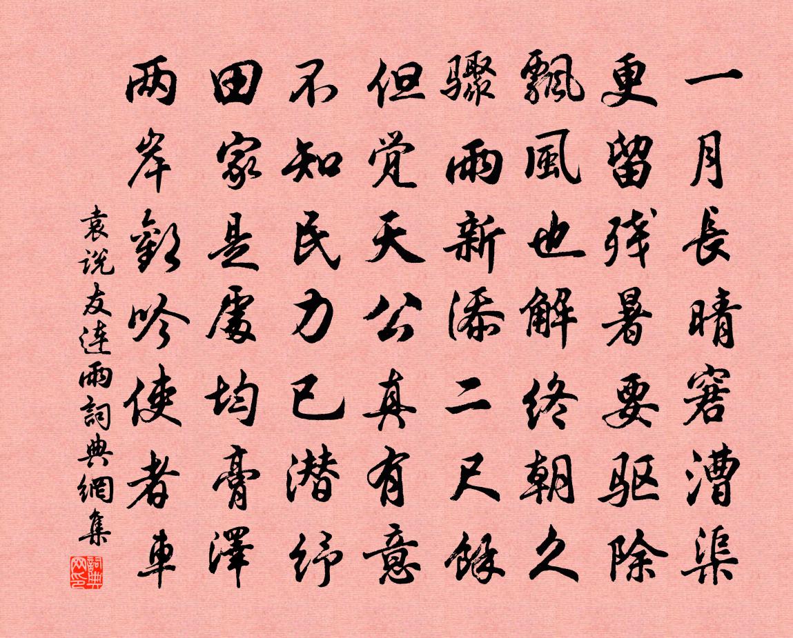 詩詞名句歷史字典書法欣賞書法字典國語詞典說文解字康熙字典古漢語字典標 題 作 者 詩 句 連雨作者:袁說友 朝代:宋代連雨原文一月長晴窘漕渠,更留殘暑要驅除。飄風也解終朝久,驟雨新添二尺余。但覺天公真有意,不知民力已潛紓。田家是處均膏澤,兩岸歡吟使者車。詩詞問答問:連雨的作者是誰?答:袁說友問:連雨寫於哪個朝代?答:宋代袁說友連雨書法欣賞連雨書法作品詩詞推薦題君山方乾〔唐代〕曾於方外見 * ,聞說君山自古無。元是崑崙山頂石,海風吹落洞庭湖。意難忘陳允平〔宋代〕額粉宮黃。襯桃花扇底,歌送瑤觴。裙拖金縷細,衫唾碧花香。瓊佩冷,玉肌涼。羅襪步滄浪。漫共伊,心盟意約遺興楊時〔宋代〕嵩華千仞立,不礙天地寬。涇渭清濁流,不離海波瀾。人生過眼萬事役,記憶細故真童頑。重贈蘇轍〔宋代〕出家無復家,視身等雲浮。東西隨風行,忽然遍九州。君居龍川城,築室星一周。屋瓦如翬飛,象設具冕旒。弟子種藥梅堯臣〔宋代〕雲外陽翟山,實與嵩少接。山中採藥人,能自辨苗葉。當須斸其根,以遂素所愜。野籜包舊土,遠置風雨捷。故本秋日遣懷陸游〔宋代〕野風聲如潮,溪水色可染。浮雲時翳日,亦作雨數點。行歌雖放浪,未至越繩檢。蕭然茅三間,送老此山崦。海邊僧寺絕筆諸葛夢宇〔宋代〕孤臣垂死愈心傷,捲土重來豈望還。萬裏海濤鳴戰鼓,千年靈氣結浮山。魚龍亦解齊殊類,犬馬誰教到此間。留得吳子野絕粒不睡過作詩戲之芝上人陸道士皆和蘇軾〔宋代〕聊為不死五通仙,終了無生一大緣。獨鶴有聲知半夜,老蠶不食已三眠。憐君解比人間夢,許我時逃醉後禪。會與次韻楊明叔見餞十首黃庭堅〔宋代〕事隨世滔滔,心欲自得得。楊君為己學,度越流輩百。坐捫故衣虱,垢襪春汗黑。睥睨紈袴兒,可飲三斗墨。詩酒王禹偁〔宋代〕白頭郎吏合歸耕,猶戀君恩典郡城。已覺功名乖素志,祗憑詩酒送浮生。剛腸減後微微諷,病眼昏來細細傾。樽杓東林寺范成大〔宋代〕談易翻經宰木春,三生猶自裊煙燻。客塵長隔虎溪水,劫火不侵香谷雲。老矣懶供蓮社課,歸哉忺讀草堂文。山頭句鄭剛中〔宋代〕一寸雲萬斛泉。送圭子赴淮南總所排岸任陳宓〔宋代〕久叨簪紱裔,初筮帝王州。祖德期無忝,君恩要力酬。存心惟敬謹,律已必清修。千里書頻寄,重親鬢已秋。就義詩楊繼盛〔明代〕浩氣還太虛,丹心照千古。生平未報國,留作忠魂補。水龍吟·甲辰歲壽韓南辛棄疾〔宋代〕渡江天馬南來,幾人真是經綸手。長安父老,新亭風景,可憐依舊。夷甫諸人,神州沉陸,幾曾回首。算平戎萬里詠史詩青冢胡曾〔唐代〕玉貌元期漢帝招,誰知西嫁怨天驕?至今青冢愁雲起,疑是佳人恨未銷。洞仙歌張繼先〔宋代〕孤峰絕頂,更無人能到。萬里虛空沒邊徼。正秋高景靜,霧掃雲收,風露里,惟有月華高照。浮生紛過客,好天良左目痛六言九首劉克莊〔宋代〕昏花廢乾祿書,麻嗏類辟瘟符。草字見嗤醉禿,小楷難付官奴。織圖二十四首大起樓璹〔宋代〕盈箱大起時,食桑聲似雨。春風老不知,蠶婦忙如許。呼兒刈青麥,朝飯已過午。妖歌得綾羅,不易青裙女。醉花陰仲殊〔宋代〕輕紅蔓引絲多少。剪青蘭葉巧。人向月中歸,留下星鈿,彈破真珠小。等閒不管春知道。多著繡簾圍繞。只恐被東名句推薦反者道之動;弱者道之用。老子《老子·德經·第四十章》 以子之矛,陷子之盾韓非及後人《韓非子·難一》 易得凋零,更多少無情風雨趙佶《宴山亭·北行見杏花》 攜盤獨出月荒涼,渭城已遠波聲小。李賀《金銅仙人辭漢歌》 五原秋草綠,胡馬一何驕。李白《塞上曲》 博厚,所以載物也。高明,所以覆物也。悠久,所以成物也。子思《中庸·第二十六章》 淮水東邊舊時月,夜深還過女牆來。劉禹錫《金陵五題·石頭城》 盛年不重來,一日難再晨。陶淵明《雜詩·人生無根蒂》 欲共柳花低訴,怕柳花輕薄,不解傷春。黃孝邁《湘春夜月·近清明》 古剎疏鍾度,遙嵐破月懸。李賀《南園十三首》