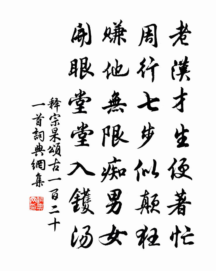 詩詞名句歷史字典書法欣賞書法字典國語詞典說文解字康熙字典古漢語字典標 題 作 者 詩 句 頌古一百二十一首作者:釋宗杲 朝代:宋代頌古一百二十一首原文老漢才生便著忙,周行七步似顛狂。賺他無限痴男女,開眼堂堂入鑊湯。詩詞問答問:頌古一百二十一首的作者是誰?答:釋宗杲問:頌古一百二十一首寫於哪個朝代?答:宋代釋宗杲頌古一百二十一首書法欣賞頌古一百二十一首書法作品詩詞推薦硯答趙蕃〔宋代〕食硯固可愛,硯枯還有雲。先生信難說,吾事亦徒勤。歲久當消髀,研窮且斷筋。不如因墜地,瘞得退之文。春晚山行殷遙〔唐代〕寂歷青山晚,山行趣不稀。野花成子落,江燕引雛飛。暗草薰苔徑,晴楊掃石磯。俗人猶語此,余亦轉忘歸。送僧賈島〔唐代〕出家從丱歲,解論造玄門。不惜揮談柄,誰能聽至言。中時山果熟,後夏竹陰繁。此去逢何日,峨嵋曉復昏。觀文殿學士趙公輓詞樓鑰〔宋代〕千古盛周宗,皇朝實比隆。位多窮貴爵,誰見立王功。一語國先定,寸心天與通。龍飛稽事實,信史詔無窮。和內鄉李師甫長官見寄邵雍〔宋代〕雖未似神仙,能逃暑與寒。何嘗無水竹,未始離林巒。道不同新學,才難動要官。時和歲豐後,亦自有餘歡。獨酌清溪江石上寄權昭夷李白〔唐代〕我攜一樽酒,獨上江祖石。自從天地開,更長几千尺。舉杯向天笑,天回日西照。永願坐此石,長垂嚴陵釣。寄謝秋池黃庚〔宋代〕西風吟露冷銀塘,菰葉蕭疏柳葉黃。秋水不知時色老,藕花猶學少年妝。瑞鶴仙(歸寧都,因成,寄時香諸院)趙長卿〔宋代〕無言屈指也。算年年底事,長為旅也。悽惶受盡也。把良辰美景,總成虛也。自嗟嘆也。這情懷、如何訴也。謾愁芝產之五日有雙蓮生於東池亟往視之出水已二郭印〔宋代〕紅幢翠蓋插方池,中有駢花並一枝。聖澤汪洋招瑞應,小臣螻蟻豈能私。有所嗟二首(一作元稹詩,題作所思)劉禹錫〔唐代〕庾令樓中初見時,武昌春柳似腰肢。相逢相笑盡如夢,為雨為雲今不知。鄂渚濛濛煙雨微,女郎魂逐暮雲歸。只應和仲蒙夜坐文同〔宋代〕宿鳥驚飛斷雁號,獨憑幽幾靜塵勞。風鳴北戶霜威重,雲壓南山雪意高。少睡始知茶效力,大寒須遣酒爭豪。硯冰觀楚國寺璋上人寫一切經院,南有曲池深竹岑參〔唐代〕璋公不出院,群木閉深居。誓寫一切經,欲向萬卷餘。揮毫散林鵲,研墨驚池魚。音翻四句偈,字譯五天書。鳴鐘被盜方岳〔宋代〕鼠輩真成誤,吾塘底用穿。近蘭貧有藁,舊物冷無氈。輦路沈秋柝,乾掫老禁壖。故應萑葦外。薄暮不堪船。相州山池作張說〔唐代〕嘗懷謝公詠,山水陶嘉月。及此年事衰,徒看眾花發。觀魚樂何在,聽鳥情都歇。星漢流不停,蓬萊去難越。鄴中句賀知章〔唐代〕落花真好些,一醉一回顛。(見《詩式》)其三李賀〔唐代〕洞房思不禁,蜂子作花心。灰暖殘香炷,發冷青蟲簪。夜遙燈焰短,睡熟小屏深。好作鴛鴦夢,南城罷搗砧。醉桃源/阮郎歸謝逸〔宋代〕風飄萬點落花飛。殘紅枝上稀。平蕪葉上淡煙迷。那堪春鳥啼。風細細,日遲遲。輕紗疊雪衣。多情多病懶追隨。次韻叔羽聽琴詩李處權〔宋代〕嶧桐斲孫枝,所取非老大。比其爨之焦,孰謂邕也過。拂拭見太古,斷腹宛蛇臥。持來長安市,萬口莫能破。愛公水調歌頭(垂虹橋亭詞)崔敦禮〔宋代〕倚棹太湖畔,踏月上垂虹。銀濤萬頃無際,渺渺欲浮空。為問瀛洲何在,我欲騎鯨歸去,揮手謝塵籠。未得世緣了題貞女祠姚合〔唐代〕此女骨為土,貞名不可移。精靈閟何處,蘋藻奠空祠。水石生異狀,杉松無病枝。我來方謝雨,延滯失歸期。名句推薦把酒送春春不語。黃昏卻下瀟瀟雨。朱淑真《蝶戀花·送春》 同是天涯淪落人,相逢何必曾相識!白居易《琵琶行 / 琵琶引》 紅日淡,綠煙晴。流鶯三兩聲。晏幾道《更漏子·柳絲長》 露清枕簟藕花香,恨悠揚。顧敻《虞美人·觸簾風送景陽鍾》 想文君望久,倚竹愁生步羅襪。姜夔《八歸·湘中送胡德華》 故國雖大,好戰必亡;天下雖安,忘戰必危。姜子牙《司馬法·仁本》 葉暗乳鴉啼,風定老紅猶落。蔣元龍《好事近·葉暗乳鴉啼》 綠蓑江上秋聞笛,紅袖樓頭夜倚欄。曹雪芹《香菱詠月·其三》 朽木不可雕也,糞土之牆不可圬也!佚名《宰予晝寢》 落梅庭榭香,芳草池塘綠。晏幾道《生查子·落梅庭榭香》