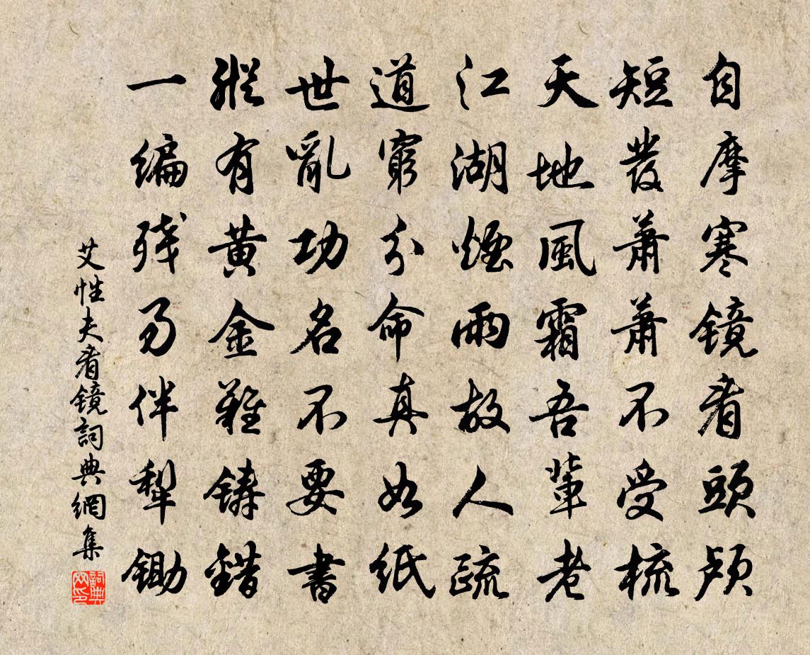 詩詞名句歷史字典書法欣賞書法字典國語詞典說文解字康熙字典古漢語字典標 題 作 者 詩 句 看鏡作者:艾性夫 朝代:宋代看鏡原文自摩寒鏡看頭顱,短髮蕭蕭不受梳。天地風霜吾輩老,江湖煙雨故人疏。道窮分命真如紙,世亂功名不要書。縱有黃金難鑄錯,一編殘易伴犁鋤。詩詞問答問:看鏡的作者是誰?答:艾性夫問:看鏡寫於哪個朝代?答:宋代問:看鏡是什麼體裁?答:七律艾性夫看鏡書法欣賞看鏡書法作品詩詞推薦月趙蕃〔宋代〕水鳥飛鳴自往還,蒼然暝色暗林巒。離家又見磨鐮月,九月誰憐絺綌寒。水調歌頭張元乾〔宋代〕雨斷翻驚浪,山瞑擁歸雲。麥秋天氣,聊泛征棹泊江村。不羨腰間金印,卻愛吾廬高枕,無事閉柴門。搔首煙波上曉巡北圃七絕白玉蟾〔宋代〕雨余花點滿紅橋,柳雪粘泥夜不消。曉霧忽無還忽有,春山如近又如遙。送石士志推官赴調洪咨夔〔宋代〕石友抱奇璞,朅來掾吾邦。昂然凌霄姿,莒鼎獨力扛。入幕有此士,諸人亮難雙。決事風赴谷,喔詩雨翻江。青衫次陸放翁韻蘇泂〔宋代〕登高望遠不可無,不可一日不讀書。予方自委下濕地,君乃獨占高明居。楊雲儻許客載酒,杜陵安得錢買驢。徐行贊歷代天師第二十一代諱秉字溫甫白玉蟾〔宋代〕火腹金龜夢正疑,琳房初誕謫仙兒。丹傳祖印百來歲,執笏歸仙地震時。朝中措佚名〔宋代〕宦遊只欲賦歸休。花為解離愁。看取星星潘鬢,花應羞上人頭。武陵流水,桃源路遠,空誤漁舟。把住春光一醉,紅樓夢十二曲——枉凝眉曹雪芹〔清代〕一個是閬苑仙葩,一個是美玉無瑕。若說沒奇緣,今生偏又遇著他;若說有奇緣,如何心事終虛話?一個枉子嗟呀月夜梧桐葉上見寒露戴察〔唐代〕蕭疏桐葉上,月白露初團。滴瀝清光滿,熒煌素彩寒。風搖愁玉墜,枝動惜珠乾。氣冷疑秋晚,聲微覺夜闌。凝空雙韻子(般涉調)張先〔宋代〕鳴鞘電過曉闈靜。斂龍旂風定。鳳樓遠出霏煙,聞笑語、中天迥。清光近。歡聲竟。鴛鴦集、仙花斗影。更聞席曲觀物吟二首邵雍〔宋代〕百穀仰膏雨,極枯變極榮。安得此甘澤,聊且振群生。定風波王哲〔元代〕每日閒遊西復東。隨緣且過住塵中。杳杳冥冥今古在。蒙蒙。害風風裡得飄蓬。公且只知浮蟻動,我今偏愛滿堂紅懷趙蘄州文鼎趙蕃〔宋代〕吾州憶當南渡初,居有曾呂守則徐。本門林下亦此渠,往往詩流非酒徒。邇來流風頗寂寞,南池二公了不惡。李今謝送牡丹趙孟堅〔宋代〕蘸蠟封枝翦昨新,開奩帶露尚精神。洛陽路遠風塵暗,腸斷應無做譜人。阻風茅山港項安世〔宋代〕我非汲汲馳名者,何事區區逆浪間。三釜及親須為米,可辭為客下茅山。奉和王世弼寄上七兄先生用其韻黃庭堅〔宋代〕宮槐弄黃黃,蓮葉綠婉婉。時同二三友,竹軒涼夏晚。駕言都城南,以望徵車返。何知苦淹回,及此秋景短。愁思感皇恩李彌遜〔宋代〕花院小迴廊,庭萱成行。水面紅妝翠綃帳。蓬萊雲近,風露一番清曠。星郎來碧落,長庚象。素志未酬,丹心益壯大熱戲作晁說之〔宋代〕仕板三十年,罪籍乃十歲。妻兒嘆朝夕,欲免饑寒累。爾來官南陬,長夏苦炎熾。自疑吾其魚,釜鬵方盡沸。金石南園雜詩六首蓮房司馬光〔宋代〕蓮房前後熟,供啖不須齊。肉嫩山蜂子,棱深天馬蹄。尚連余蕊在,深映亂荷低。脆美知新采,近根猶帶泥。清平樂陳德武〔宋代〕隨風情性。聚散元無定。雨過黃昏收拾盡。送出月明花影。誰言出岫無心。騰騰飛上巫岑。夢斷不知何處,玉人鬢名句推薦霧失樓台,月迷津渡。秦觀《踏莎行·郴州旅舍》 雲中亂拍祿山舞,風過重巒下笑聲。杜牧《過華清宮絕句三首》 故去喜去惡,虛心以為道舍。韓非及後人《韓非子·揚權》 秋木萋萋,其葉萎黃,有鳥處山,集於苞桑。王昭君《怨詞》 非知之艱,行之惟艱。佚名《尚書·商書·說命中》 何須急管吹雲暝,高寒灩灩開金餅。高觀國《菩薩蠻·何須急管吹雲暝》 逐流牽荇葉,緣岸摘蘆苗。儲光羲《江南曲四首》 少婦今春意,良人昨夜情。沈佺期《雜詩三首·其三》 臣聞君子樂得其志,小人樂得其事。姜子牙《六韜·文韜·文師》 三更燈火五更雞,正是男兒讀書時。顏真卿《勸學詩》