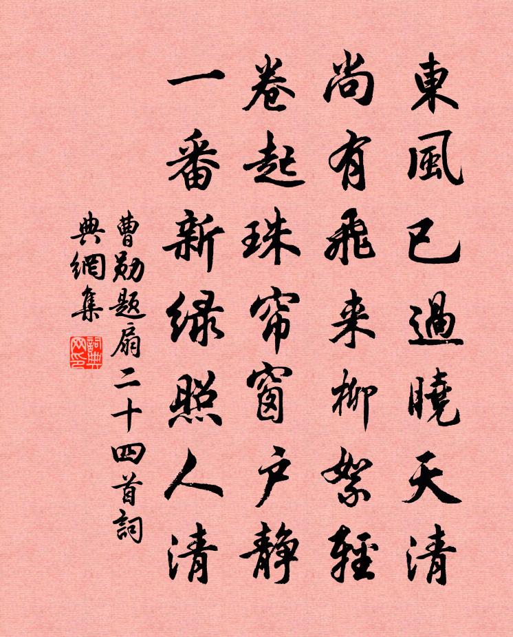 詩詞名句歷史字典書法欣賞書法字典國語詞典說文解字康熙字典古漢語字典標 題 作 者 詩 句 題扇二十四首作者:曹勛 朝代:宋代題扇二十四首原文東風已過曉天清,尚有飛來柳絮輕。捲起珠簾窗戶靜,一番新綠照人清。詩詞問答問:題扇二十四首的作者是誰?答:曹勛問:題扇二十四首寫於哪個朝代?答:宋代曹勛題扇二十四首書法欣賞題扇二十四首書法作品詩詞推薦頌古三十一首釋安永〔宋代〕這僧掩耳偷鈴,雲山將錯就錯。若是碧眼胡兒,別有反身一著。和韋侍御寓直對雨錢起〔唐代〕名貴四科首,班宜二妙齊。如何厭白簡,未得步金閨。寓直晦秋雨,吟餘聞遠雞。漏聲過旦冷,雲色向窗低。誰謂病起思歸王禹偁〔宋代〕年年多病轉思山,終日呻吟簿籍間。叔夜養生休著論,陶潛難死只因閒。又移郡印三年調,未報君恩兩鬢斑。安得暗香(再和)吳潛〔宋代〕雪來比色。對澹然一笑,休喧笙笛。莫怪廣平,鐵石心腸為伊折。偏是三花兩蕊,消萬古、才人騷筆。尚記得,醉晚晴曹彥約〔宋代〕賸水浸秋碧,餘霞占晚紅。浩歌鳴鶴後,柔櫓泛鷗中。酒戒情難遣,詩吟老未工。懷哉真面目,助順企清風。送龔鼎臣諫議移守青州二首蘇轍〔宋代〕面山負海古諸侯,信美東方第一州。勝勢未容秦地險,奇花僅比雒城優。新絲出盎冬裘具,貢棗登場歲事休。鈴閣弟偁歸鄉楊億〔宋代〕吾家文雅占關西,五十年來桂兩枝。突弁後生還可畏,籯金素業未應衰。江湖去為思鱸膾,霧雨還歸養豹姿。摩厲記漢事二首劉克莊〔宋代〕溺天子殿衙,嘔丞相車茵。古有禮揖客,今無劾弄臣。如夢令(建康作)趙鼎〔宋代〕煙雨滿江風細。江上危樓獨倚。歌罷楚雲空,樓下依前流水。迢遞。迢遞。目送孤鴻千里。獅兒詞 賦梅次仇山村韻張雨〔元代〕含香弄粉,便句引、游騎尋芳,城南城北。別有西村、斷港冰澌微綠。孤山路熟。伴老鶴、晚先尋宿。怕凍損、三上張丞相十首張元乾〔宋代〕閩粵諸侯地,春風盡去思。三年歌德政,萬戶繪生祠。位極聊方伯,謀深必帝師。待 * 社稷,四海被恩私。山居即事余觀復〔宋代〕密竹環茆舍,應無俗士過。睡濃嫌日出,坐久厭塵多。斗雀翻危葉,飢鵝唼短莎。世塗真九曲,奔走欲如何。滿庭芳(壽通判七月二十二日)方岳〔宋代〕星昴呈祥,山川鍾秀,果然生此真賢。精神瑩澈,秋水共長天。況值西風初起,中元過、七日涼先庭院爽,稱觴賀雨中花/夜行船毛滂〔宋代〕寒浸東傾不定。更奈櫓聲催緊。堤樹朧明孤月上,暗淡移船影。舊事十年愁未醒。漸老可禁離恨。今夜誰知風露里吳市售藥陳深〔宋代〕山夫卿作市廛居,漫學台公計已疏。收卷向來經濟策,古今行役未曾休。浣溪沙晁端禮〔宋代〕晝漏遲遲出建章。驚回殘夢日猶長。風微歌吹度昭陽。瀋水燒殘金鴨冷,胭脂勻罷紫綿香。一枝花影上東廊。調笑/調笑令晁補之〔宋代〕相誤。空凝佇。鄭子江頭逢二女。霞衣曳玉非塵土。笑解明璫輕付。月從雲墮勞相慕。自有驂鸞仙侶。惜餘春慢/選冠子陳德武〔宋代〕闌葺疏蘆,簾編小葦,好個清幽公館。栽槐夾道,種菊盈軒,景物便堪詠玩。門外一番雨餘,嫩綠緣枝,淺清清眼蘇幕遮 丹陽祠堂王處一〔元代〕彥明姜,鍾子政。文舉先生,三友於中省。各發丹誠用得正。助闡玄門,轉化昌陽境。玉陽王,為袖領。外誘諸公次韻六安魏明府三首陳舜俞〔宋代〕幾慕功名逐轉蓬,既無成就苦為悰。不如歸聽華亭鶴,耆舊於今憶二龍。名句推薦明敕星馳封寶劍,辭君一夜取樓蘭。王昌齡《從軍行七首》 笑殺陶淵明,不飲杯中酒。李白《嘲王歷陽不肯飲酒》 青青一樹傷心色,曾入幾人離恨中。白居易《青門柳》 岱宗夫如何?齊魯青未了。杜甫《望岳》 山夾水,澗。陵夾水,澞。山有穴為岫。佚名《爾雅·釋山》 萋萋芳草憶王孫。柳外樓高空斷魂。李重元《憶王孫·春詞》 荷葉生時春恨生,荷葉枯時秋恨成。李商隱《暮秋獨游曲江》 浮雲柳絮無根蒂,天地闊遠隨飛揚。韓愈《聽穎師彈琴》 勸君莫惜花前醉,今年花謝,明年花謝,白了人頭。趙秉文《青杏兒·風雨替花愁》 酒入愁腸,化作相思淚。范仲淹《蘇幕遮·懷舊》