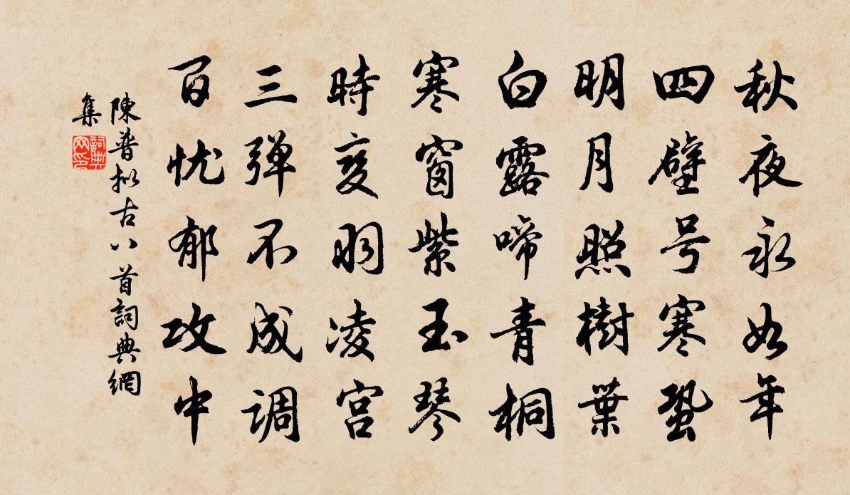詩詞名句歷史字典書法欣賞書法字典國語詞典說文解字康熙字典古漢語字典標 題 作 者 詩 句 擬古八首作者:陳普 朝代:宋代擬古八首原文秋夜永如年,四壁號寒蛩。明月照樹葉,白露啼青桐。寒窗紫玉琴,時變羽凌宮。三彈不成調,百憂鬱攻中。詩詞問答問:擬古八首的作者是誰?答:陳普問:擬古八首寫於哪個朝代?答:宋代陳普擬古八首書法欣賞擬古八首書法作品詩詞推薦午坐戲詠陸游〔宋代〕貯藥葫蘆二寸黃,煎茶橄欖一甌香。午窗坐穩摩痴腹,始覺龜堂白日長。湘中感懷齊己〔唐代〕漁翁那會我,傲兀葦邊行。亂世難逸跡,乘流擬濯纓。江花紅細碎,沙鳥白分明。向夕題詩處,春風斑竹聲。南山詩韓愈〔唐代〕吾聞京城南,茲維群山囿。東西兩際海,巨細難悉究。山經及地誌,茫昧非受授。團辭試提挈,掛一念萬漏。欲休句曾季貍〔宋代〕惟有山茶殊奈久,獨能探月占春風。句徐似道〔宋代〕北風萬籟自宮徵,南日一軒真袴襦。好事近(燈花)曹冠〔宋代〕良月戒微寒,清夜祥煙馥郁。來報天庭喜事,現燈花金粟。芝書奎畫下層霄,宣召想來促。它日玉堂揮翰,賜金蓮隴西行·天上何所有佚名〔兩漢〕天上何所有,歷歷種白榆。桂樹夾道生,青龍對道隅。鳳凰鳴啾啾,一母將九雛。顧視世間人,為樂甚獨殊。好婦奉和幸長安故城未央宮應制宋之問〔唐代〕漢王未息戰,蕭相乃營宮。壯麗一朝盡,威靈千載空。皇明悵前跡,置酒宴群公。寒輕彩仗外,春發幔城中。樂思清閟堂洪邁〔宋代〕昔聞王子猷,借宅亦種竹。此君固可喜,人亦清不俗。伯氏貧而癯,一飯不飽肉。堂前自經始,護此無盡綠。一官啄木鳥二首魏野〔宋代〕亂繞園林啄,終朝意若何。莫因飢不足,翻愛蠹偏多。渴映鄰溪下,驚從別樹過。辛勤詠還囑,無損好枝柯。送謝著作歸陳州梅堯臣〔宋代〕騏驥泥中行,偶蹶未千里。終當至高衢,尚苦泥行恥。今歸雨濛濛,嘶鳴欲何止。乃念彼名駒,近在清川涘。他日石席釋保暹〔宋代〕有狀卷不得,間齋惜夜長。坐來消暑氣,睡去入秋鄉。隱隱生寒骨,沈沈發冷光。何時遂深遁,移取置山房。黃甘司馬光〔宋代〕黃金綴縹帶,搖落楚江涯。采助杯盤勝,羞將橘柚偕。時移香不變,物遠味尤佳。欲種滄洲樹,何年此意諧。慶長叔招飲一桮,未釂,雪聲璀然。即席走筆楊萬里〔宋代〕不是今宵雪不清,只愁清殺老書生。不知落得幾多雪,做盡北風無限聲?菩薩蠻王安中〔宋代〕玉纖傳酒浮香菊。菊香浮酒傳纖玉。弦管沸歡筵。筵歡沸管弦。出簾珠袖蔌。蔌袖珠簾出。眉暈淺山低。低山淺暈山行雜詩(七首選—)趙翼〔清代〕山雲才滃起,頃刻雨點飄。乃知雲變雨,不必到層霄。只在百丈間,即化甘澍膏。君看雲薄處,曦影如隔綃。自是漳河疑冢京鏜〔宋代〕疑冢多留七十餘,謀身自謂永無虞。不知三馬同槽夢,曾為兒童遠慮無。和雙溪五首曹勛〔宋代〕從來絕粒喜留侯,作個庵成漫幾秋。未得歸休桐柏去,每尋故老話台州。句王炎〔宋代〕柳暗大堤曲,梅藏解佩人。望江南李真人〔元代〕初學道,須認得真船。採取鉛中金白雪,卻將金雪作丹田。方始見重名句推薦十里西疇熟稻香,槿花籬落竹絲長,垂垂山果掛青黃。范成大《浣溪沙·江村道中》 老景蕭條,送君歸去添淒斷。毛滂《燭影搖紅·送會宗》 敗荷零落,衰楊掩映,岸邊兩兩三三,浣沙游女。柳永《夜半樂·凍雲黯淡天氣》 不患寡而患不均,不患貧而患不安。蓋均無貧,和無寡,安無傾。孔子弟子《論語·季氏篇》 姑蘇城外一茅屋,萬樹梅花月滿天。唐寅《把酒對月歌》 清夜何湛湛,孤燭映蘭幕。江淹《銅爵妓》 輕肌弱骨散幽葩,更將金蕊泛流霞。蘇軾《趙昌寒菊》 疑怪昨宵春夢好,元是今朝鬥草贏晏殊《破陣子·春景》 語來江色暮,獨自下寒煙。李白《尋雍尊師隱居》 玉碗冰寒滴露華,粉融香雪透輕紗。晏殊《浣溪沙·玉碗冰寒滴露華》