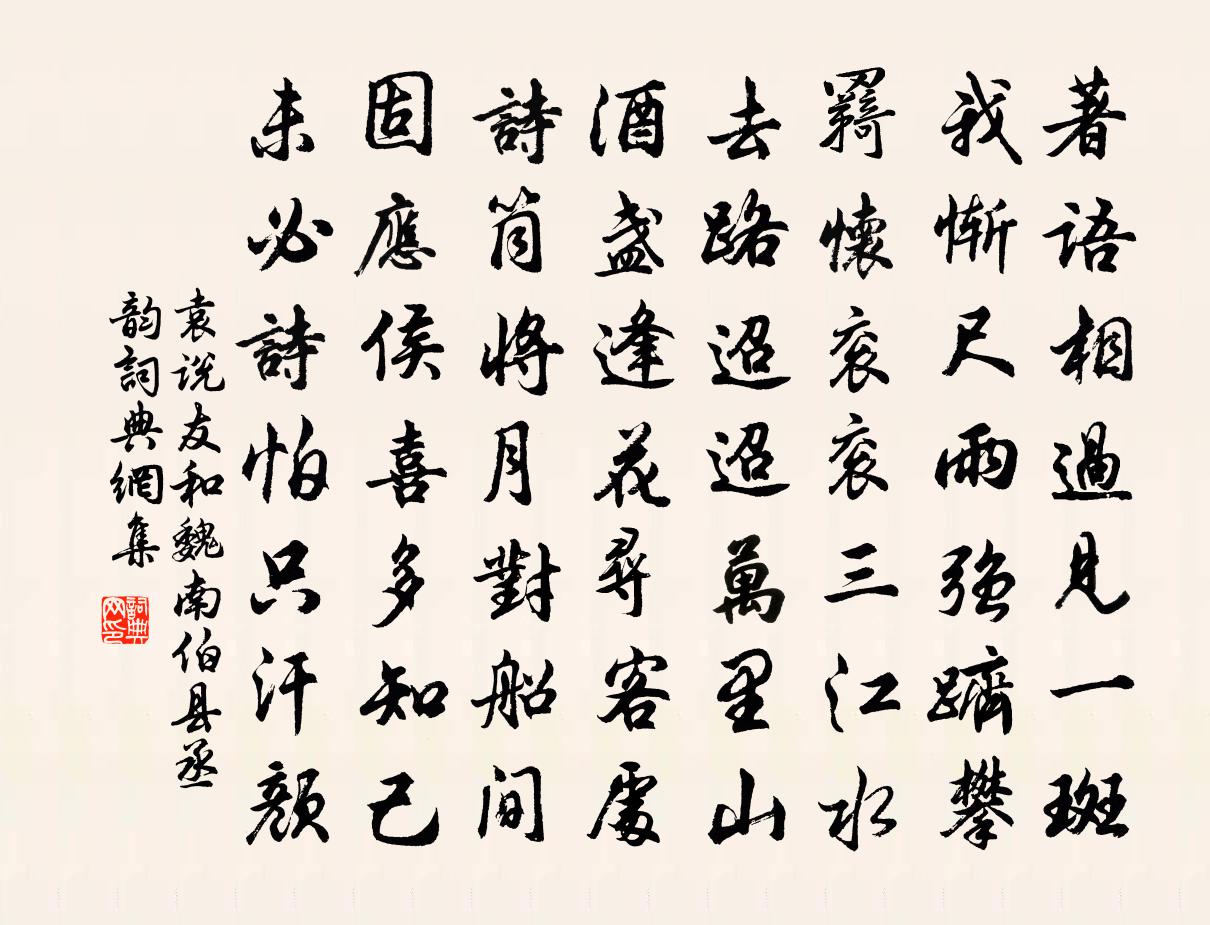 詩詞名句歷史字典書法欣賞書法字典國語詞典說文解字康熙字典古漢語字典標 題 作 者 詩 句 和魏南伯縣丞韻作者:袁說友 朝代:宋代和魏南伯縣丞韻原文著語相過見一斑,我慚尺雨強躋攀。羇懷袞袞三江水,去路迢迢萬里山。酒盞逢花尋客處,詩筒將月對船間。固應侯喜多知己,未必詩怕只汗顏。詩詞問答問:和魏南伯縣丞韻的作者是誰?答:袁說友問:和魏南伯縣丞韻寫於哪個朝代?答:宋代袁說友和魏南伯縣丞韻書法欣賞和魏南伯縣丞韻書法作品詩詞推薦子華兄生日五首韓維〔宋代〕秀眉華發貌安和,五福於今得最多。諸聖共忘心外境,八仙同入飲中歌。鼓笛慢歐陽修〔宋代〕縷金裙窣輕紗,透紅瑩玉真堪愛。多情更把,眼兒斜盼,眉兒斂黛。舞態歌闌,困偎香臉,酒紅微帶。便直饒、更和林尚善讀子云傳夢得詩韻李洪〔宋代〕尚白寧堪眾楚咻,井湄瓶碎愈增愁。後人歸罪美新作,莫污蕭郎文選樓。定風波黃庭堅〔宋代〕把酒花前欲問溪。問溪何事晚聲悲。名利往來人盡老。誰道。溪聲今古有休時。且共玉人斟玉醑。休訴。笙歌一曲大水寓武信二首李石〔宋代〕前時布穀鳴,早種不入土。翻然變陰沴,兩旬作淫雨。半夜水囓堤,一決不及御。貧民無燈火,下應酬已沒股。曉畫真來嵩梅堯臣〔宋代〕廣陵太守歐陽公,令爾畫我憔悴容。便傳仿佛在縑素,只欠勁直藏心胸。與我貨布不肯受,此之醫卜曾非庸。公今緣識宋太宗〔宋代〕逍遙物外未曾拋,念誦時將玉磬敲。雖不臨壇深發願,夢魂常憶大仙教。句釋曉瑩〔宋代〕談笑會當同。子禮和道者寮古詩復遣一絕鄭剛中〔宋代〕蒼璧方漸白鹿皮,瓊瑤更似木瓜詩。從來持得吟詩戒,此是愚翁破戒時。水心先生墓下作王汶〔宋代〕排雲止殊庭,備物儼神道。含酸步逶迤,積疹思遐漂。乘風來帝旁,駕說落窮島。百聖集會期,萬化資斧藻。瞻前次俞秀老韻王安石〔宋代〕解我蔥珩脫孟勞,暮年甘與子同袍。新詩比舊增奇峭,若許追攀莫太高。戲簡朱公武劉邦直田子平五首黃庭堅〔宋代〕朱公趨朝瘦至骨,歸來豪健踞胡床。日看省曹閽者面,何如田家侍兒妝。賢者之孝二百四十首原涉林同〔宋代〕所當約於已,豈忍儉其先。道立南陽表,人呼原氏阡。送呂周輔宗丞守崇慶樓鑰〔宋代〕舊矣唐安郡,龍潛府號新。當年一絳帳,今日兩朱輪。民意來何暮,仁聲暖似春。劍南毋戀卻,鰲禁要詞人。擬古黃庚〔宋代〕驪龍有明珠,奇氣久磅礴。一為鮫人采,夜半泣海若。到寶諒難得,珍藏思遠托。如何賤所貴,用之以彈雀,彈雀詠素蝶詩劉孝綽〔南北朝〕隨蜂繞綠蕙,避雀隱青薇。映日忽爭起,因風乍共歸。出沒花中見,參差葉際飛。芳華幸勿謝,嘉樹欲相依。和靈隱長老頌宋理宗〔宋代〕欲言心佛難分別,俱是精微無礙通。跳出千重縛不住,天涯海角任西風。題太原能判楊郎中新買水北園司馬光〔宋代〕洛陽名完不勝紀,門巷相連如櫛齒。修竹長楊深徑迂,令人邑邑氣不舒。愛君買園中橋北,堂壓崖端跨空碧。滿川再游蔣山李流謙〔宋代〕系馬松門竟日留,一燈深殿炯清幽。杖頭猶識齊梁讖,屐齒曾經王謝游。瑟瑟新毛吃老樹,娟娟眯目破紅榴。風鈴寄題真愛堂三首裘萬頃〔宋代〕真實愛山今有誰,此心猨鶴亦難欺。看來卻是朱居士,不愧昌黎五字詩。名句推薦一江煙水照晴嵐,兩岸人家接畫檐,芰荷叢一段秋光淡張養浩《水仙子·詠江南》 無冥冥之志者,無昭昭之明;無惛惛之事者,無赫赫之功。荀子《荀子·勸學》 千門萬戶曈曈日,總把新桃換舊符。王安石《元日》 碧水丹山映杖藜,夕陽猶在小橋西。沈周《題畫》 一寸相思一寸灰。蘇軾《南鄉子·集句》 灞橋煙柳,曲江池館,應待人來。陸游《秋波媚·七月十六日晚登高興亭望長安南山》 曉戰隨金鼓,宵眠抱玉鞍。李白《塞下曲六首·其一》 接天蓮葉無窮碧,映日荷花別樣紅。楊萬里《曉出淨慈寺送林子方》 茅檐長掃淨無苔,花木成畦手自栽。王安石《書湖陰先生壁》 劍河風急雪片闊,沙口石凍馬蹄脫。岑參《輪台歌奉送封大夫出師西征》