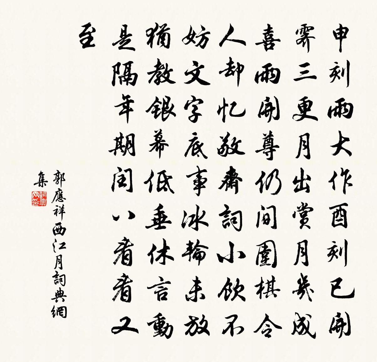 詩詞名句歷史字典書法欣賞書法字典國語詞典說文解字康熙字典古漢語字典標 題 作 者 詩 句 西江月作者:郭應祥 朝代:宋代西江月原文申刻雨大作,酉刻已開霽,三更月出。賞月幾成喜雨,開尊仍間圍棋。令人卻憶敬齋詞。小飲不妨文字。底事冰輪未放,猶教銀幕低垂。休言動是隔年期。閏八看看又至。|<是歲有閏中秋。>|詩詞問答問:西江月的作者是誰?答:郭應祥問:西江月寫於哪個朝代?答:宋代郭應祥西江月書法欣賞西江月書法作品詩詞推薦車浮蘇轍〔宋代〕寒魚得汕便為家,兩兩方舟載小車。謀食旋遭芳餌誤,求安仍值積薪遮。情存未免人先得,欲盡要令物莫加。身似和徐伯遠無為道中王之道〔宋代〕江南五月稻抽芒,想見含花帶露香。底事淮鄉太遲晚,一犁新雨正開荒。嘉川道中寄周正孺文同〔宋代〕草木春深後,山川雨過時。清佳常滿目,衰倦敢忘詩。好尚舊若此,飄零今比誰。爭如畫堂上,日日聽新詞。謝程帥袁制使陳造〔宋代〕一編用劉漢,誰似進履生。同吟謝世書,我嘗羨彌明。昭文倦袖手,此曲寧虧成。屠龍與澼洸,付渠自重輕。柳梢青(黃杷林送李粹伯)趙師俠〔宋代〕料峭余寒。元宵欲過,燈火闌珊。宿酒難醒,新愁未解,搖兀吟鞍。深林百舌關關。更雨洗、桃紅未乾。野燒痕青寄曹南任懶夫林逋〔宋代〕關門卻坐忘,一燼隱居香。午瀨懷泉瀑,秋耕負曉岡。道深玄草在,貧久褐衣荒。料得心交者,微吟為楚狂。三婦詞楊維楨〔元代〕大婦善主饋,甘旨出中廚。中婦善調箏,清歌似羅敷。小婦似小喬,中夜讀兵書。丈人不復樂,起起去防胡。驀山溪王哲〔元代〕一靈真性,二物包囊定。三寸主人翁,四方游、各來邀請。五情六*,七窮總相連,八山聳,九宮深,十地如何證何子楚為范明倫賦九疑石石吾不及見也讀詩可沈與求〔宋代〕峨弁千峰倚天碧,上有修筠材可篴。月明三弄面巉岩,驚起哀猿啼峭壁。兒童斲石攢青瑤,寒林蕭蕭吹墮樵。坐令次韻陸務觀送行二首周必大〔宋代〕議論今誰及,詞章更可宗。三年依玉樹,一別送塵容。盡日尋山寺,思君傍塞烽。五言何敢續,持用當緘封。次韻子濟兄送行李洪〔宋代〕春草年年愁望勻,鴒原鼎足嘆離分。惡詩恨別江南社,駑馬慚辭冀北群。細雨催行將食冷,片帆歸省待風薰。贈言宮詞宋白〔宋代〕殿角風琴細韻移,燭台春幸翰林時。三更向盡諸宮閉,猶在金鑾夜賦詩。林少朋輓詞三首林亦之〔宋代〕聞說當年歌鹿鳴,黃花八月牡丹生。何人為續夷堅志,好向橋東問姓名。寓興皎然〔唐代〕天下生白榆,白榆直上連天根。高枝不知幾萬丈,世人仰望徒攀援。誰能上天采其子,種向人間笑桃李。因問老仙思高人張椿齡〔宋代〕仙人昔是瑤池客,佩玉鳴鑾生羽翮。騎鯨千載說白雲,弱水三萬那可隔。蓬瀛深處乃其家,無限真仙衣絳霞。相呼雲溪雜詠郭印〔宋代〕虛舟橫沼面,窗戶四玲瓏。絳宇三山上,青天一鏡中。夜深楊柳月,日永芰荷風。公退渾無事,江湖興莫窮。久擬重陽一登龍山以荒榛峭壁無容足之地欲訪吳芾〔宋代〕宦情一似秋容薄,歸興渾如酒味濃。台上望鄉何處是,夕陽影里暮山重。送范二丈入藍田書院二首裘萬頃〔宋代〕今代崔斯立,才高不負丞。君方為重客,人謂得良朋。敏捷朝千字,辛勤夜一燈。明年冠秋試,萬里看飛騰。聞官軍破吉浪戎小而固慮史氏遺忽因記為二章薛能〔唐代〕一戰便抽兵,蠻孤吉浪平。通連無舊穴,要害有新城。晝卒烽前寢,春農界上耕。高樓一擬望,新雨劍南清。瀘水酬姜堯章范成大〔宋代〕鵝鶩聲暗雪意豪,直前不憚夜行勞。更能櫜鞬尊裴度,千古人知李愬高。名句推薦日長睡起無情思,閒看兒童捉柳花。楊萬里《閒居初夏午睡起》 半生已分孤眠過,山枕檀痕涴。納蘭性德《虞美人·曲闌深處重相見》 友者、所以相有也。道不同,何以相有也?荀子《荀子·大略》 群雞正亂叫,客至雞鬥爭。杜甫《羌村三首·其三》 無可奈何花落去,似曾相識燕歸來。晏殊《浣溪沙·一曲新詞酒一杯》 毛羽未成,不可以高蜚司馬遷《史記·蘇秦列傳》 君子時詘則詘,時伸則伸也。荀子《荀子·仲尼》 白日放歌須縱酒,青春作伴好還鄉。杜甫《聞官軍收河南河北》 梅片作團飛,雨外柳絲金濕。雷應春《好事近·梅片作團飛》 漢兵已略地,四方楚歌聲。虞姬《和項王歌》