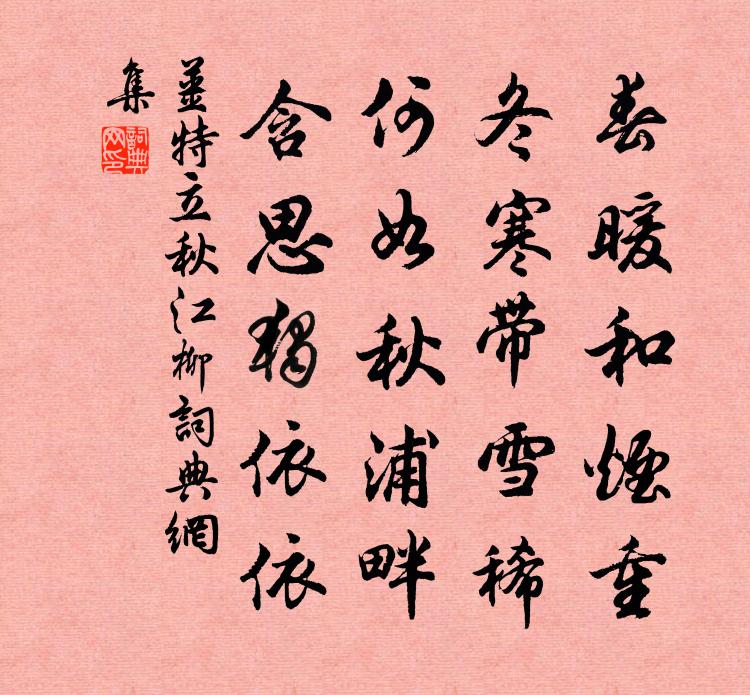 詩詞名句歷史字典書法欣賞書法字典國語詞典說文解字康熙字典古漢語字典標 題 作 者 詩 句 秋江柳作者:姜特立 朝代:宋代秋江柳原文春暖和煙重,冬寒帶雪稀。何如秋浦畔,含思獨依依。詩詞問答問:秋江柳的作者是誰?答:姜特立問:秋江柳寫於哪個朝代?答:宋代姜特立秋江柳書法欣賞秋江柳書法作品詩詞推薦紹興乙卯張安國為右史明清與仲信兄梁舉善郭王明清〔宋代〕淒涼寶鈿初分際,愁絕清光欲破時。留與人間作佳話,綠窗瓊戶老蛛絲。岳鄂王墓徐集孫〔宋代〕古木號風抱不平,百年忠義日爭明。墳前人馬空存石,何似當時聽用兵。為師席李上捨去智壽四首衛涇〔宋代〕屢將大手占倫魁,槐市英聲早四馳。肯與鱣魴爭尺水,鵾鵬行矣化天池。出境游山二首王勃〔唐代〕源水終無路,山阿若有人。驅羊先動石,走兔欲投巾。洞晚秋泉冷,岩朝古樹新。峰斜連鳥翅,磴疊上魚鱗。化鶴宣公祠李曾伯〔宋代〕公不生唐世,貞元事若何。主恩思報切,臣罪忤時多。佞舌攻何忍,剛腸死不磨。倚蘭凝佇久,一鷺點滄波。悼亡九首張耒〔宋代〕欲治煩惱更無方,只有頭陀理最長。不待存亡始知夢,故應交臂已淒涼。妾薄命王銍〔宋代〕寒閨有靜女,十載念遠征。命似絳綃薄,身同朝露輕。存心合歡綺,待得機杼成。從來君獨賞,詎可賣都城。憑夢詠貴游姚合〔唐代〕貴游多愛向深春,到處香凝數里塵。紅杏花開連錦障,綠楊陰合拂朱輪。鳳凰尊畔飛金盞,絲竹聲中醉玉人。日暮過五丈原 / 經五丈原溫庭筠〔唐代〕鐵馬雲雕久絕塵,柳營高壓漢營春。天清殺氣屯關右,夜半妖星照渭濱。下國臥龍空寤主,中原逐鹿不由人。象床點絳唇 春夢吳存〔元代〕多事春風,年年綠遍江南草。羅裙色好。莫把相如惱。夢入瑤台,搔背 * 爪。還驚覺。杜鵑啼早。一夜相思老。宮詞王仲修〔宋代〕雲羅霧谷曉風涼,繡幕黃龍繞畫廊。宿雨乍收煙水靜,曲池萬柄綠荷香。太常引 送段信卿拜河東憲司經歷王惲〔元代〕北來孤劍*蒼顏。聽時事,立談閒。秋隼正騰翻。莫便倚、霜空陡寒。太行秋色,汾川雁影,極目送歸鞍。簿領*偈頌八十七首釋慧開〔宋代〕今朝三月初十,擊鼓禪徒畢集。欲知時節因緣,雨落階頭便濕。會即各自歸堂,不地何勞久立。蝶戀花·儂是江南遊冶趙孟頫〔元代〕儂是江南遊冶子,烏帽青鞋,行樂東風裡。落盡楊花春滿地,萋萋芳草愁千里。扶上蘭舟人慾醉,日暮青山,相映慈恩寺殘春耿湋〔唐代〕雙林花已盡,葉色占殘芳。若問同遊客,高年最斷腸。酹江月(送周舜美)葛長庚〔宋代〕道人於世,已忘情、尚更區區餞別。棲碧先生辭蕙帳,夜夜猿聲淒切。劍上星寒,琴中風慘,眉宇飛黃色。一杯判送密秀才吏部駁放後歸蜀,應崔大理序權德輿〔唐代〕蜀國本多士,雄文似相如。之子西南秀,名在賢能書。薄祿且未及,故山念歸歟。迢迢三千里,返駕一羸車。玉壘送別王維〔唐代〕下馬飲君酒,問君何所之。君言不得意,歸臥南山陲。但去莫復問,白雲無盡時。送鄉友歸釋文珦〔宋代〕青春欲盡時,鳥啼花亂飛。共起思鄉恨,君歸吾未歸。臨分重執手,老淚涇荷衣。贈婦詩秦嘉〔兩漢〕皇靈無私親,為善荷天祿。傷我與爾身,少小罹煢獨。既得結大義,歡樂苦不足。念當遠離別,思念敘款曲。河廣名句推薦力微休負重,言輕莫勸人。佚名《增廣賢文·上集》 水遠煙微,一點滄洲白鷺飛歐陽修《採桑子·何人解賞西湖好》 三月休聽夜雨,如今不是催花。張炎《清平樂·采芳人杳》 想當年、空運籌決戰,圖王取霸無休。柳永《雙聲子·晚天蕭索》 昔日芙蓉花,今成斷根草。李白《妾薄命》 青女素娥俱耐冷,月中霜里斗嬋娟。李商隱《霜月》 直須看盡洛城花,始共春風容易別。歐陽修《玉樓春·尊前擬把歸期說》 家有千口,主事一人。佚名《增廣賢文·下集》 一人飛升,仙及雞犬。蒲松齡《聊齋志異·卷四·促織》 相思處、青年如夢,乘鸞仙闕。文天祥《滿江紅·和王夫人滿江紅韻以庶幾後山妾薄命之意》