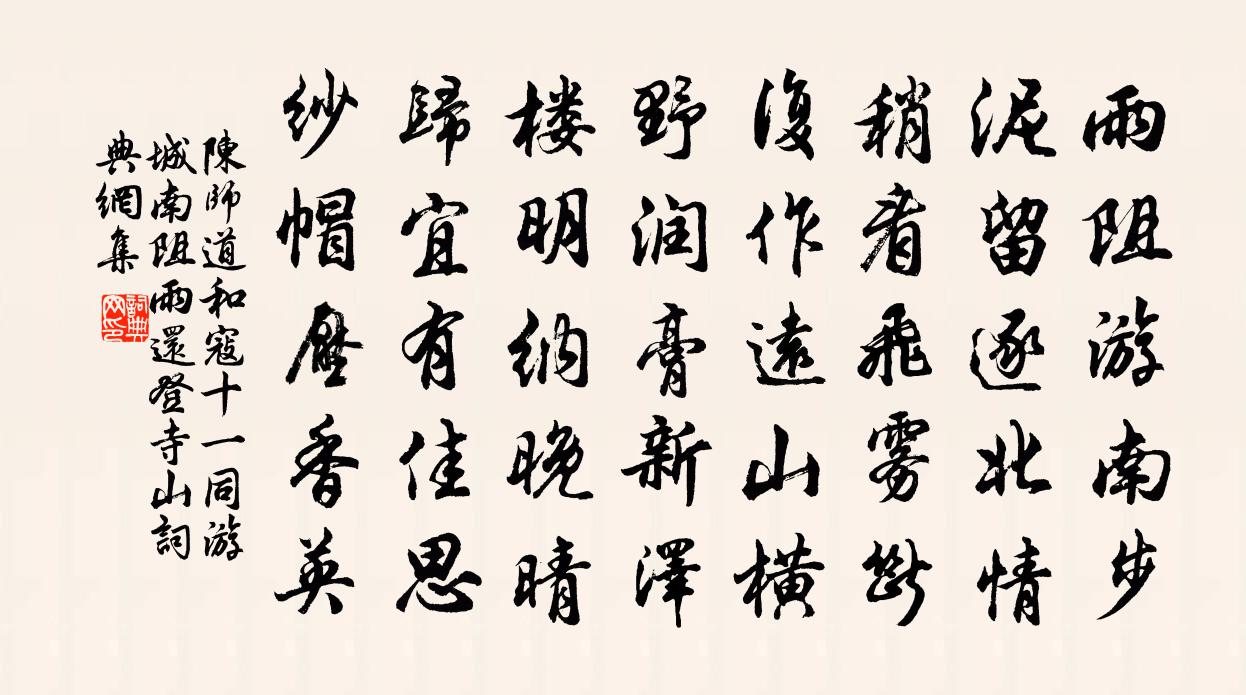詩詞名句歷史字典書法欣賞書法字典國語詞典說文解字康熙字典古漢語字典標 題 作 者 詩 句 和寇十一同游城南阻雨還登寺山作者:陳師道 朝代:宋代原文雨阻游南步,泥留逐北情。稍看飛霧斷,復作遠山橫。野潤膏新澤,樓明納晚晴。歸宜有佳思,紗帽壓香英。詩詞問答問:《和寇十一同游城南阻雨還登寺山》的作者是誰?答:陳師道問:該詩寫於哪個朝代?答:宋代問:陳師道的名句有哪些?答:陳師道名句大全書法欣賞和寇十一同游城南阻雨還登寺山書法作品詩詞推薦櫻桃楊億〔宋代〕離宮時薦罷,樂府艷歌新。石髓凝秦洞,珠胎剖漢津。三桃聊並列,百果獨先春。清籞來君賜,雕盤助席珍。甘餘次韻王彥昭感秋三首張耒〔宋代〕塵埃容易點吳衣,澤國秋來信息稀。想見淮南初木落,秋雲秋水雁初飛。次韻子瞻系御史獄賦獄中榆槐竹柏 槐蘇轍〔宋代〕盛衰日相尋,循環何曾歇。攀條攬柔荑,回首驚脫葉。綠槐陰最厚,零落今存莢。千林一枯槁,平地三尺雪。草木次韻仲明舉西郊別墅郭印〔宋代〕我聞修竹陰,清邃不受暑。安得十畝餘,其中創幽墅。日長惟鳥聲,晝靜無人語。習習來微風,蕭蕭墮寒雨。呼兒東齋雜書陸游〔宋代〕門低不通車,室隘劣容膝。掩脛無全衣,作字用挫筆。親朋孰可望,門內自相恤。一笑語吾兒,汝馭未須叱。移住別友羅隱〔唐代〕自到西川住,惟君別有情。常逢對門遠,又隔一重城。浣溪沙佚名〔宋代〕遍地輕陰綠滿枝。乍晴初試袷羅衣。東風院落日長時。鸂鶒池邊飛燕子,海棠花里鬧蜂兒。一春心事只春知。永王東巡歌十一首李白〔唐代〕永王正月東出師,天子遙分龍虎旗。樓船一舉風波靜,江漢翻為雁鶩池。三川北虜亂如麻,四海南奔似永嘉。但用蝶戀花 又次前韻劉敏中〔元代〕簾底青燈簾外雨。酒醒更闌,寂寞情何許。腸斷南園回首處。月明花影閒朱戶。聽徹樓頭三疊鼓。題遍雲箋,總是紬史蘇籀〔宋代〕延陵皋壤決歸歟,習氣過憂觚不觚。何怪倚門嗟抗髒,近來合樂寵侏儒。過關自欲聞雞唱,居肆何須較馬摸。乖合陳正叔縣尉見示所著詩文以詩謝之孫應時〔宋代〕文章千古一毫端,妙處工夫到底難。春色無邊知造化,海風不斷識婆瀾。看君健筆凌霄漢,照我清窗醒肺肝。寶劍鵲橋仙(□□立春)郭應祥〔宋代〕泥牛擊罷,銀幡卸了,又是一番春至。有人耳畔語低低,道宜入、新年吉利。堆盤紅縷,浮杯綠蟻,自有及時風味憶別張載〔宋代〕柳絮飛時與君別,南樓把酒看明月。月似當年離別時,柳絮如君何處飛。千書百書要相就,思君不見令人瘦。念君上湖廣總領趙郎中曹彥約〔宋代〕總角為兒百未更,已陪先進識項名。慣聞似覺雄風近,因問從知看日明。千里未迎天子詔,一同先說長官清。吏師大暑同蔣明亞叟熙載夜登清微亭傅察〔宋代〕土潤伏新金,陽歊困亭午。曦御駐片驂,朱光徹厚土。鳥雀噪階除,蛙蚓鳴草莽。簿領抗塵容,茅檐庇環堵。蜂蠆送喻鍊師歸茅山李建勛〔唐代〕休糧知幾載,臉色似桃紅。半醉離城去,單衣行雪中。水聲茅洞曉,雲影石房空。莫學秦時客,音書便不通。青玉案毛滂〔宋代〕今宵月好來同看。月未落、人還散。把手留連簾兒畔。含羞和恨轉嬌盼。恁花映春風面。相思不用寬金釧。也不用寄南劍守陳寺丞宿王邁〔宋代〕復齋出守劍津時,正直清廉真吏師。遣愛昔嘗垂竹帛,徽音今又嗣塤篪。侯能培植基棠茇,我欲摩挲常萼碑。千載送李尚書赴襄陽八韻得長字韓愈〔唐代〕帝憂南國切,改命付忠良。壤畫星搖動,旗分獸簸揚。五營兵轉肅,千里地還方。控帶荊門遠,飄浮漢水長。賜書山居雜詩九十首曹勛〔宋代〕台山無牡丹,單葉已最貴。斗檻數花爾,便欲發光氣。珍重莫肯折,如天藏地秘。西都每興懷,此賞殆夢寐。名句推薦攀荷弄其珠,蕩漾不成圓。李白《折荷有贈》 花開不並百花叢,獨立疏籬趣未窮。鄭思肖《畫菊》 辛勤三十日,母瘦雛漸肥。白居易《燕詩示劉叟》 莫笑賤貧夸富貴,共成枯骨兩何如?白居易《放言五首·其四》 傷心莫語,記那日旗亭,水嬉散盡,中酒阻風去。納蘭性德《摸魚兒·午日雨眺》 車遙遙兮馬洋洋,追思君兮不可忘。傅玄《車遙遙篇》 秋色雁聲愁幾許,都在斜陽。吳文英《浪淘沙·九日從吳見山覓酒》 鵬北海,鳳朝陽。辛棄疾《鷓鴣天·送廓之秋試》 恨無千日酒,空斷九迴腸。劉彤《臨江仙·千里長安名利客》 長使英雄淚滿襟,天意高難問。楊冠卿《卜運算元·秋晚集杜句吊賈傅》