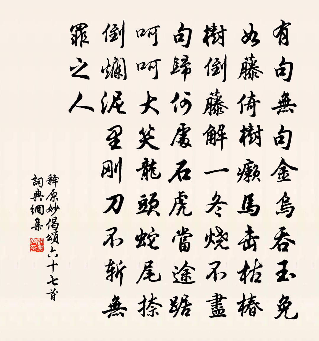 詩詞名句歷史字典書法欣賞書法字典國語詞典說文解字康熙字典古漢語字典標 題 作 者 詩 句 偈頌六十七首作者:釋原妙 朝代:宋代偈頌六十七首原文有句無句,金烏吞玉免。如藤倚樹,癩馬擊枯椿。樹倒藤解,一冬燒不盡。句歸何處,石虎當途踞。呵呵大笑,龍頭蛇尾。捺倒爛泥里,剛刀不斬無罪之人。詩詞問答問:偈頌六十七首的作者是誰?答:釋原妙問:偈頌六十七首寫於哪個朝代?答:宋代釋原妙偈頌六十七首書法欣賞偈頌六十七首書法作品詩詞推薦待青城道人不至陸游〔宋代〕我亦從來薄世緣,偶然採藥到西川。慵追萬里騎鯨客,且伴千年化鶴僊。金鼎養丹暾海日,玉壺取酒醉江天。朝來菩薩蠻(湖光亭晚集)葉夢得〔宋代〕平波不盡蒹葭遠。清霜半落沙痕淺。煙樹晚微茫。孤鴻下夕陽。梅花訊息近。試向南枝問。記得水邊春。江南別後存養堂為汪叔潛作陸游〔宋代〕絳帳先生見處別,少年立節如冰雪。胸中凜凜萬卷書,一字不為庸人說。存心養性以事天,人知不知渠晏然。窮經自安仁至豫章途中雜興十九首趙蕃〔宋代〕郡邑貪殘固合誅,釁端繇爾復何如。官軍可怖無輕敵,直恐微軀不足鋤。答頤齋詩筒走寄胡仲弓〔宋代〕剪燭西窗聽雨聲,曉天又弄半陰晴。黃金塢里知無分,紫翠樓前忍負盟。君有磚花占日影,我慚瓦釜答雷鳴。今朝浣溪沙陳允平〔宋代〕一枕華胥夢不成。碧筒香潤玉醪傾。日長花影過池亭。雪藕臂寒鸚較怯,采菱歌發鷺頻驚。白苹洲上雨初晴。奉和聖制送不蒙都護兼鴻臚卿歸安西應制王維〔唐代〕上卿增命服,都護揚歸旆。雜虜盡朝周,諸胡皆自鄶。鳴笳瀚海曲,按節陽關外。落日下河源,寒山靜秋塞。萬方題壽星寺杯泉胡仲弓〔宋代〕勺水原來亦自多,便盈科後要如何。老龍豈是杯中物,放出長江與大河。無題盧綸〔唐代〕恥將名利託交親,只向尊前樂此身。才大不應成滯客,時危且喜是閒人。高歌猶愛思歸引,醉語惟夸漉酒巾。□□蔡知縣小庵釋宗杲〔宋代〕此庵非小亦非大,堪笑石送空捏怪。不知法界鄧此庵,強謂此庵含法界。而今欲識住庵人,萬象這中獨露身。妙喜歲除即事十首劉克莊〔宋代〕聽得先生去,拋書喜欲顛。吾聞渥窪種,墮地不須鞭。宮詞宋白〔宋代〕白蓮亭下柳垂絲,正是春波涮馬時。宮女隔花相倚看,如龍步驟出漣漪。賀新涼/賀新郎林正大〔宋代〕蘭亭當日事。有崇山、茂林修竹,群賢畢至。湍急清流相映帶,旁引流觴曲水。但暢敘、幽情而已。一詠一觴真足東陽道中二首葛紹體〔宋代〕麥隴東風半展須,桃紅柳綠自相於。耕犂歇午炊煙起,斷岸溪頭人釣魚。瑞鶴仙 壽丘提刑方岳〔宋代〕一年寒盡也。問秦沙、梅放未也。幽尋者誰也。有何郎佳約,歲雲除也。南枝暖也。正同雲、商量雪也。喜東皇,詩阮瑀〔魏晉〕四皓隱南嶽。老萊竄河濱。顏回樂陋巷。許由安賤貧。伯夷餓首陽。天下歸其仁。何患處貧苦。但當守明真。侍宴御樓孫何〔宋代〕突兀毬場錦繡峰,遊人士女擁千重。月離雲海飛金鏡,燈射冰簾掣火龍。絕句二首蘇軾〔宋代〕漠漠秋高露氣清,新蒲倚石近溪生。夜來雨後西風急,靜向窗前似有聲。興元府園亭雜詠棋軒文同〔宋代〕北城雲最高,上復有喬木。垂蘿密如帳,中乃營小屋。時引方外人,百憂銷一局。元豐己未三院東閣作己未九月予赴鞫御史聞蘇頌〔宋代〕源流同是子卿孫,公自多才我寡聞。謬見推稱丈人行,應緣舊熟秘書君。文章高絕誠難敵,聲氣相求久益勤。莫為名句推薦推手遽止之,濕衣淚滂滂韓愈《聽穎師彈琴》 夢斷香消四十年,沈園柳老不吹綿。陸游《沈園二首》 千人之諾諾,不如一士之諤諤。司馬遷《史記·商君列傳》 匈奴草黃馬正肥,金山西見煙塵飛,漢家大將西出師。岑參《走馬川行奉送出師西征 / 走馬川行奉送封大夫出師西征》 十年一覺揚州夢,贏得青樓薄倖名。杜牧《遣懷》 春色滿園關不住,一枝紅杏出牆來。葉紹翁《遊園不值》 塵緣一點,回首西風又陳跡。吳文英《六么令·夷則宮七夕》 數叢沙草群鷗散,萬頃江田一鷺飛。溫庭筠《利州南渡》 時人不識農家苦,將謂田中谷自生。顏仁郁《農家》 芳林新葉催陳葉,流水前波讓後波。劉禹錫《樂天見示傷微之敦詩晦叔三君子皆有深分因成是詩以寄》