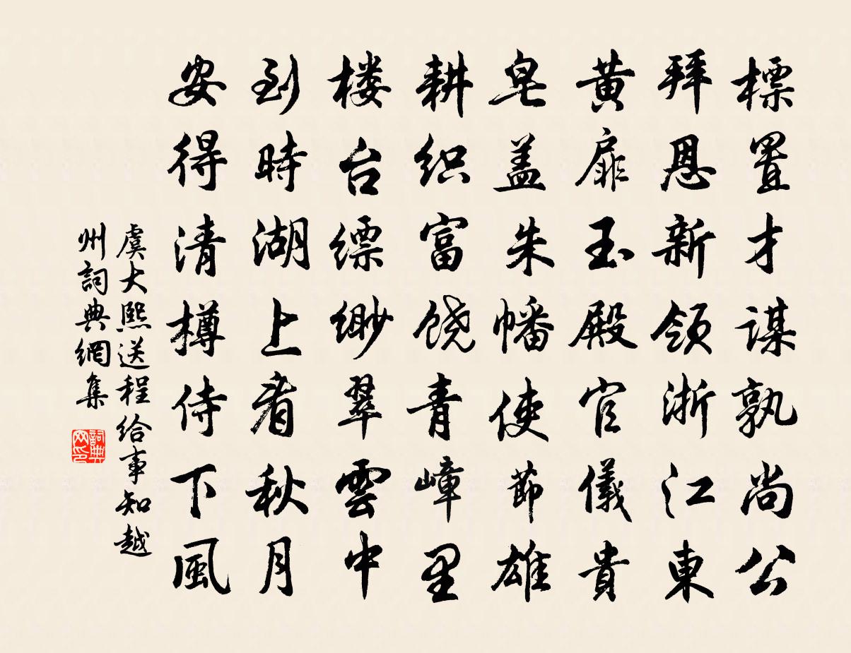 詩詞名句歷史字典書法欣賞書法字典國語詞典說文解字康熙字典古漢語字典標 題 作 者 詩 句 送程給事知越州作者:虞大熙 朝代:宋代送程給事知越州原文標置才謀孰尚公,拜恩新領浙江東。黃扉玉殿官儀貴,皂蓋朱幡使節雄。耕織富饒青嶂里,樓台縹緲翠雲中。到時湖上看秋月,安得清樽侍下風。詩詞問答問:送程給事知越州的作者是誰?答:虞大熙問:送程給事知越州寫於哪個朝代?答:宋代虞大熙送程給事知越州書法欣賞送程給事知越州書法作品詩詞推薦瑤台聚八仙/新雁過妝樓張炎〔宋代〕老圃堪嗟。深夜雨、紫英猶傲霜華。暖宿籬根,飛去想怯寒沙。採摘浮杯如戲水,晚香淡似夜來些。背風斜。翠苔至日記見簡輔漢卿二首敖陶孫〔宋代〕滿窗晴旭散輕埃,報答生成只酒杯。篇什正須今日用,歲時偏傍俗人來。輕舠上藕泥初拭,小巷爭魚臭不開。試作詩酒吟邵雍〔宋代〕聖人難處口能宣,何止千年與萬年。心靜始能知白日,眼明方會看青天。鬼神情狀將詩寫,造化功夫用酒傳。傳寫雪中望岱嶽施閏章〔清代〕碧海煙歸盡,晴峰雪半殘。冰泉懸眾壑,雲路郁千盤。影落齊燕白,光連天地寒。秦碑凌絕壁,杖策好誰看?八月十四夜月范仲淹〔宋代〕光華豈不盛,賞宴尚遲遲。天意將圓夜,人心待滿時。已知千里共,猶訝一分虧。來夕如澄霽,清風不負期。題東平張智卿梅軒嘗以墨梅一幅自隨方回〔宋代〕大庾嶺頭江南北,生平走遍梅花國。天下梅花詩最難,和靖居士占第一。七十四翁詩萬篇,一句梅花吟不得。譬如贊三十六祖頌釋印肅〔宋代〕脅本號難生,泥牛入海耕。隨機千萬轉,無上亦無行。和謝虛谷孫嵩〔宋代〕窮愁幽思或成時,畦繞荒蕪失自治。秋氣居然寒宋玉,土風猶爾操鍾儀。安能跛鱉從天馬,正擬長松引菟絲。啟以頌古十六首釋明辯〔宋代〕我手何似佛手,黃龍鼻下無口。當時所見顢頇,至今百拙千醜。次韻張司法題鄭少尹庭下緋桃衛博〔宋代〕梅飄柳墜半春中,庭下緋英細作叢。刺眼定添新葉綠,傷心應似故園紅。玄都怨感塵事,石髓追游滿地風。報答春偈公六十五首釋鹹傑〔宋代〕賢劫千佛數,末後最殷勤。倒握降魔杵,高標利物拳。心肝無屈曲,腸胃有區分。神通願力雖無盡,且為山僧護法春病元稹〔唐代〕病來閒臥久,因見靜時心。殘月曉窗迥,落花幽院深。望山移坐榻,行藥步牆陰。車馬門前度,遙聞哀苦吟。九日登堯山書事夏竦〔宋代〕滿頭 * 鬢毛斑,曾議皇王對爾顏。今日臨風輕霸跡,堯山應合勝牛山。藍田溪上楊時〔宋代〕夾籬桃李趁溪斜,淺淺清流映落花。欲問武陵源上路,度雲穿石認胡麻。晉陰山廟馬之純〔宋代〕相君一日到郊坰,步騎俄逢十數兵。拂曉見來殊隱約,中宵夢此極分明。陰山血食當知我,晉帝南巡適從行。事既春日雜興王同祖〔宋代〕清明過了柳花飛,簾外萋萋草正肥。喚起惜春情緒處,空山殘月杜鵑啼。山僧雨中送牡丹王禹偁〔宋代〕數枝香帶雨霏霏,雨里攜來叩竹扉。擬戴卻休成悵望,御園曾插滿頭歸。故端明尚書汪公輓詞二首韓元吉〔宋代〕獻納高門地,君王識履聲。閩山歌惠政,蜀道憺威名。逝矣嗟天命,誰歟總國成。弟兄無六十,殄瘁亦堪驚。持課袁說友〔宋代〕夢接三乘境,乘勝一炷薰。風窗獨趺坐,鳥雀聽聲聞。目想金剛會,心存貝葉文。稍蠲煩惱毒,天雨看繽紛。獵犬行蘇拯〔唐代〕獵犬未成行,狐兔無奈何。獵犬今盈群,狐兔依舊多。自爾初跳躍,人言多拏躩。常指天外狼,立可口中嚼。骨長名句推薦同心一人去,坐覺長安空。白居易《別元九後詠所懷》 小快害義,小慧害道,小辨害治,苟心傷德。劉向《說苑·談叢》 獨舞紛如雪,孤飛曖似雲。陳子昂《詠主人壁上畫鶴寄喬主簿崔著作》 念月榭攜手,露橋聞笛。周邦彥《蘭陵王·柳》 淡淡梅花香欲染,絲絲柳帶露初乾。曹雪芹《香菱詠月·其二》 歲夜高堂列明燭,美酒一杯聲一曲。李頎《聽安萬善吹觱篥歌》 旋開旋落旋成空,白髮多情人更惜。司空圖《酒泉子·買得杏花》 和平處事,勿矯俗為高;正直居心,勿設機以為智。王永彬《圍爐夜話·第六五則》 未晚先投宿,雞鳴早看天。佚名《增廣賢文·上集》 誰憐散髻吹笙,天涯芳草關情。納蘭性德《清平樂·孤花片葉》