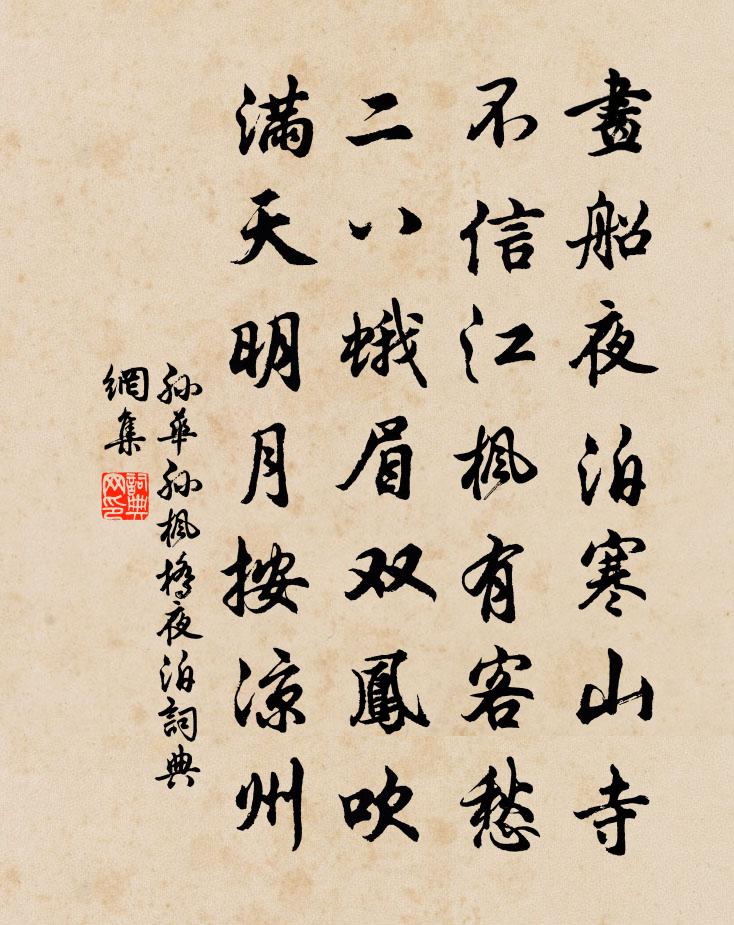 詩詞名句歷史字典書法欣賞書法字典國語詞典說文解字康熙字典古漢語字典標 題 作 者 詩 句 楓橋夜泊作者:孫華孫 朝代:元代楓橋夜泊原文畫船夜泊寒山寺,不信江楓有客愁。二八蛾眉雙鳳吹,滿天明月按涼州。詩詞問答問:楓橋夜泊的作者是誰?答:孫華孫問:楓橋夜泊寫於哪個朝代?答:元代孫華孫楓橋夜泊書法欣賞楓橋夜泊書法作品詩詞推薦送別皎然〔唐代〕聞說情人怨別情,霜天淅瀝在寒城。長宵漫漫角聲發,禪子無心恨亦生。綠萼梅范成大〔宋代〕朝罷東皇放玉鸞,霜羅薄袖綠裙單。貪看修竹忘歸路,不管人間日暮寒。山居詩釋延壽〔宋代〕言行相應宜此地,空談大隱也無端。升沈岐路非他得,生熟根機且自看。瞋火微煙還漸息,貪泉余潤亦消乾。平生頌釋慧遠〔宋代〕雪霽長空,迥野飛鴻。段雲片片,向西向東。題虞帝廟陳宗禮〔宋代〕南國薰風入帝歌,至今遺廟只嵯峨。一天曉色懷明哲,四野春光想太和。存古尚瞻虞袞冕,撫時幾換禹山河。海濱次韻楊彝甫見成甫裝褾舊書之什朱長文〔唐代〕儒者須看萬卷書,古人精博固難如。殘編莫惜裝褫費,舊跡堪鄰繕寫初。輕撥蠹蟲文未損,平齊緗帙架無虛。白頭偈頌一百零一首釋慧性〔宋代〕指天指地獨稱尊,攪動乾坤海岳昏。自從賺 * 無數,直至而今無腦門。滿江紅王居安〔宋代〕八十歸來,方岩下、幾竿修竹。柴門外,沙鋪軟路,水流清玉。栽接新來桃與李,安排舊日松和菊。過小橋、作個田園樂七首·其五王維〔唐代〕山下孤煙遠村,天邊獨樹高原。一瓢顏回陋巷,五柳先生對門。半塘范成大〔宋代〕柳暗閶門逗曉開,半塘塘下越溪回。炊煙擁柁船船過,芳草緣堤步步來。處士妻十首劉克莊〔宋代〕夫出隨羔雁,妻憂往不還。別詩真善謔,帝笑放歸山。多景樓眺望陳郁〔宋代〕江淮萬里天,歷歷在樓前。對景獨登覽,因思幾變遷。雲橫秋水外,鳥度夕陽邊。倦倚闌乾北。令人思黯然。句晃逈〔宋代〕夙駕都門曉,涼風苑樹秋。又題祤禪客龜峰圖王洋〔宋代〕不用丹青染素翰,疏煙分染碧雲端。一千里地鏡中鎮,三十六峰天半寒。巢露葉中呈物象,濾羅帶畔疊木巒。人間病起言懷孟郊〔唐代〕強行尋溪水,洗卻殘病姿。花景晼晚盡,麥風清泠吹。交道賤來見,世情貧去知。高閒思楚逸,澹泊厭齊兒。終伴點絳唇孫惔〔宋代〕煙洗風梳,司花先放江梅吐。竹村沙路。脈脈搖寒雨。醉魄吟魂,無著清香處。愁如縷。系春不住。又折冰枝去。浣溪沙佚名〔宋代〕水閣池亭自有涼。遊俠篇(一作俠客行)陳子良〔唐代〕洛陽麗春色,遊俠騁輕肥。水逐車輪轉,塵隨馬足飛。雲影遙臨蓋,花氣近薰衣。東郊鬥雞罷,南皮射雉歸。日暮偈頌一百二十三首釋普度〔宋代〕有主有賓,無疏無親。直饒七佛到來。各與三十拄杖,少喜多嗔。磨鐵羅漢贊釋了惠〔宋代〕磨礲分寸工夫,建立針鋒世界。尚欠些子合尖,且待石頭爛壞。名句推薦正西望長安,下見江水流。李白《秋浦歌十七首》 所謂敬天者,不獨嚴而有禮,當有其實。張廷玉《明史·本紀·卷三》 待到秋來九月八,我花開後百花殺。黃巢《不第後賦菊》 青衫匹馬萬人呼,幕府當年急急符。辛棄疾《送湖南部曲》 芳原綠野恣行事,春入遙山碧四圍。程顥《郊行即事》 鐵衣霜露重,戰馬歲年深。戎昱《塞下曲·其六》 積學以儲寶,酌理以富才劉勰《文心雕龍·神思》 壽酒還嘗藥,晨餐不薦魚。錢起《送外甥懷素上人歸鄉侍奉》 便做無情,莫也愁人苦朱淑真《蝶戀花·送春》 桐花半畝,靜鎖一庭愁雨。周邦彥《瑣窗寒·寒食》