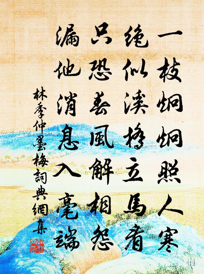 詩詞名句歷史字典書法欣賞書法字典國語詞典說文解字康熙字典古漢語字典標 題 作 者 詩 句 墨梅作者:林季仲 朝代:宋代墨梅原文一枝炯炯照人寒,絕似溪橋立馬看。只恐春風解相怨,漏他訊息入毫端。詩詞問答問:墨梅的作者是誰?答:林季仲問:墨梅寫於哪個朝代?答:宋代林季仲墨梅書法欣賞墨梅書法作品詩詞推薦三山即事龍昌期〔宋代〕百貨隨潮船入市,萬家沽酒市垂簾。蒼煙巷陌青榕老,白露園林紫蔗甜。大滌洞天留題彭大辯〔宋代〕松風到曉聲幽微,曲江漏盡天河低。平明遊子出門去,家住葛洪丹井西。句韋澳〔唐代〕莫將韋監同殷監,錯認容身是保身。贈嗣直弟頌十首黃庭堅〔宋代〕向上關捩子,未曾說似人。困來一覺睡,妙絕更通神。送五羊曾仲卿改秩受縣南歸曾豐〔宋代〕近派家於粵,初封國自鄫。要無非我族,終不是它曾。閱譜宗盟重,聯官事契增。居常多阻間,僅獲一瞻承。逆旅山居長孫佐輔〔唐代〕看書愛幽寂,結宇青冥間。飛泉引風聽,古桂和雲攀。地深草木稠,境靜魚鳥閒。陰氣晚出谷,朝光先照山。有時東池詩葉清臣〔宋代〕園林日將暮,緬懷池上酌。輕煙隱孤嶼,綠水搖虛閣。人閒山鳥靜,風餘岸花落。稚子晚盪歸,扁舟自飄泊。夕次洛陽道中崔塗〔唐代〕秋風吹故城,城下獨吟行。高樹鳥已息,古原人尚耕。流年川暗度,往事月空明。不復嘆岐路,馬前塵夜生。登普滿塔趙孟堅〔宋代〕海濱荒涼鬥豔地,古寺窣堵標蒼旻。三面黃茅連巨浸,突立嵯蛾超不群。可憐前此無管領,欄乾罩網蛛絲塵。相攜湘弦曲莊南傑〔唐代〕楚雲錚錚戛秋露,巫雲峽雨飛朝暮。古磬高敲百尺樓,孤猿夜哭千丈樹。雲軒碾火聲瓏瓏,連山卷盡長江空。鶯啼送項判官王安石〔宋代〕斷蘆洲渚落楓橋,渡口沙長過午潮。山鳥自呼泥滑滑,行人相對馬蕭蕭。十年長自青衿識,千里來非白璧招。握手簡江二十丈李處權〔宋代〕旅泊桐廬郡,溪山過所傳。稍寬遊子恨,知有丈人賢。水落魚蝦聚,林疏橘柚懸。淹留拚宿醉,臥扣月中船。和襄陽徐相公商賀徐副使加章綬王傳〔唐代〕朱紫聯輝照日新,芳菲全屬斷金人。華筵重處宗盟地,白雪飛時郢曲春。仙府色饒攀桂侶,蓮花光讓握蘭身。自憐送遵式師謁金陵王相國林逋〔宋代〕高牙熊軾隱鈴齋,棠樹陰濃長綠苔。丞相望尊寶謁少,清言應喜道人來。臨江仙·未遇行藏誰肯信侯蒙〔宋代〕未遇行藏誰肯信,如今方表名蹤。無端良匠畫形容。當風輕借力,一舉入高空。才得吹噓身漸穩,只疑遠赴蟾宮。丹陽語佚名〔唐代〕待錢來,待錢來。獻轉運副使太常李博士王禹偁〔宋代〕邦計動宸衷,時賢蒞浙東。量寬吞渤澥,氣直稟崆峒。捧詔瑤池下,辭班玉筍中。饋糧蕭相國,制禮叔孫通。舉措臨流郭印〔宋代〕長江一鏡淨,豈但燭鬚眉。清光瑩我心,雙鬢任如絲。鷗鷺近人來,游魚亦可窺。不把塵纓濯,身世兩相遺。好觀達磨贊釋紹曇〔宋代〕遠離竺國見梁王,五鬼臨身討苦噇。面面相看言不識,秋風一葦急橫江。秋霽曾紆〔宋代〕木落山明,暮江碧,樓倚太虛寥廓。素手飛觴,釵頭笑取,金英滿浮桑落。鬢雲慢約。酒紅拂破香腮薄。細細酌。名句推薦花滿渚,酒滿甌,萬頃波中得自由。李煜《漁父·一棹春風一葉舟》 楊柳絲絲弄輕柔,煙縷織成愁。王雱《眼兒媚·楊柳絲絲弄輕柔》 才過斜陽,又是黃昏雨。晏幾道《蝶戀花·笑艷秋蓮生綠浦》 梧桐更兼細雨,到黃昏、點點滴滴。李清照《聲聲慢·尋尋覓覓》 吞舟之魚,陸處則不勝螻蟻呂不韋《呂氏春秋·覽·審分覽》 人無千日好,花無百日紅。馮夢龍《醒世恆言·卷一》 若待上林花似錦,出門俱是看花人。楊巨源《城東早春》 好雨知時節,當春乃發生。杜甫《春夜喜雨》 雁起青天,數行書似舊藏處。吳文英《齊天樂·與馮深居登禹陵》 菀菀黃柳絲,濛濛雜花垂。常建《春詞二首》