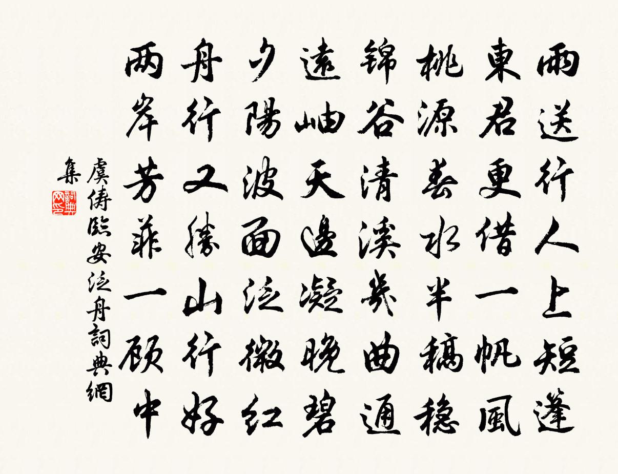 詩詞名句歷史字典書法欣賞書法字典國語詞典說文解字康熙字典古漢語字典標 題 作 者 詩 句 臨安泛舟作者:虞儔 朝代:宋代臨安泛舟原文雨送行人上短篷,東君更借一帆風。桃源春水半稿穩,錦谷清溪幾曲通。遠岫天邊凝晚碧,夕陽波面泛微紅。舟行又勝山行好,兩岸芳菲一顧中。詩詞問答問:臨安泛舟的作者是誰?答:虞儔問:臨安泛舟寫於哪個朝代?答:宋代虞儔臨安泛舟書法欣賞臨安泛舟書法作品詩詞推薦代郡齋神答樂天元稹〔唐代〕虛白堂神傳好語,二年長伴獨吟時。夜憐星月多離燭,日滉波濤一下帷。為報何人償酒債,引看牆上使君詩。漁具詩笭箵陸龜蒙〔唐代〕誰謂笭箵小,我謂笭箵大。盛魚自足餐,寘璧能為害。時將刷蘋浪,又取懸藤帶。不及腰上金,何勞問蓍蔡。鸚鵡曲 陸羽風流馮子振〔元代〕兒啼漂向波心住。捨得陸羽喚誰父。杜司空席上從容,點出茶甌花雨。散蓬萊兩腋清風,未便玉川仙去。待中泠一贈陳通妙胡仲弓〔宋代〕雙成親囑咐,從此厭塵緣。天上黃冠侶,人間紫府仙。金爐行殿曉,玉磬古壇煙。待得蟠桃熟,重逢又幾年。春日山中憶崔峒吉中孚(一作寄李舍人)盧綸〔唐代〕延步愛清晨,空山日照春。蜜房那有主,石室自無鄰。泉急魚依藻,花繁鳥近人。誰言失徒侶,唯與老相親。題唐察院詩卷二首劉克莊〔宋代〕不見林夫與子方,坦翁健筆亦堂堂。孝誠親有終身慕,忠愛君無一飯忘。銘座六章韋作佩,入台五字鐵為腸。未應偈頌一百六十首釋宗杲〔宋代〕這僧有頭無尾,明如有尾無頭。若人道得頭尾圓全句,雲門與爾拄杖了。挽趙秋曉李昌辰〔宋代〕諸老之中骨相奇,天胡遽使哲人萎。每懷釣月池邊樂,尚憶編茅亭下詩。隔面樹雲勞我夢,傷心薤露為君悲。典型亮禪人持缽求頌釋正覺〔宋代〕家林一錫飛,炊處青煙微。嚴默起禪板,虛通轉化機。溪寒秋染色,月冷夜流輝。莫學西山亮,此行宜早歸。木犀方岳〔宋代〕羽觴和月嚼冰黃,自笑詩腸老更剛。四出雪花些小大,五千書傳一齊香。君從底處移仙籍,日飲無何作醉鄉。風露上融堂呂人龍〔宋代〕直道人間未可孤,朝廷有意用真儒。故將能鑒煩司馬,不使春秋欠董狐。握節米豬高節不,盜名齊豹得名無。若商刺安南事詩懿宗朝舉〔唐代〕南荒不擇吏,致我交趾覆。聯綿三四年,致我交趾辱。懦者斗則退,武者兵益黷。軍容滿天下,戰將多金玉。颳得次韻趙公直題米元暉畫軸韓元吉〔宋代〕江南絕景賞心亭,臥雪難尋舊畫屏。白鷺洲前夜來雪,故應此畫勝丹青。四禽言梁棟〔宋代〕提葫蘆,年來酒賤頻頻沽。眾人皆醉我亦醉,哀哉誰問醒三閭。提葫蘆。戊申年七夕五絕薛映〔宋代〕月放冰輪傍絳河,丁期寶婺夜經過。嫦娥不惜宮中桂,乞與天香分外多。偶成鄭剛中〔宋代〕亂尋花木傍山栽,雖有此門未必開。過眼利名休挽我,年來心地已如灰。漁父陸游〔宋代〕食簞雖薄尚羹藜,且喜今朝酒價低。一棹每隨潮上下,數家相望埭東西。團團箬笠偏宜雨,策策芒鞋不怕泥。應笑乾藏釋普濟〔宋代〕惡語重重放出門,只圖一個不知恩。二千年事難遮覆,動便隨人腳後跟。種菜陸游〔宋代〕引水何妨蓺芥菘,圃功自古補三農。恨君不見岷山芋,藏蓄猶堪過歲凶。感皇恩王千秋〔宋代〕天氣過燒燈,初閒人倦。曉色曈曨繡簾卷。聚星歌扇,一簇雪香瓊軟。壽杯爭要把,從他滿。低低笑祝,年齡遐遠名句推薦水墨畫疏窗,孤影淡瀟湘。納蘭性德《木蘭花慢·立秋夜雨送梁汾南行》 青青河畔草,鬱郁園中柳。佚名《青青河畔草》 御羅屏底翻歌扇,憶西湖、臨水開窗。吳文英《風入松·桂》 洛陽城裡見秋風,欲作家書意萬重。張籍《秋思》 日暖桑麻光似潑,風來蒿艾氣如薰。蘇軾《浣溪沙·軟草平莎過雨新》 喜怒不形於色。房玄齡《晉書·列傳·第十九章》 不效艾符趨習俗,但祈蒲酒話昇平。殷堯藩《端午日》 暮雨相呼失,寒塘欲下遲。崔塗《孤雁二首·其二》 無數春筍滿林生,柴門密掩斷行人。杜甫《詠春筍》 強自取柱,柔自取束。荀子《荀子·勸學》