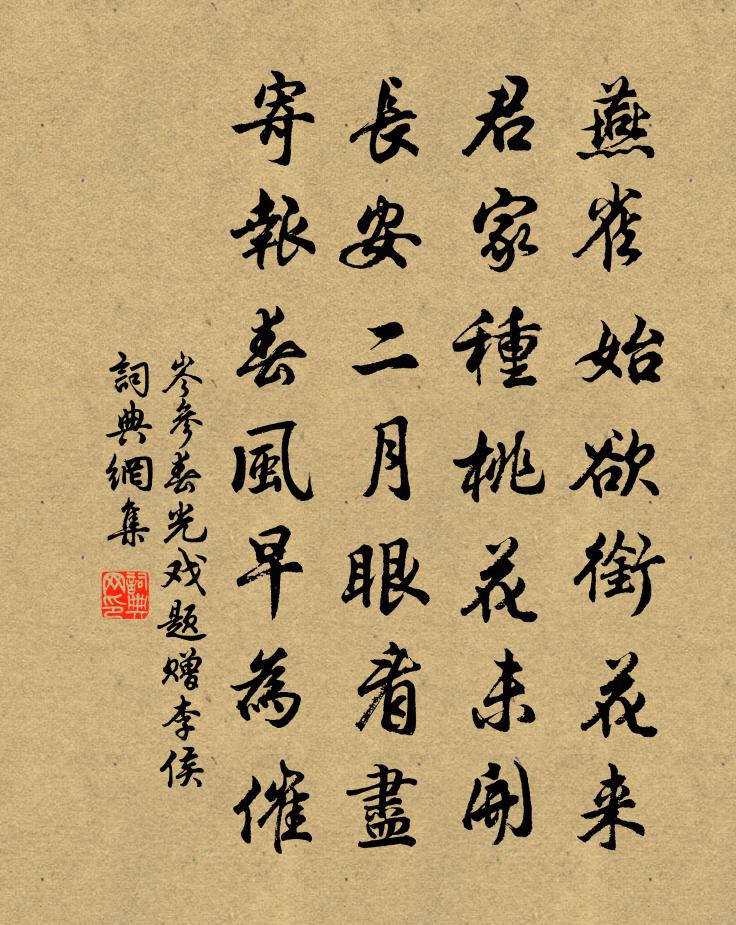 詩詞名句歷史字典書法欣賞書法字典國語詞典說文解字康熙字典古漢語字典標 題 作 者 詩 句 春光戲題贈李侯作者:岑參 朝代:唐代春光戲題贈李侯原文燕雀始欲銜花來,君家種桃花未開。長安二月眼看盡,寄報春風早為催。詩詞問答問:春光戲題贈李侯的作者是誰?答:岑參問:春光戲題贈李侯寫於哪個朝代?答:唐代問:岑參的名句有哪些?答:岑參名句大全岑參春光戲題贈李侯書法欣賞春光戲題贈李侯書法作品注釋全唐詩:卷201_45詩詞推薦巨魚縱大壑錢起〔唐代〕巨魚縱大壑,遂性似乘時。奮躍風生鬣,騰凌浪鼓鰭。龍攄回地軸,鯤化想天池。方快吞舟意,尤殊在藻嬉。傾危頌古四十五首釋慧遠〔宋代〕短帽輕衫宮樣窄,舞遍胡笳十八拍,曲罷酒闌猶未歸,歸來月色和雲白。知郡都官示答盱眙周令詩有感而作強至〔宋代〕臨淮郡事素稱繁,太守才明此典藩。每歲欲甄群吏狀,是人思出大賢門。孤生自恨方趨走,末跡無緣被薦論。異日金人捧露盤高觀國〔宋代〕楚宮閒,金成屋,玉為闌。斷雲夢、容易驚殘。驪歌幾疊,至今愁思怯陽關。清音恨阻,抱哀箏、知為誰彈。年華直指大丹歌呂岩〔唐代〕三清宮殿隱昆巔,日月光浮起紫煙。池沼泓泓翻玉液,樓台疊疊運靈泉。青龍乘火鉛為汞, * 騰波汞作鉛。欲得蜀州西湖范成大〔宋代〕閒隨渠水來,偶到湖光里。仍呼水月舟,徑度雲錦地。誰雲不解飲,我已荷香醉。湖陰玉嬋娟,敻立紅妝外。何須木蘭花慢 春興吳存〔元代〕問東君識我,應怪我,鬢將華。甚破帽蹇驢,清明無酒,寒食無家。東風綠蕪千里,怕登樓、歸思渺天涯。煙外一王元才攜家來過有詩風示因簡此作晁公溯〔宋代〕我思見諸姑,正復如父存。諸姑不可見,豈無若子孫。天涯忽爾逢,悲定喜且語。惟我之老姑,爾之外王母。真能秦淮官柳二首之一賀鑄〔宋代〕秦淮兩潮西復東,淮邊楊柳酣薰風。送春白花去漠漠,避日黃鳥啼怱怱。陶彭澤多倦官嘆,桓琅邪今衰病翁。此身折紅梅佚名〔宋代〕隴上殘雪,曲水流斷,淑氣潛通。群花冷未吐,夜來梅萼,數枝繁紅。光奪化工。發艷色、不染東風。信憑曉風,游廬山山陽七詠其七白鶴觀蘇轍〔宋代〕五老相攜欲上天,玄猿白鶴盡疑仙。浮雲有意藏山頂,流水無聲入稻田。古木微風時起籟,諸峰落日盡生煙。歸鞍聞沈氏小亭欲往主人辭出先聞趙承相法游王洋〔宋代〕籬橫地狹曲相裁,倦掃殘花長綠苔。連榭似聞兼靜雅,閒情暫欲洗塵埃。料將春色供家用,那有芳尊為客開。怪見開歲半月湖村梅開無餘偶得五詩以煙濕落梅村陸游〔宋代〕斗柄忽東指,開盡湖邊梅,偉觀天下無,四顧雪千堆。時至當歛退,勿受曉角催。安知桃李輩,於子無嫌猜?酹江月 前日歸途,偶記和仲欲把鋤 門人願安熙〔元代〕獨喜其先得我心之所同也。中夕不寐,卒而成章,寫寄和仲,可為後日(原無後日二字,據丁藏舊鈔本補)相見一頌古二十六首釋嗣宗〔宋代〕萬仞峰前握手時,清歌一曲少人知。但見瞎驢驚宇宙,不知法眼付傳誰。題蘇氏巽風閣李石〔宋代〕巽風起東南,大地萬物小。吳門共延矚,匹練橫江表。周宗廟歌 皇夏庾信〔南北朝〕若水逢降君。窮桑屬惟政。不哉馭帝籙。郁矣當天命。方定五雲官。先齊八風令。文昌氣似珠。太史河如鏡。南宮奉和九月九日登慈恩寺浮圖應制樊忱〔唐代〕淨境重陽節,仙遊萬乘來。插萸登鷲嶺,把菊坐蜂台。十地祥雲合,三天瑞景開。秋風詞更遠,竊抃樂康哉。同孫子直和李參政東園韻十絕洪咨夔〔宋代〕食肉玉關徒自苦,然臍郿塢太生痴。人心溪壑元無底,富貴功名十二時。再游頭陀寺李涉〔唐代〕無因暫泊魯陽戈,白髮兼愁日日多。只恐雪晴花便盡,數來山寺亦無他。名句推薦公乎躍馬揚玉鞭,滅沒高蹄日千里。溫庭筠《拂舞詞 / 公無渡河》 老去悲秋強自寬,興來今日盡君歡。杜甫《九日藍田崔氏莊》 劉郎已恨蓬山遠,更隔蓬山一萬重!李商隱《無題·來是空言去絕蹤》 吳台直下,緗梅無限,未放野橋香度。吳文英《永遇樂·探梅次時齋韻》 山迴路轉不見君,雪上空留馬行處。岑參《白雪歌送武判官歸京》 遠夢歸侵曉,家書到隔年。杜牧《旅宿》 遙看孟津河,楊柳郁婆娑。佚名《折楊柳歌辭五首》 不以智累心,不以私累己;寄治亂於法術,托是非於賞罰。韓非及後人《韓非子·大體》 取之非易,守之尤艱;智不足弗得,謀有失竟患,死生事也。來俊臣《羅織經·控權卷第四》 歷冰霜、不變好風姿,溫如玉。陸容《滿江紅·詠竹》