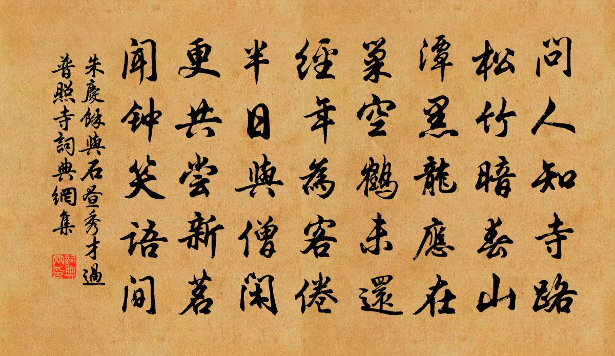 詩詞名句歷史字典書法欣賞書法字典國語詞典說文解字康熙字典古漢語字典標 題 作 者 詩 句 與石晝秀才過普照寺作者:朱慶餘 朝代:唐代與石晝秀才過普照寺原文問人知寺路,松竹暗春山。潭黑龍應在,巢空鶴未還。經年為客倦,半日與僧閒。更共嘗新茗,聞鍾笑語間。詩詞問答問:與石晝秀才過普照寺的作者是誰?答:朱慶餘問:與石晝秀才過普照寺寫於哪個朝代?答:唐代朱慶餘與石晝秀才過普照寺書法欣賞與石晝秀才過普照寺書法作品注釋全唐詩:卷514-40詩詞推薦雜曲歌辭何滿子薛逢〔唐代〕系馬宮槐老,持懷店菊黃。故交今不見,流恨滿川光。鷓鴣天姬翼〔元代〕過隙光陰抵死催。浮生屈指有多來。芥城業識填將滿,拂石迷雲撥不開。功打底,罪爭魁。英雄呈徹死堆灰。一團和史子修投贈二首韻時被命至玉堂程公許〔宋代〕歷盡羊腸足力酸,湖山正好暫游盤。羈愁等是如鴻集,鄉信難忘問鵲乾。瓦屋三間非易借,蒯緱長鋏莫我彈。玉川送呂希彥司門通判河陽文同〔宋代〕行父鬚生公相家,修潔不類在紈綺。豈惟浩蕩愛古學,實亦縱橫曉時事。孟州之民爾何幸,一旦得此賢半刺。定知大藤峽曾幾〔宋代〕一洗干戈眼,舟穿亂石間。不因深避地,何得飽看山。江潰重圍急,天橫一線慳。人言三峽險,此路足追攀。酬樂天重寄別元稹〔唐代〕卻報君侯聽苦辭,老頭拋我欲何之。武牢關外雖分手,不似如今衰白時。題弦風亭趙潛夫〔宋代〕怪他蟹舍蠔房地,不是吟情住亦難。數尺短牆圍晝寂,半鉤疏箔障春寒。水花草滿蛙鳴合,日薄花陰鶴夢安。底處水仙子·游越福王府喬吉〔元代〕笙歌夢斷蒺藜沙,羅綺香餘野菜花。亂雲老樹夕陽下,燕休尋王謝家,恨興亡怒煞些鳴蛙。鋪錦池埋荒甃,流杯亭國朝自建隆至大中祥符七年垂五十載謝頤素始陳逸賞〔宋代〕死卻王褒五百春,資中不見有詞臣。今朝忽遇登龍客,喜殺西郊謝逸人。閒賦姜特立〔宋代〕樓台百萬裝成,花木四時羅列。從渠眼底江山,欠我詩中風月。念奴嬌(端午酒邊)陳著〔宋代〕雨簾高卷,見榴花、應怪風流人老。是則年年佳節在,無奈閒心悄悄。巧扇風輕,香羅雪濕,夢裡曾看了。如今溪趙嘉父送松江蟹高似孫〔宋代〕青天肯為蟹飛霜,蟹亦貪詩老更狂。楓葉已隨詩共冷,菊花能為酒先忙。平生爾雅誰能熟,此去玄經孰敢荒。前去獨坐韓維〔宋代〕雪屋生寒勁,風燈落燼頻。驚號獨過雁,默坐未眠人。世事存傷沒,年華故換新。還將寂寞意,強與凍醪親。柏山僧房賞花董天吉〔宋代〕雲房閟孤賞,幽花杳誰攀。春風不掩私,吹芬滿禪關。欣抃披沉寂,覓此芳菲顏。亭亭紫錦蓋,濟濟玉筍斑。風流歌司空圖〔唐代〕處處亭台只壞牆,軍營人學內人妝。太平故事因君唱,馬上曾聽隔教坊。錦園雙桂植之二十八年未嘗著花今忽盛開紫趺喻良能〔宋代〕疇昔栽雙桂,於今四七秋。紫趺香冉冉,金蕊色浮浮。標緻殊他桂,風流最蓐收。無才強摹寫,著語故難遒。送恩平潛使君還里二首李昴英〔宋代〕風流太守作春遊,到處恩波浩蕩流。懷綬故鄉需上日,移舟別浦趁中秋。聲歌洋溢行人口,書翰縱橫健筆頭。識面寄嚴文炳陳造〔宋代〕子云草玄宅,門徑積莓苔。昨夢憑詩說,新雨無客來。袞袞手可炙,自詫甘寒灰。蜀莊寂寞者,念我首獨回。李陵台汪元量〔宋代〕伊昔李少卿,築台望漢月。月落淚縱橫,悽然腸斷裂。當時不受死,心懷歸漢闕。豈謂壯士身,中道有摧折。我行春宵有感八首白玉蟾〔宋代〕多愁君自爾,不樂我何曾。西北山如削,明朝約共登。名句推薦日月之行,若出其中。曹操《觀滄海 / 碣石篇》 青山依舊在,幾度夕陽紅。楊慎《臨江仙·滾滾長江東逝水》 樓頭小婦鳴箏坐,遙見飛塵入建章。王昌齡《青樓曲二首》 卻將萬字平戎策,換得東家種樹書。辛棄疾《鷓鴣天·有客慨然談功名因追念少年時事戲作》 中山人予之貓,貓善捕鼠及雞。劉基《乞貓》 寧可正而不足,不可邪而有餘。佚名《增廣賢文·上集》 年年遊子惜余春,春歸不解招遊子。賀鑄《惜余春·急雨收春》 寂寞柴門村落里,也教插柳記年華。趙元鎮《寒食書事》 尋常一樣窗前月,才有梅花便不同。杜耒《寒夜》 梅似雪,柳如絲。試聽別語慰相思。辛棄疾《鷓鴣天·送歐陽國瑞入吳中》