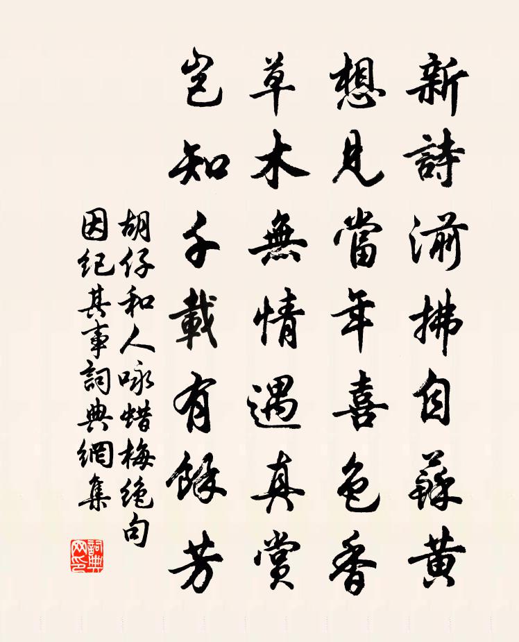 詩詞名句歷史字典書法欣賞書法字典國語詞典說文解字康熙字典古漢語字典標 題 作 者 詩 句 和人詠蠟梅絕句因紀其事作者:胡仔 朝代:宋代和人詠蠟梅絕句因紀其事原文新詩湔拂自蘇黃,想見當年喜色香。草木無情遇真賞,豈知千載有餘芳。詩詞問答問:和人詠蠟梅絕句因紀其事的作者是誰?答:胡仔問:和人詠蠟梅絕句因紀其事寫於哪個朝代?答:宋代胡仔和人詠蠟梅絕句因紀其事書法欣賞和人詠蠟梅絕句因紀其事書法作品詩詞推薦胡姬年十五曹勛〔宋代〕胡姬年十年,媚臉明朝霞。當壚一笑粲,桃葉映桃花。王孫停寶馬,公子駐香車。學歌裝翡翠,看月弄琵琶。不顧春懷十首汪莘〔宋代〕神遊何邊方,夢到迷處所。論世非秦漢,辨地豈吳楚。碧桃翳陽林,翠霞蔭清渚。鵾雞鳴化間,鸞鶴將儔侶。中有此君室方岳〔宋代〕匪書誰與稽,匪行誰與居。以書造竹所,俯仰千載余。清平樂(漁父)佚名〔宋代〕陣鴻驚處。一網沉江渚。落葉亂風和細雨。撥棹不如歸去。蘆花輕泛微瀾。蓬窗獨自清閒。一覺遊仙好夢,任它竹九日三首宋白〔宋代〕陶家籬落菊花開,醉拎西風立釣台。一座良交皆不見,數聲燕雁戛雲來。送江西轉運李定度支宋祁〔宋代〕江西使節擁朱輪,正用中台鶴髮人。漕米爭銜千鷁舶,即山催鑄萬蚨緡。宴齋螺岫披雲出,醉館星苞照露勻。雙筆贈歐陽建曹攄〔魏晉〕昔有豹產。實能魏鄭。在漢黃邵。克堪敷政。著名上代。千載遺詠。仰瞻先蹤。可不斯競。方六七十。觀化賢聖。登城二首張耒〔宋代〕楚望迷千里,孤城草樹濃。憑臨點衣雨,容易落花風。人事年年改,風光處處同。未能忘出處,徙倚更書空。新荷葉佚名〔宋代〕蓮萼飄香,金風乍扇輕涼。鬱鬱蔥蔥,瑞煙縈繞華堂。星辰孕秀,良霄夢、吉協熊祥。紫芝眉宇,瑩然如峙圭璋。【雙調】清江引_詠笑靨兒一周文質〔元代〕詠笑靨兒一窩粉香堪愛惜,近眼花將墜。添他百媚生,動我千金費。春風小桃初破蕊。集杜句為老母壽三首項安世〔宋代〕玄圃蒼洲莽空闊,安得赤腳踏層冰。秦城樓閣鶯花里,南極老人自有星。對月寄同志劉得仁〔唐代〕霜滿中庭月在林,塞鴻頻過又更深。支頤不語相思坐,料得君心似我心。送徐仲洪尉南安八首彭龜年〔宋代〕椎牛酌酒是民頑,明約科條墟裡間。若更寬他衣食路,桑間陌上自閒閒。楓橋胡珵〔宋代〕朝辭海涌千人古,暮宿楓橋半夜鍾。明日館娃宮裡去,洞庭呼起一帆風。頌古十六首釋明辯〔宋代〕兩女合為一媳婦,古寺基前幢子豎。彷佛上有陀羅尼,多少行人盡驚怖。洗丹沙詞施肩吾〔唐代〕千淘萬洗紫光攢,夜火熒熒照玉盤。恐是 * 殘米粒,不曾將與世人看。仲宣樓陳杰〔宋代〕一雨真成五月秋,十年重上仲宣樓。崢嶸歲月欺人事,浩蕩乾坤入客愁。孫劉氣力三分盡,蜀漢山川百戰收。可是詩謝趙南岡馬廷鸞〔宋代〕早從諸暨厚相於,郭史能書也憶渠。萬事只今同去鶴,十年依舊愛前魚。試嘗小缶烹蓴玉,旋潑新醅漉酒釃。故舊九日寄渭南文友葛紹體〔宋代〕自古吳興山水窟,只今杖屨幾人閒。懷君九日登臨處,知向何山向道山。捧宣頭許歸侍養李中〔唐代〕泥書捧處聖恩新,許覲庭闈養二親。螻蟻至微寧足數,未知何處答穹旻。名句推薦逝者如斯夫!不捨晝夜。孔子弟子《論語·子罕篇》 霰淅瀝而先集,雪粉糅而遂多。謝惠連《雪賦》 儒者在本朝則美政,在下位則美俗。荀子《荀子·儒效》 公生明,偏生暗荀子《荀子·不苟》 人情送匹馬,買賣不饒針!佚名《增廣賢文·下集》 長水塘南三日雨,菜花香過秀州城查慎行《曉過鴛湖》 意內稱長短,終身荷聖情。杜甫《端午日賜衣》 人不可以無恥。無恥之恥,無恥矣。孟子《孟子·盡心章句上·第六節》 眾鳥高飛盡,孤雲獨去閒。李白《獨坐敬亭山》 因依老宿發心初,半學修心半讀書。王建《寄舊山僧》
