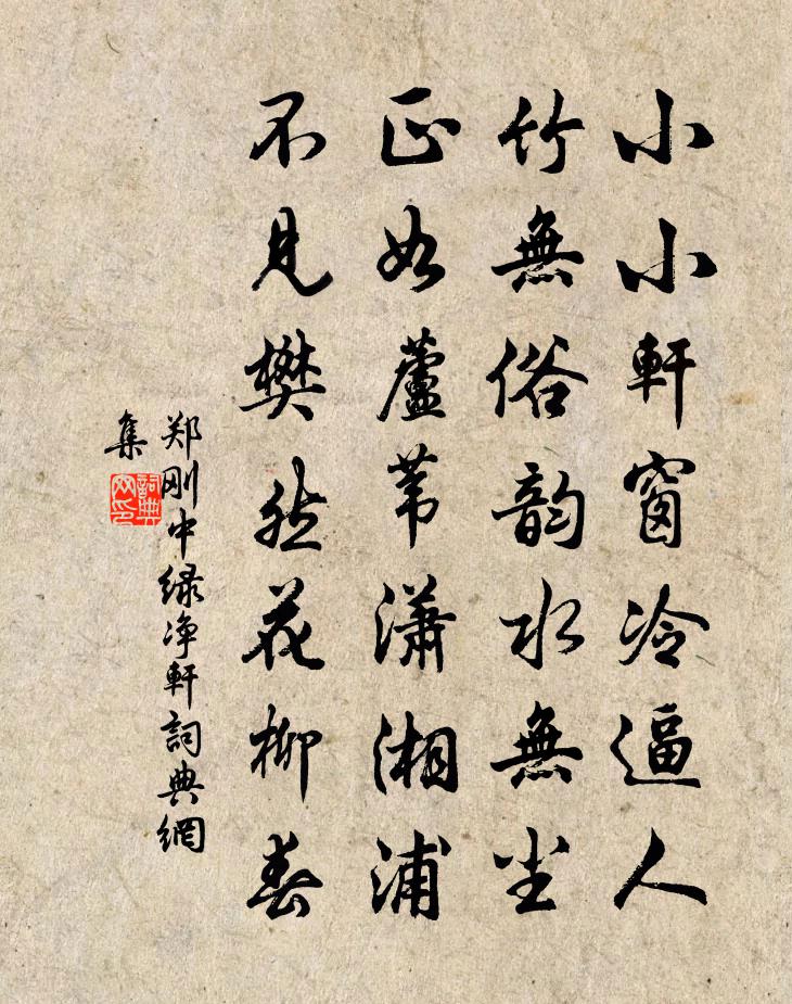 詩詞名句歷史字典書法欣賞書法字典國語詞典說文解字康熙字典古漢語字典標 題 作 者 詩 句 綠淨軒作者:鄭剛中 朝代:宋代綠淨軒原文小小軒窗冷逼人,竹無俗韻水無塵。正如蘆葦瀟湘浦,不見樊然花柳春。詩詞問答問:綠淨軒的作者是誰?答:鄭剛中問:綠淨軒寫於哪個朝代?答:宋代鄭剛中綠淨軒書法欣賞綠淨軒書法作品詩詞推薦秋日韋少府廳池上詠石楊巨源〔唐代〕主人得幽石,日覺公堂清。一片池上色,孤峰雲外情。舊溪紅蘚在,秋水綠痕生。何必澄湖徹,移來有令名。燕居十六首彭龜年〔宋代〕為利較錙銖,真成小丈夫。脂肥不滿腹,罪已塞堪輿。富春·富春縣前江厲鶚〔清代〕富春縣前江勢奔,危樓如畫俯山根。林林人影向沙市,葉葉風帆下海門。秋入遙空無寸翳,旱經焦土有千村。田家湖州歌九十八首 其一汪元量〔宋代〕丙子正月十有三,撾鞞伐鼓下江南。臯亭山上青煙起,宰執相看似醉酣。和張政仲見寄三絕劉學箕〔宋代〕故人別去復一月,三絕詩章寄我來。我有青州四從事,已令挈至待君開。和張晉彥游嶽麓張栻〔宋代〕齋舫凌湮浦,雲屏入畫圖。日烘花炫晝,風定水明湖。布穀佩春種,提壺勸客沽。湘中無限景,賦詠繼三都。昆明池侍宴應制沈佺期〔唐代〕武帝伐昆明,穿池習五兵。水同河漢在,館有豫章名。我後光天德,垂衣文教成。黷兵非帝念,勞物豈皇情。春仗居苦趙汝唫〔宋代〕去郭近一里,結茅才數間。紅塵飛不到,幽事頗相關。鑿石分流水,移松補斷山。棲禽忙似我,日落未知還。謁明太祖陵乾隆〔清代〕崛起何嫌本做僧,漢高同傑又多能。每當巡省臨華里,必致勤虔謁孝陵。一代規模頗稱樹,百年禮樂未遑興。獨憐過毛竹山章鑒〔宋代〕一重關復一重關,一步難於一步難。地僻林深晴亦濕,山高風猛夏猶寒。斷崖雲影掛枯樹,劈澗雷聲走怒湍。不信失調名利登〔宋代〕花外潮回,劍邊虹去,撫寒江千里。句李迪〔宋代〕日烘麗萼紅縈火,雨過菖條綠噴煙。和王拱辰觀梨花二首二晁補之〔宋代〕壓沙寺里萬株芳,一道清流照雪霜。銀闕森森廣寒曉,仙人玉仗有天香。慶老石帆庵李邴〔宋代〕鶉作衣裳鐵作肝,老將身事付寒岩。諸天香積猶多供,百鳥山花已罷銜。定起水沉和月冷,詩成冰彩敵雲緘。山頭出北關二里葉紹翁〔宋代〕脫衣命仆洗塵埃,籬落人家未見梅。出得城門能幾步,船頭便有白鷗來。上元後一日觀燈寄王四蘇轍〔宋代〕城頭月減一分圓,城裡人家萬炬然。紫陌群游逢酒住,紅裙醉舞向人妍。且為行樂終今夕,共道重來便隔年。遙想水調歌(壽退休丞相)汪相如〔宋代〕指點縠江水,遙認作瓊醅。介公眉壽,年年傾入紫霞杯。壽與江流無盡,人在壺天不老,談笑領春回。昨夜瞻南極北山春暮釋行海〔宋代〕滿山朝氣藹芳晴,鳥蹈幽松弄好聲。九十日春如夢過,看花不是少年情。木蘭花慢(重陽)洪皓〔宋代〕對金商暮節,此時客、意難忘。正卉木凋零,蛩螿韻切,賓雁南翔。東籬有黃蕊綻,是幽人、最愛折浮觴。須信凌鷓鴣天(壽熊左史)黃定〔宋代〕間世文章萬選錢。清時平步八花磚。大開紫府瑤池宴,正是橙黃橘綠天。金燭里,玉堂前。翰林元是武夷仙。雍容名句推薦九萬里風鵬正舉。李清照《漁家傲·天接雲濤連曉霧》 荒戍落黃葉,浩然離故關。溫庭筠《送人東遊》 一家二貴,事乃無功。韓非及後人《韓非子·揚權》 黃雲萬里動風色,白波九道流雪山。李白《廬山謠寄盧侍御虛舟》 相顧無言,惟有淚千行。蘇軾《江城子·乙卯正月二十日夜記夢》 天涯芳草迷歸路,病葉還禁一夜霜。王夫之《初度口占·辛丑》 雨落不上天,水覆難再收。李白《妾薄命》 才過清明,漸覺傷春暮。李冠《蝶戀花·春暮》 鹹言上國繁華,豈謂帝城羈旅。子蘭《秋日思舊山》 常人安於故習,學者溺於所聞。商鞅《商君書·更法》