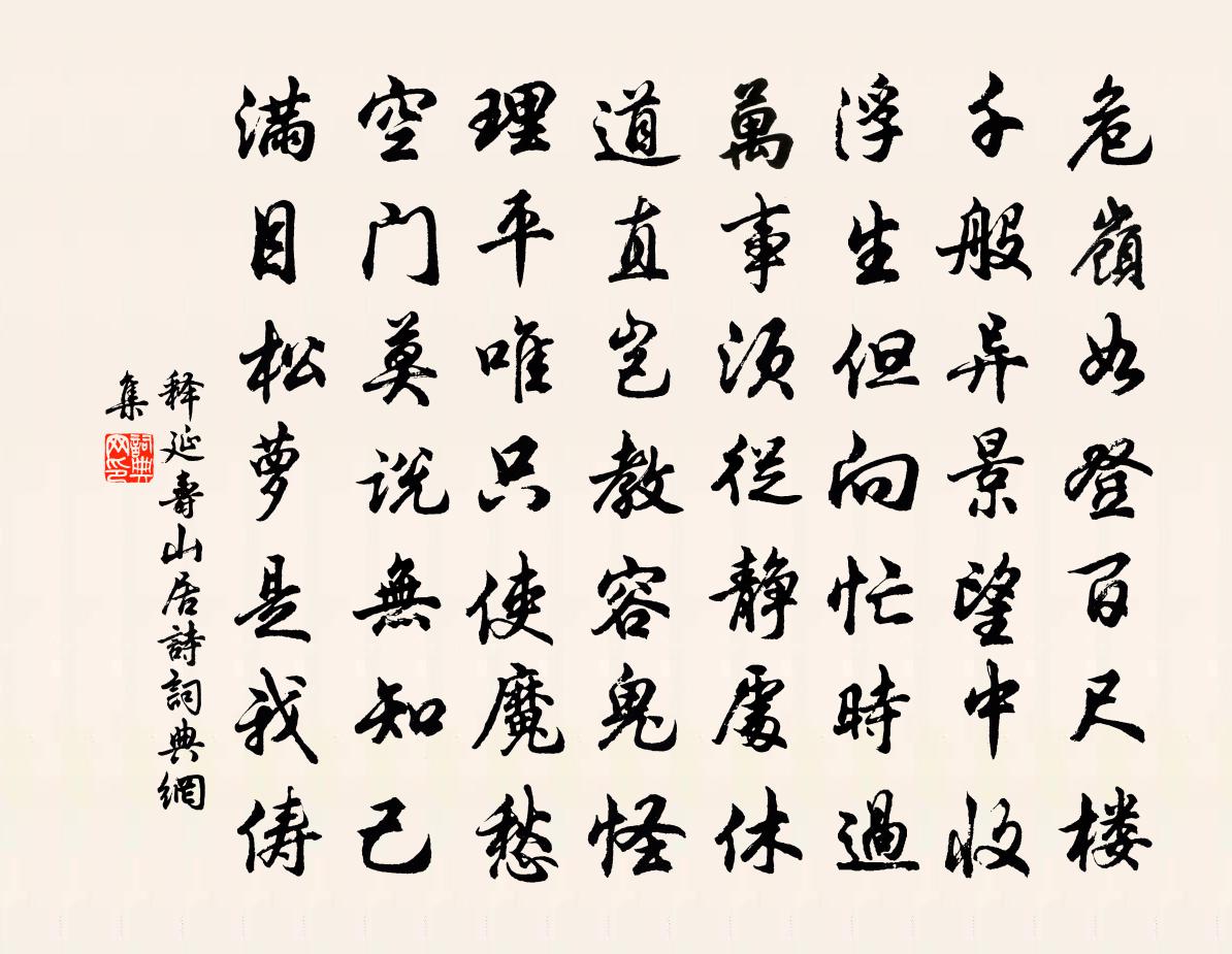 詩詞名句歷史字典書法欣賞書法字典國語詞典說文解字康熙字典古漢語字典標 題 作 者 詩 句 山居詩作者:釋延壽 朝代:宋代山居詩原文危嶺如登百尺樓,千般異景望中收。浮生但向忙時過,萬事須從靜處休。道直豈教容鬼怪,理平唯只使魔愁。空門莫說無知己,滿目松蘿是我儔。詩詞問答問:山居詩的作者是誰?答:釋延壽問:山居詩寫於哪個朝代?答:宋代釋延壽山居詩書法欣賞山居詩書法作品詩詞推薦清心鏡 聞吳解元昆仲身化馬鈺〔元代〕嘆浮生,心灰盡。小吳解元昆促,少年清俊。又爭知、半月中間,便一齊殂殞。人還悟,人還省。*下家緣,完全送紅梅行之有詩和依其韻和梅堯臣〔宋代〕綴綴紅梅肥似蠟,蒙蒙飛雨灑如脂。吳郎齒軟食不得,翻憶張公大谷梨。和之美河洲四詩司馬光〔宋代〕寂寂河洲夜,蘆花繞墟舍。孤客久未眠,窗燈落寒灺。延平粹廳十詠環美陳宓〔宋代〕昔人夸四美,勝事最難並。台榭花相映,青春月正明。偈頌七十二首釋祖欽〔宋代〕萬法俱忘百念灰,等閒驀鼻拽將回。鏡光一照明如日,直得木人心眼開。豐樂亭遊春·其三歐陽修〔宋代〕紅樹青山日欲斜,長郊草色綠無涯。遊人不管春將老,來往亭前踏落花。秋月朱熹〔宋代〕清溪流過碧山頭,空水澄鮮一色秋。隔斷紅塵三十里,白雲紅葉兩悠悠。學舍諸生罕至或累旬倚席不講愧而成詠宋祁〔宋代〕直舍沈沈掩迴廊,古壇槐柳對蒼涼。一囊有客愁飢死,三尺無人問喙長。瞑據槁梧真用拙,束歸高閣分深藏。日斜依韻和睢陽杜相公答蔡君謨新體飛草書梅堯臣〔宋代〕丹砂篆印發題封,雲母屏開照耀中。漠漠蛟綃吹入紙,翹翹蠆髮捲隨風。新番自與鴻都異,舊法唯應堊帚同。丞相籬筍李頎〔唐代〕東園長新筍,映日復穿籬。迸出依青嶂,攢生伴綠池。色因林向背,行逐地高卑。但恐春將老,青青獨爾為。月下李新〔宋代〕俗意款能免,高情誰與論。惟憐今夜月,依舊照衡門。論詩三十首(選五)元好問〔金代〕其七慷慨歌謠絕不傳,穹廬一曲本天然。中州萬古英雄氣,也到陰山敕勒川。其八沈宋橫馳翰墨場,風流初不廢齊命子 其六陶淵明〔魏晉〕肅矣我祖,慎終如始。直方二台,惠和千里。於皇仁考,淡焉虛止。寄跡風雲,冥茲慍喜。顏闔蘇軾〔宋代〕顏闔古有道,躬耕自衣食。區區魯小邦,不足隱明德。軺軒來我門,聘幣繼金璧。山門應使者,耕稼不謀國。但疑花光十梅淡中有味釋師範〔宋代〕半開半合榮枯外,似有似閒淡中。自是一般風味別,笑他紅紫斗芳叢。次韻景文山堂聽箏三首蘇軾〔宋代〕馬上胡琴塞上姝,鄭中丞後有人無。詩成樺燭飄金燼,八尺英公欲燎須。題終南山隱者居姚鵠〔唐代〕開門絕壑旁,躡蘚過花梁。路入峰巒影,風來芝朮香。夜吟明雪牖,春夢閉雲房。盡室更何有,一琴兼一觴。新亭梅偶作吳則禮〔宋代〕衡門宿昔只棲遲,慚愧三堂春事奇。為有叢筠傍流水,故教疏影作橫枝。香羅未辦凌波去,素魄休論啼鴃時。乞與西湖春曉魏憲〔清代〕十里寒塘路,煙花一半醒。晨鐘催落月,宿火亂稀星。欹枕看湖白,開窗喜嶼青。笙歌方一歇,鶯囀柳洲亭。瀟湘神黃公紹〔宋代〕望湖天。望湖天。綠楊深處鼓鼘鼘。好是年年三二月,湖邊日日看划船。名句推薦瘦影自臨春水照,卿須憐我我憐卿。馮小青《怨》 日邊訊息空沈沈。畫眉樓上愁登臨。鄭文妻《憶秦娥·花深深》 秋娘渡與泰娘橋,風又飄飄,雨又蕭蕭。蔣捷《一剪梅·舟過吳江》 波面澄霞,蘭艇采香去。高觀國《祝英台近·荷花》 蓄恩不倦,以一取萬。黃石公《三略·上略》 世界微塵里,吾寧愛與憎。李商隱《北青蘿》 秋空明月懸,光彩露沾濕。孟浩然《秋宵月下有懷》 欲潔何曾潔,雲空未必空。可憐金玉質,終陷淖泥中。曹雪芹《紅樓夢·第五回》 我軍青坂在東門,天寒飲馬太白窟。杜甫《悲青坂》 少壯從戎馬上飛,雪山童子未緇衣劉商《贈頭陀師》