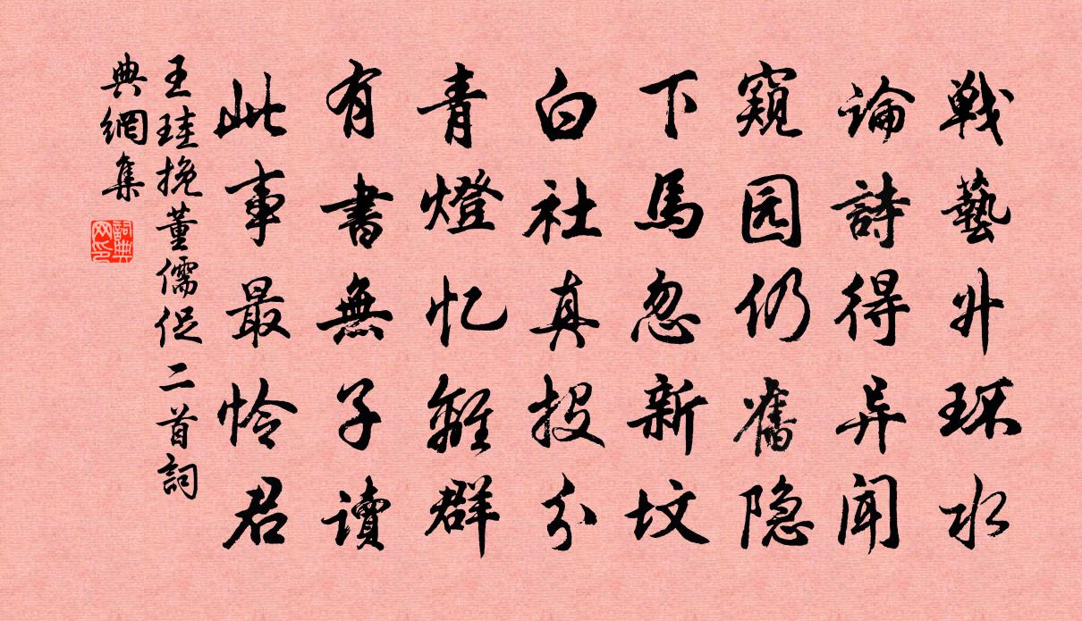 詩詞名句歷史字典書法欣賞書法字典國語詞典說文解字康熙字典古漢語字典標 題 作 者 詩 句 挽董儒促二首作者:王珪 朝代:唐代挽董儒促二首原文戰藝升環水,論詩得異聞。窺園仍舊隱,下馬忽新墳。白社真投分,青燈憶離群。有書無子讀,此事最憐君。詩詞問答問:挽董儒促二首的作者是誰?答:王珪問:挽董儒促二首寫於哪個朝代?答:唐代王珪挽董儒促二首書法欣賞挽董儒促二首書法作品詩詞推薦仙跡岩題詩二十三首無骨篛佚名〔宋代〕許氏功成獲上升,曾遺一劑語丁寧。山生紺篛奇無骨,洞隱金丹顯有靈。松竹欹岩非易取,煙霞塞道卒難經。有緣湯參議惠蓮走筆以謝劉宰〔宋代〕蓮實同房若弟昆,人情乖異不堪綸。只今昆弟成胡越,蔓草猶能庇本根。天聲館張鎡〔宋代〕鸞鶴紛來下,天風駕月明。語言難道斷,不墮世間聲。雜體詩 魏文帝曹丕游宴江淹〔南北朝〕置酒坐飛閣。逍遙臨華池。神飈自遠至。左右芙蓉披。綠竹夾清水。秋蘭被組崖。月出照園中。冠佩相追隨。客從戲贈靈澈上人呂溫〔唐代〕僧家亦有芳春興,自是禪心無滯境。君看池水湛然時,何曾不受花枝影。謝丁端叔直閣惠永嘉髹研句容香鬲楊萬里〔宋代〕元珍先生茁雲孫,雪竹有節豹有文。染雲作句本天巧,鏤冰生花無手痕。鵷鷺行邊舊聯翼,天祿閣中今獨直。半竿竹素山房小飲南徐唐正方善歌吳伶以長簫和之仇遠〔宋代〕少時聞簫白玉台,一曲未終丹鳳來。金瀨空明秋水淺,妙音久不聞蓬萊。吳下老伶燕中回,能以北腔歌落梅。紅塵黃金縷·妾本錢塘江上司馬槱〔宋代〕妾本錢塘江上住。花落花開,不管流年度。燕子銜將春色去,紗窗幾陣黃梅雨。斜插犀梳雲半吐,檀板輕敲,唱徹壺中天(壽致政邑宰六十三,子任尉,孫領薦)翁定〔宋代〕昔時彭祖,聞道有、八百穹崇遐壽。屈指我公今幾許,歷歲才方七九。七百修齡,更三十七,猶是公之有。此逢誕沁園春(壽許貳車)危稹〔宋代〕籍甚聲名,門闌相種,文章世科。算當年瑞世,正當夏五,仙家毓德,全是春和。底事屏星,著之海嶠,奈此騰驤讀曲歌南朝民歌〔南北朝〕逋髮不可料,憔悴為誰睹。欲知相憶時,但看裙帶緩幾許。糖多令(丙子中秋前,聞歌此詞者,即席借蘆葉滿汀洲韻)劉辰翁〔宋代〕明月滿滄洲。長江一意流。更何人、橫笛危樓。天地不知興廢事,三十萬、八千秋。落葉女牆頭。銅駝無恙不。看始皇楊億〔宋代〕衡石量書夜漏深,鹹陽宮闕杳沉沉。滄波沃日虛鞭石, * 凝霜枉鑄金。萬里長城穿地脈,八方馳道聽車音。儒坑登女幾邵雍〔宋代〕予看山多矣,未嘗逢此奇。巨崖如格虎,險石若張旗。雲意閒舒捲,岩形屢改移。丹青難狀處,四面盡如斯。木蘭花(四之二·林鐘商)柳永〔宋代〕佳娘捧板花鈿簇。唱出新聲群艷伏。金鵝扇掩調累累,文杏梁高塵簌簌。鸞吟鳳嘯清相續。管裂弦焦爭可逐。何當再刊大慧語釋心月〔宋代〕妙喜胸中流出底,重華天子手親書。大千俱壞此不壞,別板刊行亦聽渠。和友人下第北游感懷李頻〔唐代〕新地為儒可致身,誰知又別五陵春。青門獨出空歸鳥,紫陌相逢盡醉人。江島去尋垂釣遠,塞山來見舉頭頻。且須曉發賀知章〔唐代〕江皋聞曙鍾,輕枻理還舼。海潮夜約約,川露晨溶溶。始見沙上鳥,猶埋雲外峰。故鄉杳無際,明發懷朋從。離京日作寇準〔宋代〕離歌豈忍樽前聽,別恨無由醉里消。惟有夢魂歸北闕,不知京洛路迢遙。和揭尉見賀韻項安世〔宋代〕茸茸弱線初迎復,軋軋陽機已轉坤。梅放小紅明紙帳,竹分寒綠壽藤尊。不愁故將逢陵尉,且喜仙官近市門。還向名句推薦門外綠陰千頃,兩兩黃鸝相應。曹組《如夢令·門外綠陰千頃》 十分不耐煩,乃為人大病;一味學吃虧,是處事良方。王永彬《圍爐夜話·第五四則》 年來腸斷秣陵舟,夢繞秦淮水上樓王士禎《秦淮雜詩二十首·其一》 歸志寧無五畝園,讀書本意在元元。陸游《讀書》 同來望月人何處?風景依稀似去年。趙嘏《江樓舊感 / 江樓感舊》 鴻雁來時,無限思量。晏殊《訴衷情·芙蓉金菊斗馨香》 吠犬雜鳴雞,燈火熒熒歸路迷。納蘭性德《南鄉子·秋暮村居》 江寒水不流,魚嚼梅花影。釋敬安《題寒江釣雪圖》 浮雲暮南征,可望不可攀。杜甫《前出塞九首》 騮馬新跨白玉鞍,戰罷沙場月色寒。王昌齡《出塞二首》