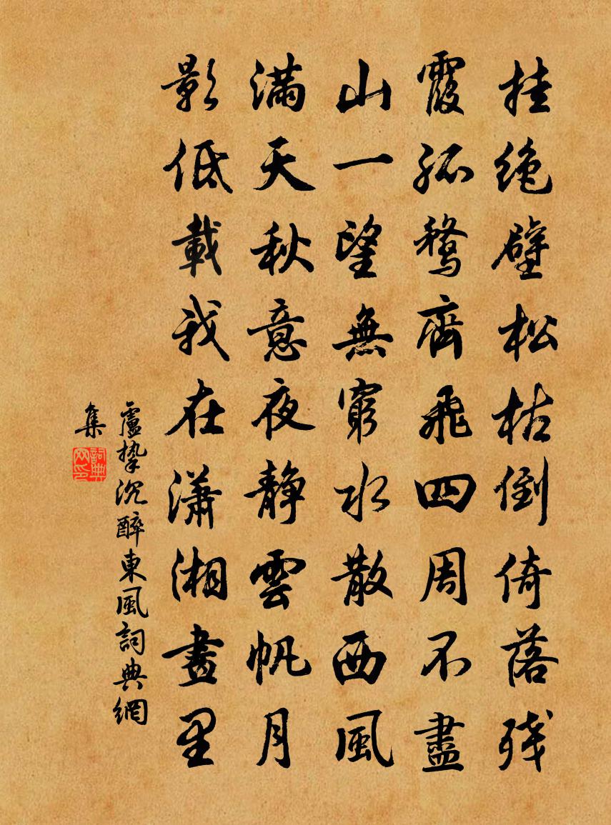 掛絕壁松枯倒倚,落殘霞孤鶩齊飛。四周不盡山,一望無窮水,散西風滿天秋意。
