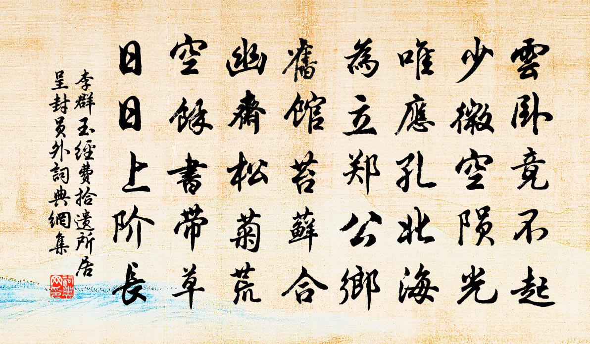 詩詞名句歷史字典書法欣賞書法字典國語詞典說文解字康熙字典古漢語字典標 題 作 者 詩 句 經費拾遺所居呈封員外作者:李群玉 朝代:唐代經費拾遺所居呈封員外原文雲臥竟不起,少微空隕光。唯應孔北海,為立鄭公鄉。舊館苔蘚合,幽齋松菊荒。空餘書帶草,日日上階長。詩詞問答問:經費拾遺所居呈封員外的作者是誰?答:李群玉問:經費拾遺所居呈封員外寫於哪個朝代?答:唐代李群玉經費拾遺所居呈封員外書法欣賞經費拾遺所居呈封員外書法作品注釋全唐詩:卷569-25詩詞推薦和邢惇夫秋懷十首黃庭堅〔宋代〕曩時高唐客,暮雨朝行雲。陰居懷天匹,楚觀夢紛紜。我欲睹光儀,齋明炷爐薰。天高萬物肅,誰為帝子魂。曹廷輔輓詞二首林亦之〔宋代〕綠水白鷗三月天,哀簫長短使人憐。草鞋踏雨同歸去,此事如今十五年。淮南發運趙邢州被詔歸闕胡宿〔唐代〕天台封詔紫泥馨,馬首前瞻北斗城。人在函關先望氣,帝於京兆最知名。一區東第趨晨近,數刻西廂接晝榮。正是春日田園雜興方德麟〔宋代〕繞畦晴綠弄潺湲,倚仗東風欲黯然。往夢更誰憐秀麥,間愁空自吒啼鵑。梨鑰相種地力盡,花柳無私春色偏。白髮止酒贈郡守楊環寶張耒〔宋代〕止酒正似塞決河,厚積薪芻傅砂礫。堅牢不使見蟻漏,一線才通便奔激。莫輕弱箭不穿縞,轉眼已驚牛弩射。我今繡帶兒(客路見梅)曾覿〔宋代〕瀟灑隴頭春。取次一枝新。還是東風來也,猶作未歸人。微月淡煙村。謾佇立、惆悵黃昏。暮寒香細,疏英幾點,飲校理盛居中家次韻二首一晁補之〔宋代〕騎鸞玉府盡仙真,短羽愁攀天漢濱。詩懶便應推老手,飲豪獨未後諸賓。宮壺銀箭剛知夜,籠燭金華已報春。倒載客中行 / 客中作李白〔唐代〕蘭陵美酒鬱金香,玉碗盛來琥珀光。但使主人能醉客,不知何處是他鄉。信州道士蕭了空坐逝或見其在湘潭總府貳蕭公方回〔宋代〕了了了了,空空空空,心肝不在臭皮袋中。想見出神似蟬蛻,可能吸露更餐風。答中上人卷梅堯臣〔宋代〕吹笛皆學龍,吹笙皆學鳳。又於笙笛間,高下不相中。得其精者稀,得其麤者眾。況於真出音,千歲不復夢。爾為梨李嶠〔唐代〕擅美玄光側,傳芳瀚海中。鳳文疏象郁,花影麗新豐。色對瑤池紫,甘依大谷紅。若令逢漢主,還冀識張公。和廬州通判李學士見寄王禹偁〔宋代〕北門西掖久妨賢,出入丹墀近八年。且把一麾淮水上,敢思三接浴堂前。將何政術稱循吏,豈有文章號謫仙。除卻歸燕詞李建勛〔唐代〕羽翼勢雖微,雲霄亦可期。飛翻自有路,鴻鵠莫相嗤。待侶臨書幌,尋泥傍藻池。沖人穿柳徑,捕蝶繞花枝。廣廈送江陰霍明府之任方乾〔唐代〕遙遙去舸新,浸郭葦兼蘋。樹列巢灘鶴,鄉多釣浦人。虹分陽羨雨,浪隔廣陵春。知竟三年秩,琴書外是貧。送知縣蘇祕丞移英州李覯〔宋代〕大邑曰南城,唯君治道行。何曾設鉤距,到底是聰明。鼎在神奸伏,鷹來鳥雀驚。詐窮多自笑,刑重亦知平。府史寄孚老釋善珍〔宋代〕雙眼常時看屋椽,從來不結俗人緣。早年曾悟出師表,曉歲始參齊物篇。魔壘孤軍降百萬,詩壇一首當三千。清溪白蓮雨後漸衰釋居簡〔宋代〕曉池芳柄褭殘馨,褪雨欹風鷺委翎。碧展一奩秋練練,似憐玉色鏡中零。已亥出南康宮伯稱以詩贈行次韻三首李呂〔宋代〕君才端可用於時,努力行將徹主知。出處到頭皆分定,相期於道不須離。閒詠陸游〔宋代〕久入春農社,新腰老衲包。紙裁微放矮,硯斫正須(左幽右頁)。髯簿能為祟,方兄任絕交。吾詩無傑句,聊復當閶門外登溪船五首楊萬里〔宋代〕選甚天時晴未晴,舟行終是勝山行。蓬收雨點斜偏好,枕慣波聲夢不驚。幸自車徒小休息,又聞鼓笛鬧將迎。偶然名句推薦獨王之國,勞而多禍管仲《管子·形勢》 人攀明月不可得,月行卻與人相隨。李白《把酒問月·故人賈淳令予問之》 不管煙波與風雨,載將離恨過江南。鄭文寶《柳枝詞》 驅雞上樹木,始聞叩柴荊。杜甫《羌村三首·其三》 離愁不管人飄泊。年年孤負黃花約。黃機《憶秦娥·秋蕭索》 守經事而不知其宜,遭變事而不知其權。司馬遷《史記·太史公自序》 一雙舞燕,萬點飛花,滿地斜陽。陳子龍《訴衷情·春遊》 明月別枝驚鵲,清風半夜鳴蟬。辛棄疾《西江月·夜行黃沙道中》 尋尋覓覓,冷冷清清,淒悽慘慘戚戚。李清照《聲聲慢·尋尋覓覓》 莫等閒,白了少年頭,空悲切!岳飛《滿江紅·寫懷》