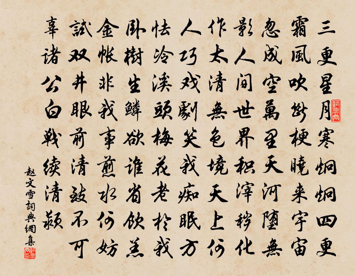 詩詞名句歷史字典書法欣賞書法字典國語詞典說文解字康熙字典古漢語字典標 題 作 者 詩 句 雪作者:趙文 朝代:宋代雪原文三更星月寒炯炯,四更霜風吹斷梗。曉來宇宙忽成空,萬里天河墮無影。人間世界積滓穢,化作太清無色境。天上何人巧戲劇,笑我痴眠方怯冷。溪頭梅花老於我,臥樹生鱗欲誰省。飲羔金帳非我事,煎水何妨試雙井。眼前清致不可辜,諸公白戰續清潁。詩詞問答問:雪的作者是誰?答:趙文問:雪寫於哪個朝代?答:宋代趙文雪書法欣賞雪書法作品詩詞推薦東海旅夜二首張耒〔宋代〕無酒消憂寒未減,隔帷相對一燈愁。蟲聲喚聲五更夢,風雨滿庭桐葉秋。答僧贈柱杖張祜〔唐代〕千回掌上橫,珍重遠方情。客問何人與,閩僧寄一莖。畫空疑未決,卓地計初成。幸以文堪采,扶持力不輕。句梅堯臣〔宋代〕認桃無綠葉,辨杏有青枝。天門泉詩李廌〔宋代〕昔聞天門泉,石竇注澄澈。行人口生煙,可救萬夫渴。為惠胡不竟,吾來值源竭。春日陳藻〔宋代〕獨上譙樓日一廻,春風桃李滿城開。狂夫欲語無人聽,呼取閒雲共酒杯。效王仲至少監詠姚花用其韻四首黃庭堅〔宋代〕映日低風整復斜,綠玉眉心黃袖遮。大梁城裡雖罕見,心知不是牛家花。送裴大夫赴亳州姚合〔唐代〕杭人遮道路,垂泣浙江前。譙國迎舟艦,行歌汴水邊。周旋君量遠,交代我才偏。寒日嚴旌戟,晴風出管弦。一杯聞似道入相因賦詩釋文珦〔宋代〕盛德方為貴,虛名底用高。異時遊蕩子,今日似蕭曹。紅粉催身朽,清霜入鬢牢。勢窮人事改,槐棘等蓬蒿。秦樓月劉秉忠〔元代〕斜陽暮。西風落葉關山路。關山路。歸鴻巢燕,笑人來去。我歌一曲君聽取。人生聚散如今古。如今古。湘江秋水謁金門高觀國〔宋代〕煙墅暝。隔斷仙源芳徑。雨歇花梢魂未醒。濕紅如有恨。別後香車誰整。怪得畫橋春靜。碧漲平湖三十頃。歸云何海棠湛道山〔宋代〕深院無人春日長,游蜂來往燕飛忙。海棠嬌甚成羞澀,憑仗東風催曉妝。松風亭趙良生〔宋代〕七樹懷鄭薰,千尺羨晉嶠。弘景招不來,俯仰但長嘯。樂府雜曲。鼓吹曲辭。巫山高皇甫冉〔唐代〕巫峽見巴東,迢迢半出空。雲藏神女館,雨到楚王宮。朝暮泉聲落,寒暄樹色同。清猿不可聽,偏在九秋中。和答孫推官久病新起見過蔡襄〔宋代〕去年大暑過京口,唯子見過牛馬走。氣溫貌古風骨粹,如入魏國逢軻叟。前趨王事難少留,兀若洪鐘未遑扣。窮秋莎雞張耒〔宋代〕金風透殘伏,玉樹先秋涼。喓喓草間蟲,感時振衣裳。楚客思萬里,夜吟怨藜床。勞勞終夕語,共此檐月光。孤輪雜興十首劉克莊〔宋代〕早持堅白論,晚踏軟紅塵。明逸並夷甫,初終似二人。馬詩二十三首·其十八李賀〔唐代〕伯樂向前看,旋毛在腹間。只今掊白草,何日驀青山?和張可投詩十首王洋〔宋代〕潤入圖書麥向辰,如今此腹又孤人。餘風更與留春在,時照紅英作醉裀。臨江仙(明日與客復登台,再用前韻。)葉夢得〔宋代〕一醉三年那易得,應須大白同浮。已知絕景是吾州。姮娥仍有意,更肯為人留。萬籟無聲遙夜永,人間未識高秋。次韻趙積中慈湖即事王之道〔宋代〕山色湖光過雨清,江邊歸騎淨無塵。先生有酒快吾取,相逢少見如斯人。名句推薦酒闌更喜團茶苦,夢斷偏宜瑞腦香。李清照《鷓鴣天·寒日蕭蕭上瑣窗》 澗影見松竹,潭香聞芰荷。孟浩然《夏日浮舟過陳大水亭 / 浮舟過滕逸人別業》 十日雨絲風片裡,濃春艷景似殘秋。王士禎《秦淮雜詩二十首·其一》 而天下皆曰其力也,必不能曰我見命焉。墨子《墨子·36章 非命(中)》 玉人初上木蘭時。懶妝斜立澹春姿。吳文英《浣溪沙·題李中齋舟中梅屏》 歲歲金河復玉關,朝朝馬策與刀環。柳中庸《征人怨 / 征怨》 分手脫相贈,平生一片心。孟浩然《送朱大入秦》 鄉國真堪戀,光陰可合輕。白居易《洛橋寒食日作十韻》 今之孝者,是謂能養。至於犬馬皆能有養;不敬,何以別乎?孔子弟子《論語·為政篇》 近來攀折苦,應為別離多王之渙《送別》