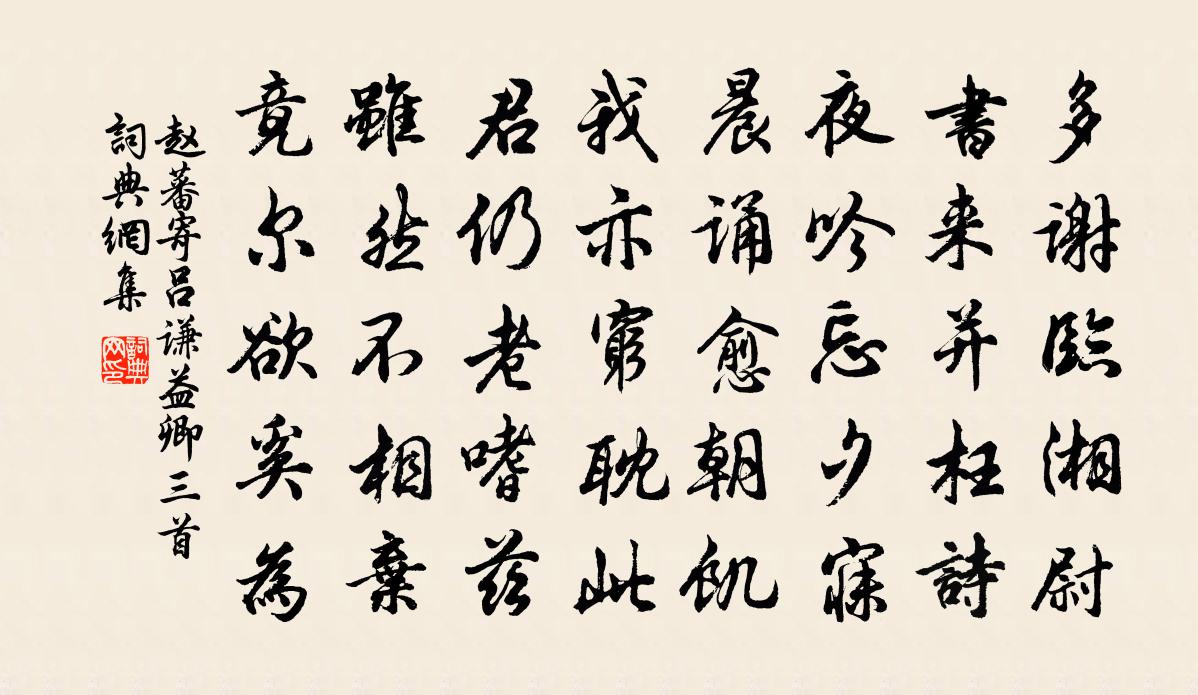 詩詞名句歷史字典書法欣賞書法字典國語詞典說文解字康熙字典古漢語字典標 題 作 者 詩 句 寄呂謙益卿三首作者:趙蕃 朝代:宋代寄呂謙益卿三首原文多謝臨湘尉,書來並枉詩。夜吟忘夕寐,晨誦愈朝飢。我亦窮耽此,君仍老嗜茲。雖然不相棄,竟爾欲奚為。詩詞問答問:寄呂謙益卿三首的作者是誰?答:趙蕃問:寄呂謙益卿三首寫於哪個朝代?答:宋代趙蕃寄呂謙益卿三首書法欣賞寄呂謙益卿三首書法作品詩詞推薦漁歌子 漁父四首周巽〔元代〕春水孤篷發棹謳。彩虹為線月為鉤。桃花浪,杜若洲。此處垂鉤釣玉明月陳杰〔宋代〕皎皎明月,載缺載盈,我酒在庭。詠武安山塔趙蕃〔宋代〕矗矗南山塔,亭亭古邑標。閒遊賒積歲,共宿憶消宵。尖出知天近,層分見木雕。未須輪犢健,直欲便鵬搖。送張惟貞少府之江陰李中〔唐代〕相送煙汀畔,酒闌登小舟。離京梅雨歇,到邑早蟬秋。俗必期康濟,詩誰互唱酬。晚涼諸吏散,海月入虛樓。壽紹慶金守陽枋〔宋代〕神光高射鬥牛墟,知是龍泉瑞氣舒。彩映北堂霜後檜,輝連東館月中書。江流現水描來似,峽束棠溪畫得如。為報始與韓玉汝相近居遂相與游今居復相近而兩家王安石〔宋代〕羈旅兒童得近鄰,相知邂逅即情親。當時豈意兩家子,此地更為同社人。勳業彈冠知白首,文章投筆讓青春。萬金寄韓子華歐陽修〔宋代〕人事從來無處定,世塗多故踐言難。誰如潁水閒居士,十頃西湖一釣竿。紅梅顧逢〔宋代〕壽陽曾點額,脂粉帶餘馨。晴雨看如醉,冰霜凍不醒。溪清羞潔白,色艷易飄零。桃杏休相忌,東君眼自青。頌古九首雲門放洞山三頓棒二首釋梵言〔宋代〕汗馬功勞要立身,將軍一等掃邊塵。全身只待英雄士,不遇英雄愁 * 。鷓鴣天(雨後湖上看落花)葉夢得〔宋代〕小雨初收報夕陽。歸雲欲渡轉橫塘。空回雨蓋翻新影,不見瓊肌洗暗香。追落景,弄微涼。尚餘殘淚浥空床。只應送懷賢上人歸隱靜兼寄達觀禪師梅堯臣〔宋代〕適從山中來,復向山中去。為報山中人,莫厭山中住。近城塵土多,亂爾煙霞趣。野蜂銜漆汁,尚欲為蔕固。息此湖南午坐雨作歸山堂共成四絕句張鎡〔宋代〕西山俄起一聲雷,不覺如拳雨點來。滴遍池中萬荷葉,又催檐蔔海榴開。減字木蘭花·偶檢叢紙龔自珍〔清代〕偶檢叢紙中,得花瓣一包,紙背細書辛幼安“更能消幾番風雨”一闋,乃是京師憫忠寺海棠花,戊辰暮春所戲為也頌證道歌證道歌釋印肅〔宋代〕上士一決一切了,十二時中常皎皎。擲劍揮空大丈夫,回頭自覺無邊表。秦系頃以家事獲謗因出舊山每荷觀察崔公見知…詩以贈之劉長卿〔唐代〕初迷武陵路,復出孟嘗門。回首江南岸,青山與舊恩。瓜步阻風作李彌遜〔宋代〕牢落窮途暮,扁舟水四涯。十年長作客,萬里得還家。雲散山排仗,潮生浪趁衙。殷勤謝風馬,為掛一帆斜。靈隱蓮峰堂孫雄飛〔宋代〕堂開金 * ,梵客為鉤簾。山影碧侵座,水聲清繞檐。粉雲埋石腳,珠露泣松髯。終擬攜孤笛,憑欄喚玉蟾。書江貫道所畫扇吳則禮〔宋代〕胸中豈止丘壑,更有洞庭瀟湘。傳語東坡居士,後來惟教江郎。用厚後弟強甫韻劉克莊〔宋代〕把茅容膝強名庵,宜夏宜冬戶向南。雪厄黃精飢杜二,花欺白髮笑陳三。爾儂柏下已骨朽,此老橘中猶手談。惟有端午日事余靖〔宋代〕江上何人吊屈平,但聞風俗彩舟輕。空齋無事同兒戲,學系朱絲辟五兵。名句推薦一時輕信人言語.自有明人話不平。馮夢龍《警世通言·卷四》 無稽之言,不見之行,不聞之謀,君子慎之。荀子《荀子·正名》 一笛當樓,謝娘懸淚立風前史達祖《玉蝴蝶·晚雨未摧宮樹》 傷人一語,利如刀割。佚名《增廣賢文·上集》 秋江上,看驚弦雁避,駭浪船回。辛棄疾《沁園春·帶湖新居將成》 西陸蟬聲唱,南冠客思深。駱賓王《詠蟬 / 在獄詠蟬》 君獨不見長城下,死人骸骨相撐拄。陳琳《飲馬長城窟行》 烏啼隱楊花,君醉留妾家。李白《楊叛兒》 朔吹飄夜香,繁霜滋曉白。柳宗元《早梅》 綠竹半含籜,新梢才出牆。杜甫《嚴鄭公宅同詠竹》