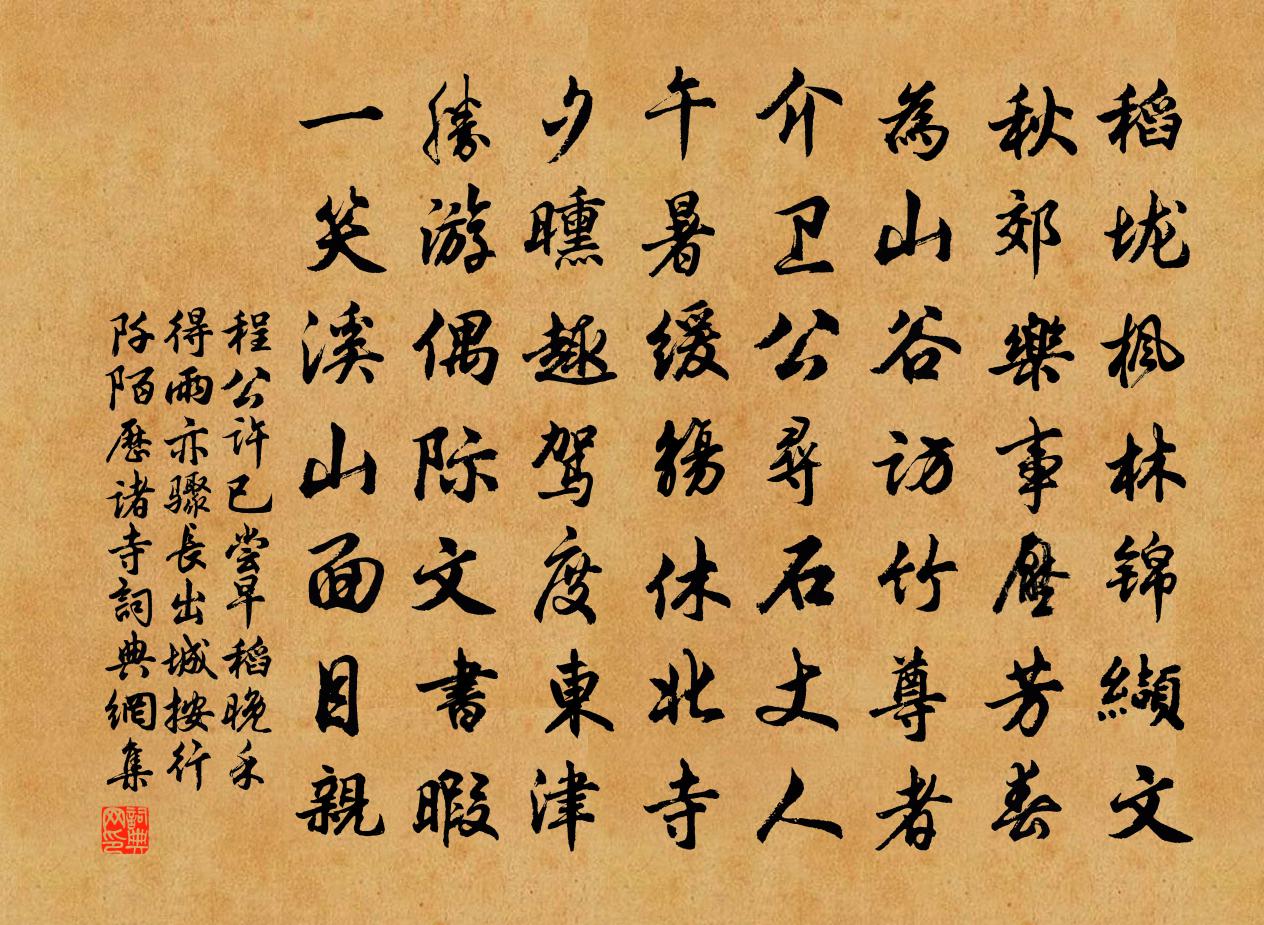 詩詞名句歷史字典書法欣賞書法字典國語詞典說文解字康熙字典古漢語字典標 題 作 者 詩 句 已嘗早稻晚禾得雨亦驟長出城按行阡陌歷諸寺作者:程公許 朝代:宋代原文稻壠楓林錦纈文,秋郊樂事壓芳春。為山谷訪竹尊者,介衛公尋石丈人。午暑緩觴休北寺,夕曛趣駕度東津。勝游偶際文書暇,一笑溪山面目親。詩詞問答問:《已嘗早稻晚禾得雨亦驟長出城按行阡陌歷諸寺》的作者是誰?答:程公許問:該詩寫於哪個朝代?答:宋代書法欣賞已嘗早稻晚禾得雨亦驟長出城按行阡陌歷諸寺書法作品詩文賞析【原題】:已嘗早稻晚禾得雨亦驟長出城按行阡陌歷諸寺而還成七言二章詩詞推薦題婺源胡氏翛然堂強至〔宋代〕歙山碧參差,歙水綠演漾。之子山水間,築室傲天壤。山空鳥飛鳴,水淨魚下上。觀魚悟至樂,聽鳥悅幽響。一樽宮詞一百首岳珂〔宋代〕雒壇爟火夜升煙,鹵簿如雲繡色鮮。萬姓歡呼感泣,此生重遇太平年。鷓鴣天姬翼〔元代〕爭鹿人家夢未回。眼前觸物盡塵埃。古人蹤跡徒雲耳,宿世功名安在哉。明月窟,亂雲堆。紛紛浪語總休該。流霞寒林石王令〔宋代〕嘗聞千歲松為石,豈意今逢林出屏。苟非木根久自化,豈此石理能有靈。世間萬怪浩莫問,枉哉山海徒有經。舒山寄答曾無己見貽詩卷趙蕃〔宋代〕吾舅風流名海內,霜清月淡有梅詩。君曾一向蒸湘識,句里懸應摸索知。邂逅已能成屢見,殷勤還辱問歸期。談間答龐參軍 其四陶淵明〔魏晉〕嘉游未歝,誓將離分;送爾於路,銜觴無欣。依依舊楚,邈邈西雲,之子之遠,良活曷聞。秋日游柯市張耒〔宋代〕柯市漁樵暮,遊人落落稀。肩禾新獲野,炷火欲鳴機。草木經寒雨,川原淡夕暉。北歸吾敢必,身世正多違。南城詠古迺賢〔元代〕夢斷朝元閣,來尋賣酒樓。野花迷輦路,落葉滿宮溝。風雨青城暮,河山紫塞愁。老人頭雪白,扶杖話幽州。漢宮春(庚午歲壽谷翁保相)陳允平〔宋代〕春滿芝田,正鶴飛空靄,龜引清漣。祥雲滿谷縹緲,非霧非煙。鶯花燕柳,占年年、三月長安。天氣好,新聲暖響老人行王安石〔宋代〕老人低心逐年少,年少還為老人調。兩家挾詐自相欺,四海傷真誰復誚。翻手作雲覆手雨,當面輸心背面笑。古來游酆都觀二首郭印〔宋代〕兩漢神仙宅,千年道德鄉。禪雲連野潤,巨柏亘天長。陳跡遺蕭爽,高風接混茫。凝情丹灶冷,無處問真方。減字木蘭花·花蘇軾〔宋代〕玉房金蕊,宜在玉人縴手里。淡月朦朧,更有微微弄袖風。溫香熟美,醉慢雲鬟垂兩耳。多謝春工,不是花紅是玉和人游嵩山十二題其四自峻極中院步登太室范仲淹〔宋代〕白雲隨人來,翩翩疾如馬。洪崖與浮丘,襟袂安足把。不來峻極游,何能小天下。寄呈後村劉編修鄒登龍〔宋代〕眾和紛紛等噪蟬,先生中律更鉤玄。如開元可二三子,自晚唐來數百年。人競寶藏南嶽藁,商留金易後村編。儻令謝人惠藥齊己〔唐代〕五金元造化,九煉更精新。敢謂長生客,將遺必死人。久餐應換骨,一服已通神。終逐淮王去,永拋浮世塵。緣識宋太宗〔宋代〕靜非山里住,鬧即擬何之。緣識歸空寂,生前舊亦知。失題盧頻〔唐代〕春淚爛羅綺,泣聲抽恨多。莫滴芙蓉池,愁傷連蒂荷。一朵花葉飛,一枝花光彩。美人惜花心,但願春長在。張公子行常建〔唐代〕一作花古意日出花乘釣舟,花裊裊持釣花竿。涉淇傍荷花,驄馬閒金鞍。俠客(使君)白雲中,腰間懸轆轤。出門同餘汝霖游西湖觀天竺觀音永懷林和靖三絕胡寅〔宋代〕莫話蔣陵陳跡,青松翠碧躋攀。此別再游何日,夢魂長繞湖山。溫陵萬安橋謁忠惠蔡公祠堂留題王邁〔宋代〕欲知公這忠,須誦三諫詩。欲知公之惠,須讀萬安碑。朝廷得公重,天下失公悲。騎鯨今幾年,悠悠人見思。今人名句推薦大丈夫生居天地間,豈能鬱郁久居人下!羅貫中《三國演義·第九回》 白日來深殿,青雲滿後塵杜甫《寄李十二白二十韻》 拜迎長官心欲碎,鞭撻黎庶令人悲。高適《封丘作》 峨嵋山下少人行,旌旗無光日色薄。白居易《長恨歌》 移舟水濺差差綠,倚檻風擺柄柄香鄭谷《蓮葉》 重陽過後,西風漸緊,庭樹葉紛紛。晏殊《少年游·重陽過後》 唯天下至誠,為能盡其性;能盡其性,則能盡人之性。子思《中庸·第二十二章》 唱罷秋墳愁未歇,春叢認取雙棲蝶。納蘭性德《蝶戀花·辛苦最憐天上月》 玉樓天半起笙歌,風送宮嬪笑語和。顧況《宮詞五首·其二》 反聽之謂聰,內視之謂明,自勝之謂強。司馬遷《史記·商君列傳》