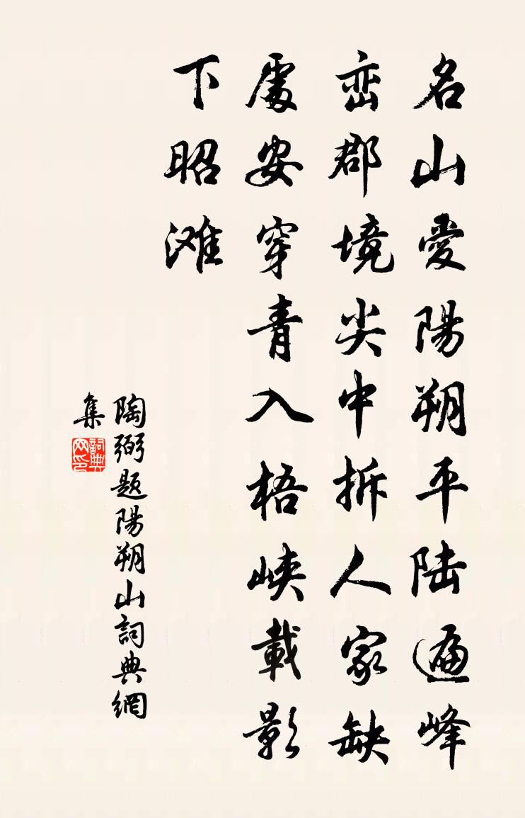 詩詞名句歷史字典書法欣賞書法字典國語詞典說文解字康熙字典古漢語字典標 題 作 者 詩 句 題陽朔山作者:陶弼 朝代:宋代題陽朔山原文名山愛陽朔,平陸遍峰巒。郡境尖中拆,人家缺處安。穿青入梧峽,載影下昭灘。詩詞問答問:題陽朔山的作者是誰?答:陶弼問:題陽朔山寫於哪個朝代?答:宋代陶弼題陽朔山書法欣賞題陽朔山書法作品詩詞推薦八月二十日與館中同舍游西湖作葛立方〔宋代〕跨馬綠楊堤,左右臨無地。鞭影墮清泚,烏帽入花翠。老龍拿半空,九里作青吹。聞聲類擊竹,心與景相值。許由南華洞呂願中〔宋代〕亂崖深峭水淙幽,六夏來游儼似秋。安得蘧蘧一覺夢,倚岩栩栩訪莊周。曉行巴峽王維〔唐代〕際曉投巴峽,餘春憶帝京。晴江一女浣,朝日眾雞鳴。水國舟中市,山橋樹杪行。登高萬井出,眺迥二流明。人作賜靈隱住持德光宋孝宗〔宋代〕大暑流金石,寒風結凍雲。梅花香度遠,自有一枝春。尉侄寄百雀圖劉克莊〔宋代〕猶子知余嗜,封來半尺綃。誰將一兔穎,寫作百鷦鷯。具體侔針粟,卑飛集葦苕。笑他九萬里,辛苦上雲霄。和陶停雲吳芾〔宋代〕眷茲衡宇,草樹溟濛。坐對五柳,遙望九江。亦足寄傲,東軒南窗。獨恨無人,載酒相從。相思橋錢聞詩〔宋代〕道術相忘過眼休,要將此意味莊周。橋邊莫起相思念,恐使遊人錯路頭。賦得胥台露庾抱〔唐代〕胥台既落構,荊棘稍侵扉。棟拆連雲影,梁摧照日暉。翔軍鳥逐不及,巢燕反無歸。唯有團階露,承曉共沾衣。贈邵邦傑真德秀〔宋代〕五寸管能摹造化,七弦琴解寫人心。平生不作麒麟夢,且聽高山流水音。燒藥圖唐寅〔明代〕人來種杏不虛尋,彷佛廬山小徑深。常向靜中參大道,不因忙裡慶清呤。願隨化雨之春澤,未許雲間一片心。老我王中奉漢老輓詞韓元吉〔宋代〕符節光華二十春,壯猷曾不侍嚴宸。棲心香火才同社,放意溪山幸卜鄰。再世簪纓宜袞袞,一門蘭玉尚詵詵。霜清秋晚途次坊州界寄崔玉員外武元衡〔唐代〕崎嶇崖谷迷,寒雨暮成泥。征路出山頂,亂雲生馬蹄。望鄉程杳杳,懷遠思淒淒。欲識分麾重,孤城萬壑西。詠史下五王陳普〔宋代〕太宗社稷是誰亡,獨向迎仙斬二張。景運門前方議事,殺身不必咎扶陽。陪諸公登南樓啜新茶家弟出建除體詩諸公既和陳與義〔宋代〕建康九醖羙,侑以八品珍。除瘴去熱惱,與茶不相親。滿月墮九天,紫面光磷磷。平生酪奴謗,脈脈氣未申。定論朝中措周紫芝〔宋代〕作長短句以招之大江流處是廬峰。蒼玉照晴空。何事淺鬟濃黛,卻成煙雨溟濛。如今縱有,雲濤萬頃,翠巘千重。同汪正夫行夫望鄱江劉子翬〔宋代〕夜夢鄱江清,曉踏鄱陽縣。雲濤著眼新,還疑夢中見。寒聲彭蠡合,凍色廬峰現。時方冬氣深,水縮川原變。連沙丈人觀謁先帝御容徐氏〔唐代〕聖帝歸梧野,躬來謁聖顏。旋登三徑路,似陟九嶷山。日照堆嵐迥,雲橫積翠間。期修封禪禮,方俟再躋攀。胡明仲潭溪三日飲劉子翬〔宋代〕潭溪梧竹堆,無地浮高蔭。暑中猶未佳,袒膊俯清深。急雨翳幽芬,空山落啼鵀。村醪得舊燒,時果出寒沈。醺然楚東歲暮吳錫疇〔宋代〕樓高霜冷漏聲遲,獨立闌乾憶別離。明月一奩磨後鏡,疏星幾點劫殘棋。歲寒時節難為客,老日頭顱盡付詩。頗覺祝英台近(和辛稼軒“寶釵分”韻)吳潛〔宋代〕霧霏霏,雲漠漠,新綠漲幽浦。夢裡家山,春透一犁雨。傷心塞雁回來,問人歸未,怎知道、蝸名留住。鏡中覷。名句推薦天涯海角悲涼地,記得當年全盛時。趙鼎《鷓鴣天·建康上元作》 春朝秋夜思君甚,愁見繡屏孤枕。魏承班《滿宮花·雪霏霏》 志意修則驕富貴,道義重則輕王公。荀子《荀子·修身》 東武望餘杭,雲海天涯兩渺茫。蘇軾《南鄉子·和楊元素時移守密州》 相識滿天下,知心能幾人?佚名《增廣賢文·上集》 冷艷全欺雪,余香乍入衣。丘為《左掖梨花》 人生如夢,一尊還酹江月蘇軾《念奴嬌·赤壁懷古》 相逢秋月滿,更值夜螢飛。王績《秋夜喜遇王處士》 芙蓉金菊斗馨香。天氣欲重陽。晏殊《訴衷情·芙蓉金菊斗馨香》 玉不琢,不成器;人不學,不知道。戴聖《禮記·學記》