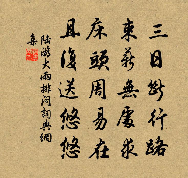 詩詞名句歷史字典書法欣賞書法字典國語詞典說文解字康熙字典古漢語字典標 題 作 者 詩 句 大雨排悶作者:陸游 朝代:宋代大雨排悶原文三日斷行路,束薪無處求。床頭周易在,且復送悠悠。詩詞問答問:大雨排悶的作者是誰?答:陸游問:大雨排悶寫於哪個朝代?答:宋代問:陸游的名句有哪些?答:陸游名句大全陸游大雨排悶書法欣賞大雨排悶書法作品詩詞推薦長乾里羅必元〔宋代〕山壠中間號曰乾,此乾長里盛衣冠。想應王謝朝回後,日日行人看繡鞍。秋枝如殘人王安石〔宋代〕秋枝如殘人,顏色先憔悴。微寒吹已空,性命一何脆。寧當記疇昔,葩葉相嫵媚。歲行誰使然,好殺豈天意。偈頌一百零四首釋紹曇〔宋代〕道無可成,法無可說。黃面瞿曇,重重敗缺。家醜豈容外泄,剛被兒孫告訐。圖形畫影與人看,乳竇門風添暖熱。織婦詞鮑溶〔唐代〕百日織彩絲,一朝停杼機。機中有雙鳳,化作天邊衣。使人馬如風,誠不阻音徽。影響隨羽翼,雙雙繞君飛。行人同兄長賦朝雞宋祁〔宋代〕雕籠摧羽就羈棲,心識昕朝候不迷。群鶴在軒皆有祿,夫君何事獨先啼。詩盧諶〔魏晉〕凜凜素秋。日促宵長。題陳景說詩稿後陳鑒之〔宋代〕今人宗晚唐,琢句亦清好。碧海掣長鯨,君慕杜陵老。春曉東郊送客陸游〔宋代〕雨餘氣清潤,迨我送客時。翻翻車蓋風,五里城東陂。初旭斂花房,晨露流桐枝。南山卷濕翠,更覺光景奇。澄潭臨江仙晁補之〔宋代〕自古齊山重九勝,登臨夢想依依。偶來恰值菊花時。難逢開口笑,須插滿頭歸。昨夜一江風色好,平明秋浦帆飛。野人李覯〔宋代〕村落蒼茫半草茅,路無車轍水無橋。婚姻取足唯春繭,鹽酪歸來待晚樵。一樣寬衣疑效古,幾人華發未經徭。相逢天仙子程垓〔宋代〕慘慘霜林冬欲盡。又是溪梅寒弄影。矮窗曲屋夜燒香,人已靜。燈垂燼。點滴芭蕉和雨聽。約個歸期猶未定。一夜冬日宴於庶子宅各賦一字得趣令狐德棻〔唐代〕高門聊命賞,群英於此遇。放曠山水情,留連文酒趣。夕煙起林蘭,霜枝殞庭樹。落景雖已傾,歸軒幸能駐。題耿氏溫清堂上官均〔宋代〕遠山終日自清輝,縹緲喬林野氣微。秋菊已開陶令徑,春風好舞老萊衣。溪頭釣艇資閒興,松下歸禽伴息機。吟倚別張粵南夫溫子堅元白滿執中子權黃冀端微王令〔宋代〕始吾得三滿,自謂得過人。一日不見之,已恐愚賤濱。憂思叢中來,腹腸生毛鱗。輕舟刺而南,久結願解伸。入門月下聞桂花陳起〔宋代〕一庭人靜月當空,桂不多花細細風。香露滴衣涼似水,恍然移下廣寒宮。小至三詩呈景回制乾並簡同官吳潛〔宋代〕六十三餘七十翁,頗從靜里得些工。陰陽理向塵塵見,天地心於物物同。荔挺生來元不死,葭灰塞處自能通。古今宴玉津園江樓七首任希夷〔宋代〕浙江天闕下,婆惡祖龍知。在漢如西渭,於周比右伊。梅雨陂澤皆滿陸游〔宋代〕雨暗迷行路,溪深沒舊痕。汪汪牛湩白,盎盎酒醅渾。暖浸千畦稻,橫通十里村。群蛙更堪笑,鼓吹鬧黃昏。過漁浦王冕〔元代〕十八里河船不行,江頭日日問潮生。未同待詔於金馬,卻異看花在錦城。萬里春風歸思好,四更寒雨一燈明。故人瑞鶴仙(春日詠懷)仲並〔宋代〕試六花院落。正柳綿飄墜,因風無著。吳王舊城郭。記烏衣門巷,小橋簾幕。他州寥索。漫等閒、桃英杏萼。認幽名句推薦何日歸家洗客袍?銀字笙調,心字香燒。蔣捷《一剪梅·舟過吳江》 雲霞出海曙,梅柳渡江春。杜審言《和晉陵陸丞早春遊望》 劍外忽傳收薊北,初聞涕淚滿衣裳。杜甫《聞官軍收河南河北》 功遂身退,天之道老子《老子·道經·第九章》 勸我早還家,綠窗人似花。韋莊《菩薩蠻·紅樓別夜堪惆悵》 何方可化身千億,一樹梅花一放翁。陸游《梅花絕句·其一》 採蓮南塘秋,蓮花過人頭。佚名《西洲曲》 恩宜自淡而濃,先濃後淡者人忘其惠洪應明《菜根譚·概論》 舍其所爭,取其所棄,不亦君子乎?王通《中說·卷四·事君篇》 可惜一片清歌,都付與黃昏。黃孝邁《湘春夜月·近清明》