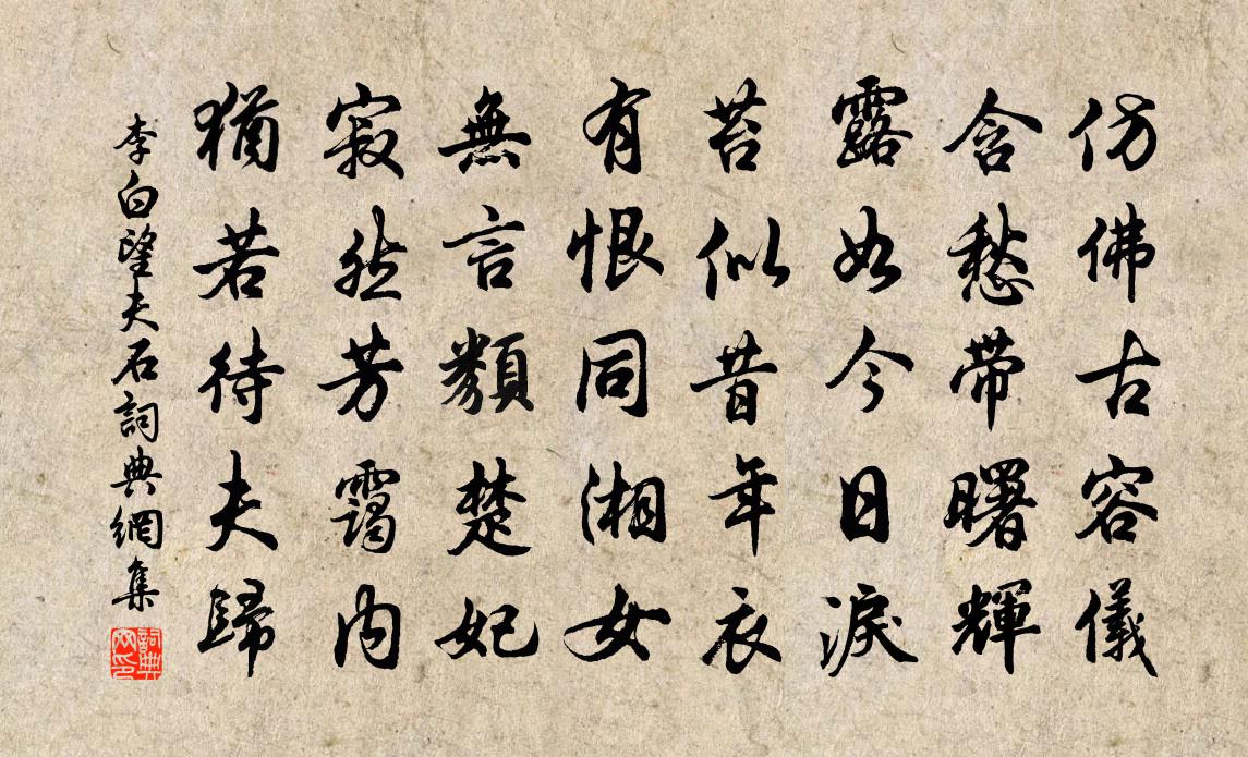 仿佛古容儀,含愁帶曙輝。露如今日淚,苔似昔年衣。