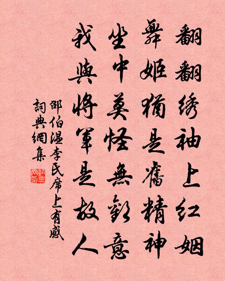 詩詞名句歷史字典書法欣賞書法字典國語詞典說文解字康熙字典古漢語字典標 題 作 者 詩 句 李氏席上有感作者:邵伯溫 朝代:宋代李氏席上有感原文翻翻繡袖上紅姻,舞姬猶是舊精神。坐中莫怪無歡意,我與將軍是故人。詩詞問答問:李氏席上有感的作者是誰?答:邵伯溫問:李氏席上有感寫於哪個朝代?答:宋代邵伯溫李氏席上有感書法欣賞李氏席上有感書法作品詩詞推薦江城子 游孫園張之翰〔元代〕丹青畫出小亭台。巧安排。絕塵埃。二十年間,成此亦奇哉。借問主人凡幾醉,直到老,不曾來。來鶯去燕莫相猜釣台李廌〔宋代〕此地有天險,雙台千仞岡。眼寬知世窄,望極使神傷。慘澹諸峰立,縈紆一水長。振衣懷古罷,新句入陽斜。早起方回〔宋代〕萬事崢嶸入夜思,稍欣無病且無飢。山田望稔秋收近,暑月乘涼早起宜。暗捻須髯驚露濕,倦爬疥癬喜風吹。買薪題思范軒二首張伯玉〔宋代〕天下儒宗不世勛,履聲今絕豈重聞。空餘逸韻傳流水,猶喜清風在此君。山倚孔祠分積翠,篆尋嚴瀨掛香雲。接花市橋月色家鉉翁〔宋代〕今夜鯨川月色明,臥煙虹影正橫陳。市橋得月喧簫鼓,堪羨溪橋覓句人。與王郎昆仲及兒子邁,遶城觀荷花,登峴山亭蘇軾〔宋代〕苕水如漢水,鱗鱗鴨頭青。吳興勝襄陽,萬瓦浮青冥。我非羊叔子,愧此峴山亭。悲傷意則同,歲月如流星。從我寄題江渙長官南園茅齋蘇轍〔宋代〕白髮辛勤困小邦,塵勞坐使壯心降。河陽罷後成南圃,彭澤歸來臥北窗。畦畔草生親荷鍤,床頭酒熟自傾缸。因君偈頌二十一首釋堅璧〔宋代〕玉象吞獅子,泥牛上繡鞍。御樓觀射獵,不是刈茆田。融堂對月錢時〔宋代〕蠻觸封疆奈若何,天公老眼自驅磨。六窗洞徹無遮障,此夜融堂得月多。游何山釋紹嵩〔宋代〕綠草閒深院,繁花的的開。捲簾當白晝,辭洞戀青苔。燕掠平蕪去,人從瀑布來。林間清話久,杜宇一聲催。王文孺臞庵王銍〔宋代〕全家高隱白雲關,事不索懷夢亦閒。欸乃交撐漁市散,隔江城郭是人間。孤山問梅胡仲弓〔宋代〕每到山邊與水邊,有梅花處憶逋仙。湖光清淺黃昏月,招得先生在眼前。春夜聽客彈琵琶,作《隋唐評話》。陳維崧〔清代〕雨滴梅梢,雪消蕙葉,入春難得今宵暇。倩他銀甲淒清,鐵撥縱橫,聲聲迸碎鴛鴦瓦。依稀長樂夜烏啼,分明湓浦挽章朋舉高翥〔宋代〕相逢便拜十年兄,自此交遊得盡情。草紙抄書傳遁甲,竹筩沽酒命添丁。他時結屋期來往,今日登門隔死生。從此春日即事俞桂〔宋代〕春入侯家春事深,日長庭院又沉沉。客中不耐如絲雨,攪起思家寸寸心。八月十日夜看月有懷子由並崔度賢良蘇軾〔宋代〕宛丘先生自不飽,更笑老崔窮百巧。一更相過三更歸,古柏陰中看參昴。去年舉君苜蓿盤,夜傾閩酒赤如丹。今年皇后閣春帖子趙湘〔唐代〕暖日暉暈動,清渠泱泱流。六宮修歲事,拂拭採桑鉤。題李公麟山莊圖建德館蘇轍〔宋代〕龍眠淥淨中,微吟作雲雨。幽人建德居,知是清風主。五靈妙仙 贈眾道友馬鈺〔元代〕馬風重懇告,諸公道友。休迷假、內容堪守。要長久。用真功全在,清心淨意,擒猿捉馬,休令暫時遊走。得無漏南池晨望羊士諤〔唐代〕起來林上月,瀟灑故人情。鈴閣人何事,蓮塘曉獨行。衣沾竹露爽,茶對石泉清。鼓吹前賢薄,群蛙試一鳴。名句推薦不忍登高臨遠,望故鄉渺邈,歸思難收。柳永《八聲甘州·對瀟瀟暮雨灑江天》 智者千慮,必有一失;愚者千慮,必有一得。司馬遷《史記·淮陰侯列傳》 君臣無禮,而上下無別。劉向《戰國策·齊六·貂勃常惡田單》 相呼相應湘江闊,苦竹叢深日向西。鄭谷《鷓鴣》 關關雎鳩,在河之洲。窈窕淑女,君子好逑。佚名《關雎》 年方少,勿飲酒。飲酒醉,最為醜。李毓秀《弟子規·謹》 帝里重清明,人心自愁思。孟浩然《清明即事》 林花著雨胭脂濕,水荇牽風翠帶長。杜甫《曲江對雨》 美人贈我錦繡段,何以報之青玉案。張衡《四愁詩》 惜別浮橋駐馬時,舉頭試望南山嶺。李頎《少室雪晴送王寧》