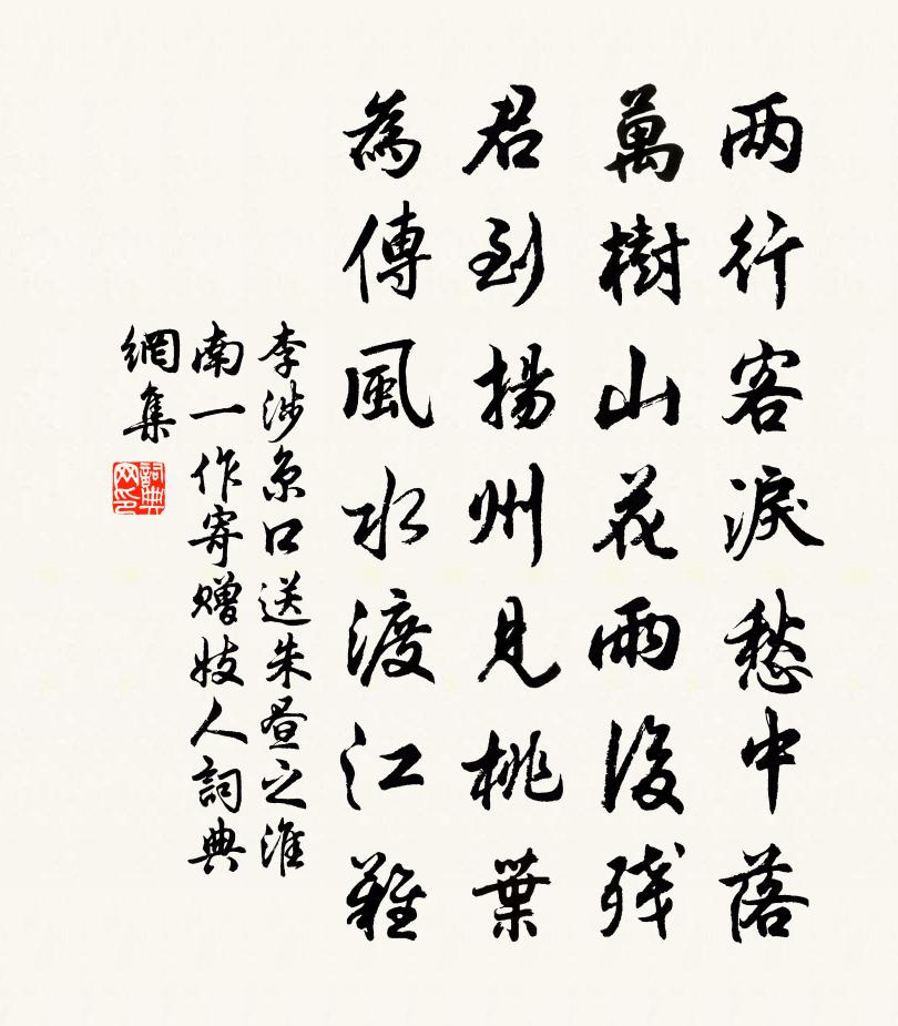 詩詞名句歷史字典書法欣賞書法字典國語詞典說文解字康熙字典古漢語字典標 題 作 者 詩 句 京口送朱晝之淮南(一作寄贈妓人)作者:李涉 朝代:唐代原文兩行客淚愁中落,萬樹山花雨後殘。君到揚州見桃葉,為傳風水渡江難。詩詞問答問:《京口送朱晝之淮南(一作寄贈妓人)》的作者是誰?答:李涉問:該詩寫於哪個朝代?答:唐代問:該詩是什麼體裁?答:七絕書法欣賞京口送朱晝之淮南(一作寄贈妓人)書法作品注釋全唐詩:卷477-21詩詞推薦小園早步趙蕃〔宋代〕今朝欣雨止,天氣漸清和。籬落小桃破,階除馴雀多。占方移果樹,帶土數蔬科。農務侵尋及,吾寧久臥疴。春霽朱淑真〔宋代〕淡淡輕寒雨後天,柳絲無力妥殘煙。弄晴鶯舌於中巧,著雨花枝分外妍。消破舊愁憑酒盞,去除新恨賴詩篇。年年次韻嚴上舍讀書目昏陳造〔宋代〕聲利營營閱蜚電,人生悲歡更幾遍。群兒沈迷如病酲,尚念醇醪夢酣醼。吾儕較之唯阿爾,書淫僅逃紅綠眩。短檠句程敦厚〔宋代〕味重帶新馳驛貢,花旌難老隔年芳。南園夜宿有懷曹勛〔宋代〕老病杜門久,佳時誰與過。親朋懷我少,風月向人多。梅景橫清夜,江聲動白波。不如潮早晚,牆外聽漁歌。寄韓君表晁說之〔宋代〕別離何用愁天涯,塵世來由百感賒。白雪恨難逢柳絮,東風悔不識梅花。詩書異戶作何有,將相同時君莫夸。聞道相對岡方信孺〔宋代〕海門高並兩峰寒,大艑輕帆自往還。安得百靈移一島,卻教塵世看三山。送吳侍御司馬赴台州武元衡〔唐代〕盧耽佐郡遙,川陸共迢迢。風景輕吳會,文章變越謠。煙林繁橘柚,雲海浩波潮。余有靈山夢,前君到石橋。讀親征詔楊冠卿〔宋代〕君王神武不恬兵,氣讋中原一掃平。可笑西江喜歸客,便裝行橐待還京。送任師中任清江蘇洵〔宋代〕吾喜送任師,羨君方少年。有如伏櫪馬,看彼始及鞍。奔騰過吾目,蕭條正思邊。誰知脫吾羈,傲睨登太山。君今和劉原甫平山堂見寄歐陽修〔宋代〕督府繁華久已闌,至今形勝可躋攀。山橫天地蒼茫外,花發池台草莽間。萬井笙歌遺俗在,一◇風月屬君閒。遙知四和項安世〔宋代〕考留飀飀似見,談王易易如閒。政爾盛之馨處,臥龍恰稱茲山。山居雜詩九十首曹勛〔宋代〕熅室宿火銷,緼袍良獨暖。病身怯夜永,老懷苦晝短。棲鳥驚檐頭,朝日上窗眼。未問粥面花,地黃酒須滿。逍遙詠宋太宗〔宋代〕伏藏終不見,巧拙是兼非。至道光懷古,周通隱聖機。清天何物性,濁地故相依。修煉真堪惜,疏慵有順違。清平樂(李漕生日)史浩〔宋代〕池台非霧。縹緲雙溪路。家在江南佳麗處。看取謝公風度。蟠桃酒醞千秋。金焦欲上遲留。笑待錦花裀上,雙鸞舞游黃薜山三首倪思〔宋代〕歷險捫高無路尋,亂山窮處是禪林。誰知學道須辭世,真要入山如許深。七娘子王灼〔宋代〕花明霧暗非花霧。似春屏、短夢無憑據。夜月將來,曉燈催去。半衾餘暖空留住。情柔意密愁千縷。想一聲、雞唱寄十二侄陸游〔宋代〕庚寅吾入蜀,西過齊安城。雪堂拜老仙,眉宇寒崢嶸。微泉尚如昔,激激琴築聲。龍蛇入筆力,斷石臥縱橫。戊戌登真觀在利州嘉川縣西五里南臨宋江相傳雲張張嵲〔宋代〕天師羽化久,殊館臨官道。系馬松門深,風清亂蟬噪。開基今幾時,庭樹皆連抱。有池號遺履,無地尋丹灶。金像梅花潘良貴〔宋代〕氣欲崢嶸歲欲新,寒梅方信冠群倫。直能平地凌封雪,可是回根迎小春。九畹蕙蘭真上客,千山桃李盡庸人。即今名句推薦君子處小人,必平其氣以待之,不可稍形激切也。王永彬《圍爐夜話·第三三則》 不怕官,只怕管。施耐庵《水滸傳·第二回》 嚴妝欲罷囀黃鸝,飛上萬年枝。和凝《喜遷鶯·曉月墜》 可憐繡戶侯門女,獨臥青燈古佛旁。曹雪芹《紅樓夢·第五回》 青山遮不住,畢竟東流去辛棄疾《菩薩蠻·書江西造口壁》 君去滄江望澄碧,鯨鯢唐突留餘跡。李白《赤壁歌送別》 松竹翠蘿寒,遲日江山暮。曹組《卜運算元·蘭》 君子之言寡而實,小人之言多而虛。劉向《說苑·談叢》 漉我新熟酒,只雞招近局。陶淵明《歸園田居·其五》 丹砂成黃金,騎龍飛上太清家,雲愁海思令人嗟。李白《飛龍引二首·其一》