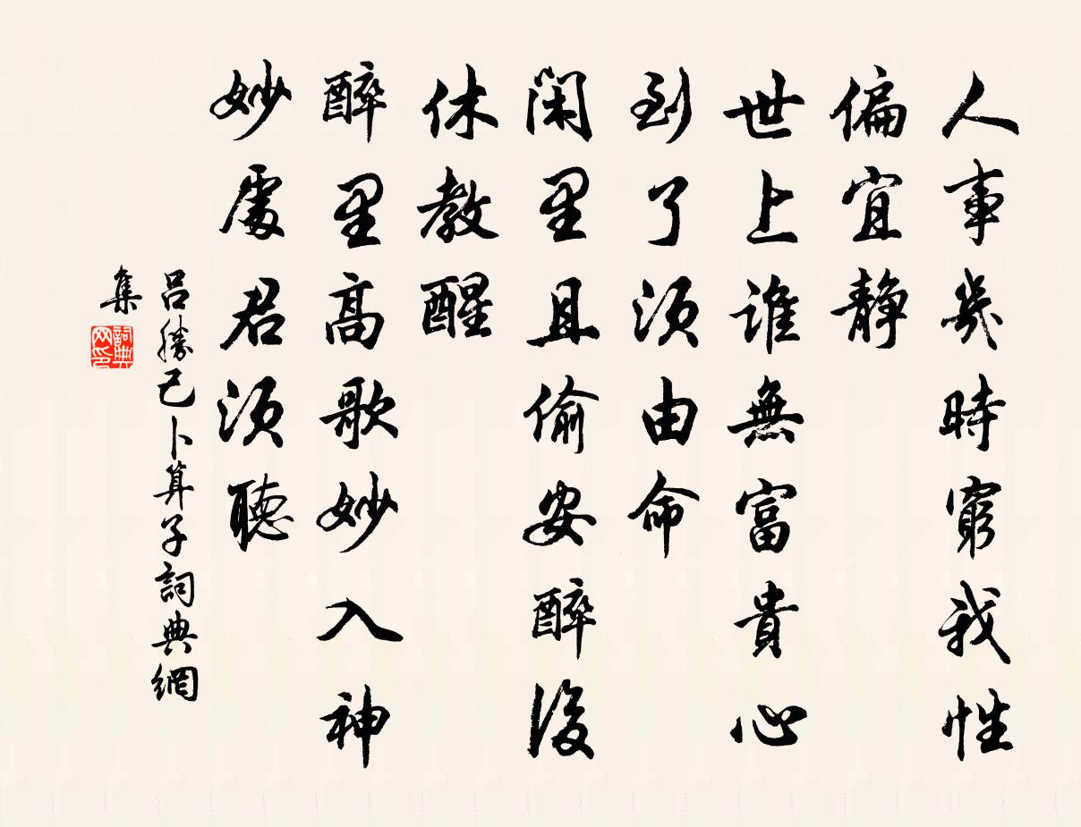 詩詞名句歷史字典書法欣賞書法字典國語詞典說文解字康熙字典古漢語字典標 題 作 者 詩 句 卜運算元作者:呂勝己 朝代:宋代卜運算元原文人事幾時窮,我性偏宜靜。世上誰無富貴心,到了須由命。閒里且偷安,醉後休教醒。醉里高歌妙入神,妙處君須聽。詩詞問答問:卜運算元的作者是誰?答:呂勝己問:卜運算元寫於哪個朝代?答:宋代問:卜運算元是什麼體裁?答:詞呂勝己卜運算元書法欣賞卜運算元書法作品詩詞推薦失題胡仲弓〔宋代〕年來古道不堪行,盡避君廚俊傑名。莫枉錐刀鞭算手,且調金石擊撞聲。暮秋會嚴京兆後廳竹齋岑參〔唐代〕京兆小齋寬,公庭半藥闌。甌香茶色嫩,窗冷竹聲乾。盛德中朝貴,清風畫省寒。能將吏部鏡,照取寸心看。竹影寄饒雲叟鄧深〔宋代〕別來每辱遺雙鯉,頗怪於儂不作書。非為廣文官獨冷,自緣中散性常疏。靜暈待月昏鍾後,制勝登高曉雨餘。正憶題九曲尼院黃順之〔宋代〕曾是霓裳第一人,曲終認得本來身。多年不作東風夢,閒卻薔薇一架春。因書寄黃子耕六言三首趙蕃〔宋代〕自失孤山杯酒,兩年相望梅花。交友平生幾許,差池重複成嗟。眼兒媚趙長卿〔宋代〕連滄危觀暮江前。幾醉使君筵。少年俊氣,曾將吟筆,買斷江天。重來細把朋游數,回首一辛酸。蘭成已老,文園金桃文同〔宋代〕雨染煙蒸萬實垂,丹原為骨菊為衣。客疑麗水新淘得,人向瑤池舊帶歸。只恐壓枝星欲落,最憐和葉露初晞。銀瓜京師阻雨二首張耒〔宋代〕大雨三日泥三尺,駿馬高車行不得。我有蹇驢安敢騎,閉戶高眠朝至夕。誰家高堂半夜秋,軟綺輕紈換絺綌。朱門過菊江亭于謙〔明代〕杖履逍遙五柳旁,一辭獨擅晉文章。黃花本是無情物,也共先生晚節香。華隱樓曾極〔宋代〕松聲只罷獨看雲,華隱樓中探鶴身。治國神方難自獻,祗將本草語時人。鈿帶長中腔万俟詠〔宋代〕簇真香。似風前拆麝囊。嫩紫輕紅,間鬥異芳。風流富貴,自覺蘭蕙荒。獨占蕊珠春光。繡結流蘇密織,魂夢悠揚和楊弘微春日曲江南望武元衡〔唐代〕遲景靄悠悠,傷春南陌頭。暄風一澹蕩,遐思幾殷憂。龍去空仙沼,鸞飛掩妓樓。芳菲餘雨露,冠蓋舊公侯。朱戟和子直聞運使兵部駐節京口寄呈如晦陳襄〔宋代〕南徐新政煥秋陽,九日登臨喜觴。送酒客尋方外士,觀風人是省中郎。千家弦管聞謠俗,萬頃湖山入燕堂。使節未與太常丞丁晦甫敖陶孫〔宋代〕負昔嘗為李公客,坐覺金氣肅東南。鉤間棘句護帖妥,獨立卻視何巘巘。此公行世有步里,十不五試驚愚凡。尺書文徵明山水乾隆〔清代〕憑欄俯層閣,空闊恰怡神。祛暑松蔭老,點秋楓葉新。高山森犖嶨,流水淨漣淪。佳客攜琴至,應為同調人。登應天塔劉學箕〔宋代〕雲級涌青冥,金鰲載寶輪。地高心自逸,天近足無塵。圖畫千峰晚,樓台萬井春。三生許元度,曾此證前身。洛中人語佚名〔宋代〕昔婁師德園,今袁德師樓。攜手曲沈約〔南北朝〕舍轡下雕輅。更衣奉玉床。斜簪映秋水。開鏡比春妝。所畏紅顏促。君恩不可長。鵁冠且容裔。豈吝桂枝亡。宿雲邊感懷劉宰〔宋代〕虛館怯朝寒,幽寒不可續。展轉復展轉,萬感起心曲。世塗嗟枘鑿,親養悲風木。悔往舌噬臍,念來弓擬鵠。悠悠子吳子某既結茆竹洲以娛親復於居之前沼為亭吳儆〔宋代〕抱瓮自灌園,勝游貴人門。有口自酌酒,勝與俗人言。園中多蔓草,晨夕費鋤芟。遇夜或風雨,安得久盤旋。村酒名句推薦貴出如糞土,賤取如珠玉。司馬遷《史記·貨殖列傳》 東望鞭芙縹緲,寒光如注。劉辰翁《桂枝香· * 人去》 高館張燈酒復清,夜鍾殘月雁歸聲。高適《夜別韋司士》 春雲吹散湘簾雨,絮黏蝴蝶飛還住。納蘭性德《菩薩蠻·春雲吹散湘簾雨》 畫閣朱樓盡相望,紅桃綠柳垂檐向。王維《洛陽女兒行》 反者道之動;弱者道之用。天下萬物生於有,有生於無。老子《老子·德經·第四十章》 二月江南花滿枝,他鄉寒食遠堪悲。孟雲卿《寒食》 江天一色無纖塵,皎皎空中孤月輪。張若虛《春江花月夜》 寄語東陽沽酒市,拼一醉,而今樂事他年淚。朱服《漁家傲·小雨纖纖風細細》 江闊雲低、斷雁叫西風。蔣捷《虞美人·聽雨》