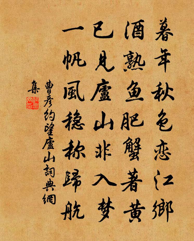詩詞名句歷史字典書法欣賞書法字典國語詞典說文解字康熙字典古漢語字典標 題 作 者 詩 句 望廬山作者:曹彥約 朝代:宋代望廬山原文暮年秋色戀江鄉,酒熟魚肥蟹著黃。已見廬山非入夢,一帆風穩稱歸航。詩詞問答問:望廬山的作者是誰?答:曹彥約問:望廬山寫於哪個朝代?答:宋代曹彥約望廬山書法欣賞望廬山書法作品詩詞推薦洞仙歌(為葉丞相作)辛棄疾〔宋代〕江頭父老,說新來朝野。都道今年太平也。見朱顏綠鬢,玉帶金魚,相公是,舊日中朝司馬。遙知宣勸處,東閣華寄張徵古沈如筠〔唐代〕寂歷遠山意,微冥半空碧。綠蘿無冬春,彩雲竟朝夕。張子海內奇,久為岩中客。聖君當夢想,安得老松石。偈頌十八首釋如淨〔宋代〕衲僧拄杖子,漫漫黑似煙。西湖九個月,可惡亦堪憐。忽然飛過鄞江去,攪動滄溟浪拍天。偈傾一百六十九首釋智朋〔宋代〕大海一漚,未發已前。坤六段,乾三連。擬欲眨眼,驢牛驢牛。守歲五首薛嵎〔宋代〕明日焚香叩九關,六旬修未到清閒。莫憐身在塵中老,雪後騎驢亦看山。贈答晁次膺黃庭堅〔宋代〕次膺豪健如霜鶻,空拳誤掛田犬牙。果輸司空城旦作,付與步兵廚人家。野馬橫郊作凝水,牽牛引竹上寒花。無酒東園探桃李二首楊萬里〔宋代〕偶逢李徑一花開,從此東園日日來。更約桃花同坼好,紅紅白白兩相催。明皇楊億〔宋代〕玉牒開觀檢未封,鬥雞三百遠相從。紫雲度曲傳浮世,白石標年鑿半峰。河朔叛臣驚舞馬,渭橋遺老識真龍。蓬山暇日偶題四錫〔宋代〕年來吟鬢已星星,烏石谿邊葉又零。簾下孤燈刪草奏,窗間疊嶂讀茶經。瘴鄉怕襲山嵐毒,野艇嫌沖水霧腥。天末傾杯令/傾杯樂呂渭老〔宋代〕隔座藏鉤,分曹射覆,燭艷漸催三鼓。箏按教坊新譜。樓外月生春浦。徘徊爭忍忙歸去。怕明朝、無情風雨。珍花邊城柳劉皂〔唐代〕一株新柳色,十里斷孤城。為近東西路,長懸離別情。再宿京口禪院棲蟾〔唐代〕灘聲依舊水溶溶,岸影參差對梵宮。楚樹七回凋舊葉,江人兩至宿秋風。蟾蜍竹老搖疏白,菡萏池乾落碎紅。多病江畔老人愁崔顥〔唐代〕江南年少十 * ,乘舟欲渡青溪口。青溪口邊一老翁,鬢眉皓白已衰朽。自言家代仕梁陳,垂朱拖紫三十人。兩朝柳梢青(元宵何高士說京師舊事)張孝祥〔宋代〕今年元夕。探盡江梅,都無訊息。草市梢頭,柳莊深處,雪花如席。一尊鄰里相過,也隨分、移時換節。玉輦端門採桑曲武衍〔宋代〕粉光薄薄髻雲垂,葉滿湘籠獨步時。女伴未來歸未得,水邊閒照插花枝。句晃逈〔宋代〕葉外應無葉,心中更有心。訴衷情(春情)仲殊〔宋代〕楚江南岸小青樓。樓前人艤舟。別來後庭花晚,花上夢悠悠。山不斷,水空流,謾凝眸。建康宮殿,燕子來時,多暴雨韓偓〔唐代〕電尾燒黑雲,雨腳飛銀線。急點濺池心,微煙昏水面。氣涼氛祲消,暑退松篁健。叢蓼亞赬茸,擎荷翻綠扇。風期塘邊見古冢詩何遜〔南北朝〕行路一孤墳。路成墳欲毀。空疑年代積。不知陵谷徙。幾逢秋葉黃。驟見春流彌。金蠶不可織。玉樹何時蕋。陌上伏蒙十六叔寄示喜慶感懷三十韻因獻之權德輿〔唐代〕受氏自有殷,樹功緬前秦。圭田接土宇,侯籍相紛綸。道義集天爵,菁華極人文。握蘭中台並,折桂東堂春。祖德名句推薦千尋鐵鎖沉江底,一片降幡出石頭。劉禹錫《西塞山懷古》 法令至行,公平無私劉向《戰國策·秦一·衛鞅亡魏入秦》 窗含西嶺千秋雪,門泊東吳萬里船。杜甫《絕句》 李杜詩篇萬口傳,至今已覺不新鮮。趙翼《論詩五首》 東風吹雨過青山,卻望千門草色閒。盧綸《長安春望》 江漢思歸客,乾坤一腐儒。杜甫《江漢》 千里澄江似練,翠峰如簇。王安石《桂枝香·登臨送目》 都道無人愁似我,今夜雪,有梅花,似我愁。蔣捷《梅花引·荊溪阻雪》 失之東隅,收之桑榆。范曄《後漢書·列傳·馮岑賈列傳》 十分不耐煩,乃為人大病王永彬《圍爐夜話·第五四則》