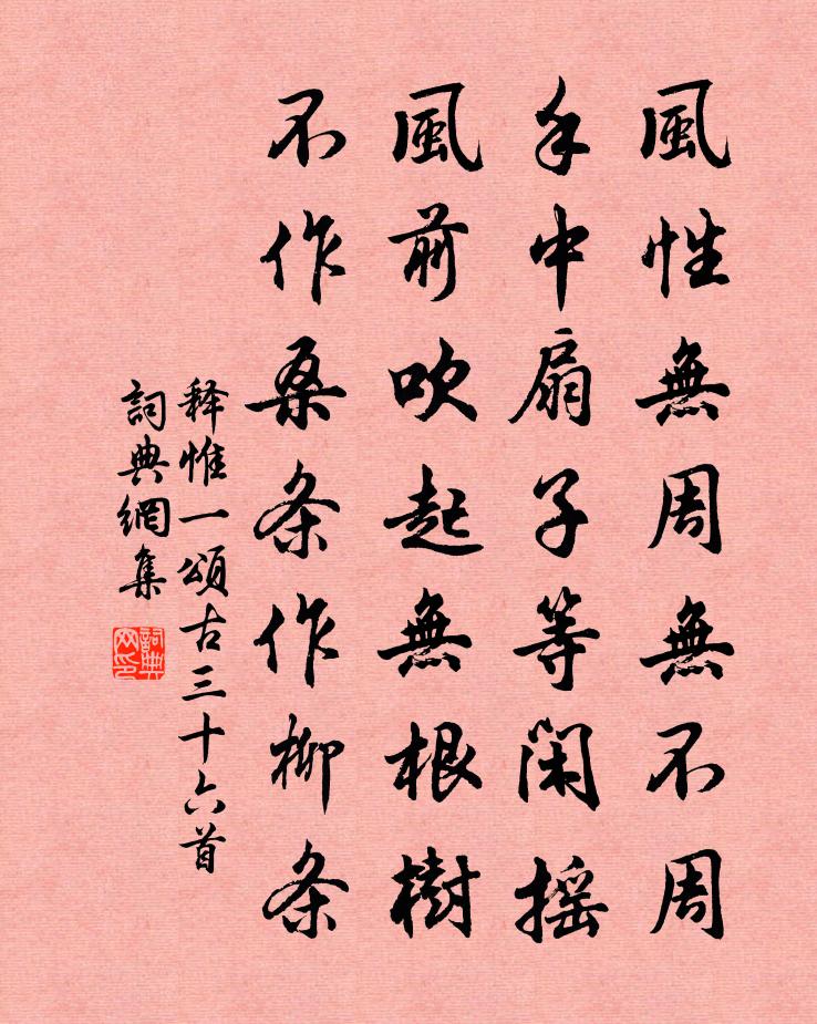詩詞名句歷史字典書法欣賞書法字典國語詞典說文解字康熙字典古漢語字典標 題 作 者 詩 句 頌古三十六首作者:釋惟一 朝代:宋代頌古三十六首原文風性無周無不周,手中扇子等閒搖。風前吹起無根樹,不作桑條作柳條。詩詞問答問:頌古三十六首的作者是誰?答:釋惟一問:頌古三十六首寫於哪個朝代?答:宋代釋惟一頌古三十六首書法欣賞頌古三十六首書法作品詩詞推薦和程德裕頌五首黃庭堅〔宋代〕貧子還家作富兒,糞箕苕帚未曾遺。人人慾問草書意,懷素從來自不知。舟行青溪道中入歙十二首方回〔宋代〕蕨拳欲動茗抽芽,節近清明路近家。五日緩行三百里,夾溪隨處有桃花。次大人韻二首李流謙〔宋代〕六品官資叵厭卑,高懷自不入時宜。卻尋清渭歸垂釣,猶向鈞天憶射麋。長日只憑詩遣悶,暮年全藉酒扶衰。早將水調歌頭(中秋)劉褒〔宋代〕天淡四垂幕,雲細不成衣。西風掃盡繡翳,涼我鬢邊絲。破匣菱花飛動,跨海清光無際,草露滴明璣。杯到莫停手羸駿篇喬知之〔唐代〕噴玉長鳴西北來,自言當代是龍媒。萬里鐵關行入貢,九重金闕為君開,蹀躞朝馳過上苑,走參走覃暝走發章台。句楊炎正〔宋代〕無人語心事。別平江揚元鼎二首陳藻〔宋代〕 * 平進正繞籬,真柑續到蟹偏肥。嘗罷河豚歸楫動,消梅初熟柳花飛。再次前韻朱翌〔宋代〕日走瞿野宅,殷勤問覺圓。荷珠翻雨碎,荇帶逆風牽。安步穿芒屩,長驅斷蠟鞭。臨深呼屬玉,騎氣道蜿蜒。前輩酒泉子·長憶觀潮潘閬〔宋代〕長憶觀潮,滿郭人爭江上望。來疑滄海盡成空。萬面鼓聲中。弄潮兒向濤頭立。手把紅旗旗不濕。別來幾向夢中看送友人歸越連文鳳〔宋代〕把手西風晚菊天,夢魂喚醒十年前。未能個虱談時事,且與持螯上酒船。送曹秀才陳師道〔宋代〕甲第衣冠後,東遷歲月侵。情親期一諾,急病闕千金。孰並還家樂,毋忘在莒心。時能記衰疾,聲跡到雲林。訴衷情(一名桃花水)毛文錫〔唐代〕桃花流水漾縱橫,春晝彩霞明。劉郎去,阮郎行,惆悵恨難平。愁坐對雲屏,算歸程。何時攜手洞邊迎,訴衷情。挽艮岩梅府卿方回〔宋代〕庚午昔同朝,權臣狠且驕。至尊俱芥視,大物遽冰消。密勿毗廊肆,艱難駕使軺。絲毫心有愧,壽肯到今朝。寄新息家叔陳與義〔宋代〕風雨淮西夢,危魂費九升。一官遮日手,兩地讀書燈。見客深藏舌,吟詩不負丞。竹林雖有約,門戶要人興。讀史感興黃文雷〔宋代〕人為五行精,二氣相循環。陽明發天秀,隱約超龍蟠。如何椒蘭芳,苦厄蕭艾繁。良玉必火浴,利刃因崖刓。大鈞和王妙虛道士詩金履祥〔宋代〕我愛高人巧卜居,林煙深處著精廬,煎茶石鼎客當酒,斸筍竹籬自荷鋤。隱几要同吾喪我,鑿池戲問子非魚。高山聽寒更寄朱兵曹巨川皎然〔唐代〕攲枕聽寒更,寒更發還住。一夜千萬聲,幾聲到君處。和遲田舍雜詩九首蘇轍〔宋代〕麥生置不視,麥熟為一來。我懶客亦惰,田荒誰使開。勤事知有獲,直駕獨未回。交遊悉吾病,門巷多蒼苔九日同尤司戶舟行游梅山喻良能〔宋代〕令節逢重九,相攜鑒上游。扁舟游舴艋,左手把蝤蛑。紅葉明青眼,黃花重白頭。晚來風色好,歸棹得夷猶。題葉氏分綠亭艾性夫〔宋代〕山亭種花厭脂粉,純種芭蕉三百本。一心生意展不盡,四面蟠根培自穩。卷舒風日閃流翠,滉滉清陰浸窗戶。煩君名句推薦斜陽照墟落,窮巷牛羊歸。王維《渭川田家》 星月皎潔,明河在天,四無人聲,聲在樹間。歐陽修《秋聲賦》 玉座猶寂寞,況乃妾身輕。謝朓《同謝諮議詠銅雀台》 雲青青兮欲雨,水澹澹兮生煙。李白《夢遊天姥吟留別 / 別東魯諸公》 立身不嫌家世貧賤,但能忠厚老成,所行無一毫苟且處,便為鄉黨仰望之人。王永彬《圍爐夜話·第十七則》 晚鴉飛去,一枝花影送黃昏夏完淳《婆羅門引·春盡夜》 小人錯其在己者,而慕其在天者。荀子《荀子·天論》 舉目山河異,偏傷周顗情。李白《金陵新亭》 不以規矩,不能成方圓孟子《孟子·離婁章句上·第一節》 千古江山,英雄無覓孫仲謀處。辛棄疾《永遇樂·京口北固亭懷古》