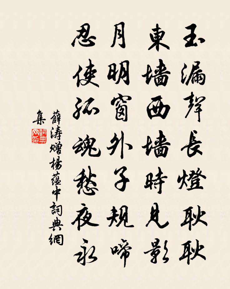 詩詞名句歷史字典書法欣賞書法字典國語詞典說文解字康熙字典古漢語字典標 題 作 者 詩 句 贈楊蘊中作者:薛濤 朝代:唐代贈楊蘊中原文玉漏聲長燈耿耿,東牆西牆時見影。月明窗外子規啼,忍使孤魂愁夜永。詩詞問答問:贈楊蘊中的作者是誰?答:薛濤問:贈楊蘊中寫於哪個朝代?答:唐代問:贈楊蘊中是什麼體裁?答:七絕薛濤贈楊蘊中書法欣賞贈楊蘊中書法作品注釋全唐詩:卷866-45詩詞推薦減字木蘭花蘇軾〔宋代〕江南遊女,問我何年歸得去。雨細風微,兩足如霜挽紵衣。江亭夜語。喜見京華新樣舞。蓮步輕飛。遷客今朝始是理髮二首劉克莊〔宋代〕種種一何短,青青無復垂。可憐髡髦子,不見指冠時。水調歌頭 御河舟中張翥〔元代〕中夜正無寐,何處艫聲來。河聲不堪強聒,更聽雁聲哀。月色依依偏照,霜氣蕭蕭漸緊,何似解離懷。明發吾無策鹿夫人輓詞樓鑰〔宋代〕慶霈疏封日,姑慈不忍違。人方侈君賜,我獨避恩輝。孝篤神應勞,風高家愈肥。新傳快女婿,亦復掛冠歸。守閘書事時已退居五首曹勛〔宋代〕老去惟思徹骨清,便無弱水限仙瀛。士龍猶記當時夢,夢想如今海上城。過黃楊岩鄧肅〔宋代〕朔風夜號空,於喁幾枝木。深山自春色,芳草不凋綠。朋來得佳游,招提藏翠麓。新酒赤如丹,竹萌肥勝肉。一醉送胡仲方二首項安世〔宋代〕鄧林擢乾皆楩梓,丹穴生雛即鳳凰。年少一來無比並,老翁千歲有輝光。幕中潤澤江湖遠,筆下才情錦繡張。未必磨崖碑翟天翼〔宋代〕元公具述魯公書,文象相參翼軫區。語氣一時揚盛德,詞鋒千古挫兇徒。減蘭十梅(風)佚名〔宋代〕東風吹暖。輕動枝頭嬌艷頭。成片驚飛。不是城南畫角吹。香英飄處。定向壽陽妝閣去。莫損柔柯。今日清香遠更二月一日夜夢陸游〔宋代〕夢裡遇奇士,高樓酣且歌。霸圖輕管樂,王道探丘軻。大指如符券,微瑕互琢磨。相知殊恨晚,所得不勝多。勝算倚竹范成大〔宋代〕輕薄人情翻覆手,冰容卻耐幽居久。關中舊事逐春休,付與新人莫回首。目送斜陽忘卻歸,竹風搖曳翠羅衣。君看代贈李商隱〔唐代〕楊柳路盡處,芙蓉湖上頭。雖同錦步障,獨映鈿箜篌。鴛鴦可羨頭俱白,飛去飛來煙雨秋。金錢菊史鑄〔宋代〕陰陽鑄出繞籬邊,露洗風磨色燦然。未解濟貧行世上,且圖買笑向樽前。頤齋聯日有事於琛亭賦詩聊為解嘲胡仲弓〔宋代〕詩人有公事,日日走琛亭。紫翠和衣重,香塵滿面生。蚌還江月濕,龍起浪雲腥。薏苡亦何有,奚囊澈底清。點絳唇(武都靜林寺妙峰亭席上作。假山前引水,激起數尺)毛滂〔宋代〕秀嶺寒青,冷泉凌亂催秋意。佩環聲里。無限真珠碎。嘆我平生,識盡閒滋味。來閒地。為君一醉。萬事浮雲外。約山中友仇遠〔宋代〕望極秋空無片雲,前山歷歷見遙岑。新鴻漸到邊城靜,舊雨不來汀草深。仙李有時曾入夢,伯桃死後少知心。如君失調名佚名〔宋代〕便是監商孟客兒。桃源憶故人 贈老姚先生馬鈺〔元代〕修行先把家緣舍。莫順人情談話。慎勿攀高忽下。休著纖毫假。心猿意馬無令耍。真淨真清幽雅。神氣和調惺灑。微疾陸游〔宋代〕微疾經旬近藥囊,往來巷陌未全妨。時時小雨知春近,處處閒身覺日長。林外鼓歌聞賽廟,懷中茶餅議租桑。兩京新秋獨夜寄戴叔倫方乾〔唐代〕遙夜獨不臥,寂寥庭戶中。河明五陵上,月滿九門東。萬里親朋散,故園滄海空。歸懷正南望,此夕起秋風。名句推薦碧毯線頭抽早稻,青羅裙帶展新蒲。白居易《春題湖上》 美女渭橋東,春還事蠶作。李白《陌上桑》 楊柳青青江水平,聞郎江上唱歌聲。劉禹錫《竹枝詞二首·其一》 要問相思,天涯猶自短。晏幾道《清商怨·庭花香信尚淺》 昔我往矣,楊柳依依。佚名《採薇》 清風徐來,水波不興。蘇軾《前赤壁賦》 終罷斯結廬,慕陶直可庶。韋應物《東郊》 歌沉玉樹,古寺空有疏鍾發。李綱《六么令·次韻和賀方回金陵懷古鄱陽席上作》 歸夢寄吳檣。水驛江程去路長。陸游《南鄉子·歸夢寄吳檣》 日出東南隅,照我秦氏樓。佚名《陌上桑》