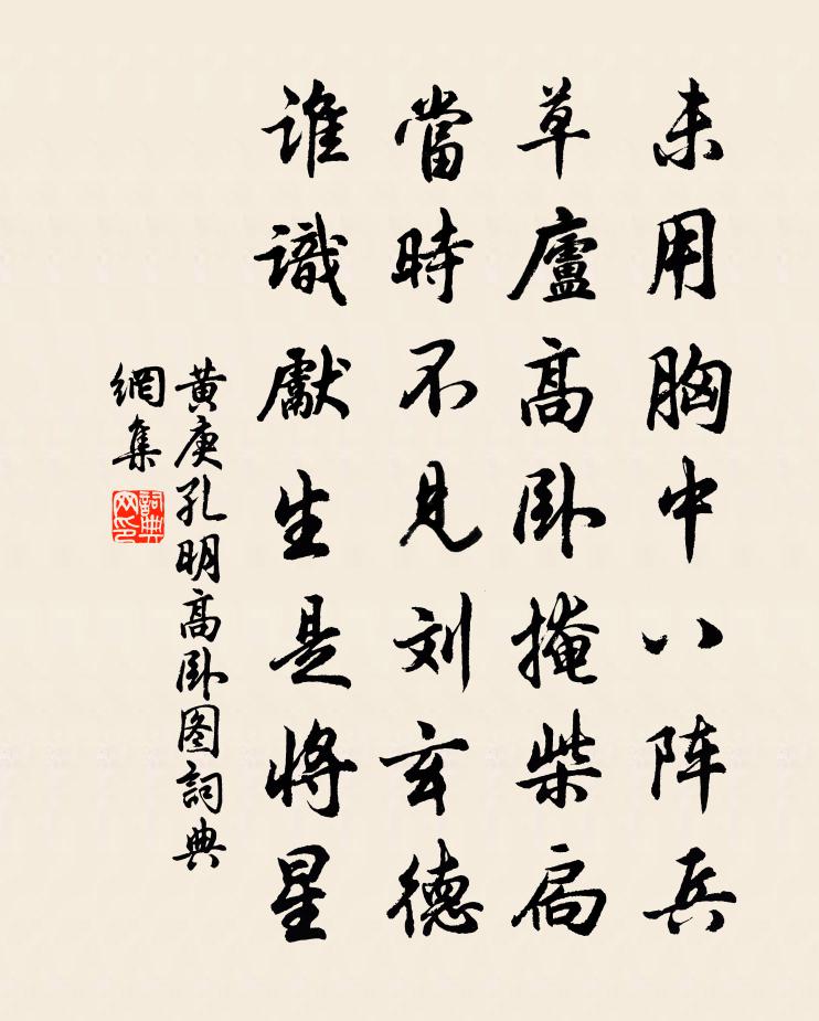 詩詞名句歷史字典書法欣賞書法字典國語詞典說文解字康熙字典古漢語字典標 題 作 者 詩 句 孔明高臥圖作者:黃庚 朝代:宋代孔明高臥圖原文未用胸中八陣兵,草廬高臥掩柴扃。當時不見劉玄德,誰識先生是將星。詩詞問答問:孔明高臥圖的作者是誰?答:黃庚問:孔明高臥圖寫於哪個朝代?答:宋代黃庚孔明高臥圖書法欣賞孔明高臥圖書法作品詩詞推薦高陽台柴元彪〔宋代〕丹碧歸來,天荒地老,駸駸華發相催。見說錢塘,北高峰更崔嵬。瓊林侍宴簪花處,二十年、滿地蒼苔。倩阿誰,西江月張掄〔宋代〕冬至一陽初動,鼎爐光滿簾幃。五行造化太幽微。顛倒難窮妙理。遇此急須進火,速修猶恐遲遲。茫茫何處問天機金縷曲(壽南塘八月生朝)衛宗武〔宋代〕強半秋澄穆。半月弦、南極躔高,壽星明煜。今歲戶庭殊舊歲,洗盡閒愁千斛。沸春夏、歡聲相續。蘭已種成香滿野步至青羊宮偶懷前年嘗劇飲於此陸游〔宋代〕錦官門外曳枯筇,此地天教著放翁。萬事元無工拙處,一官已付有無中。拏雲柏樹瘦蛟立,繞郭江流清鏡空。欲把寄胡介林逋〔宋代〕憶著胡居士,長看古佛書。衡門惟老母,一飯共寒蔬。墨跡多圖鶴,山名愛畫廬。幾回曾會宿,風雪滿庭除。臨江仙(和毅齊見壽)何夢桂〔宋代〕十月江南風信早,梅枝早D335先春。田園剩得老來身。浪言陶處士,猶是晉朝臣。人道革爻居四九,誰知數在烏林行馬子嚴〔宋代〕荊州兒曹不足恃,何物老瞞欺一世。兵書浪語十三篇,不料烏林出奇計。降準雲孫驅伏龍,紫髯強援要江東。戈船桂隱紀詠俯鏡亭張鎡〔宋代〕喚作大圓鏡,波文從此生。何妨雲影雜,榜樣自天成。百年歌陸機〔魏晉〕八十時。明已損目聰去耳。前言往行不復紀。辭官致祿歸桑梓。安車駟馬入舊里。樂事告終憂事始。秋曉出郊二絕句楊萬里〔宋代〕野菊相依露下叢,冷香自送水邊風。豐年氣象無多子,只在雞鳴犬吠中。鳳棲梧 山居遣興王丹桂〔元代〕滿目青青松間竹。掩映山家,有甚閒榮辱。獨自唱吟斟美。味濃醉倒和衣宿。清夢覺來情未足。重抱瑤琴,品弄淮上雜詩六首梅堯臣〔宋代〕舟閣下灘遲,蒼黃暮灘上,偏愁逆水風,更駕崩沙浪。落日看已昏,漁燈遠相向。夜闌天轉寒,坐待潮流漲。菩薩蠻·牡丹花謝鶯聲歇溫庭筠〔唐代〕牡丹花謝鶯聲歇,綠楊滿院中庭月。相憶夢難成,背窗燈半明。翠鈿金靨臉,寂寞香閨掩。人遠淚闌乾,燕飛春又妾薄相行曹植〔魏晉〕齊謳楚舞紛紛。歌聲上徹青雲。郴江百詠並序蔡倫宅阮閱〔宋代〕竹簡韋編寫六經,不知何用搗枯藤。自從杵臼深藏後,采楮舂桑事已更。顯謨左司周公元吉將漕湖北一時名流賦詩餞行喻良能〔宋代〕微雲疏雨涼新秋,皇皇玉節摻不留。夫君不憚原隰險,聖主坐寬宵旰憂。巴音聊復祖行色,楚水恨不尾仙舟。籍籍和建國小韻呈趙求仁使君劉黻〔宋代〕理非精妙事非粗,一性空明徹萬殊。白髮聖人由稚子,常惺惺處是工夫。送劉帥歸蜀危稹〔宋代〕萬水朝東弱水西,先生歸去老峨眉。人間那得樓千尺,望得峨眉山見時。簇水近賀鑄〔宋代〕一笛清風弄袖,新月梳雲縷。澄涼夜色,纏過幾點黃昏雨。俠少朋游,正喜九陌消塵土。鞭穗裊、紫騮花步。過朱江東報英烈擬封二字侯喜成三絕錢時〔宋代〕胡塵明越連焦土,海道溫台暫翠華。西溯濤江渠叵測,不知豪傑起山家。名句推薦沉舟側畔千帆過,病樹前頭萬木春。劉禹錫《酬樂天揚州初逢席上見贈》 兒大詩書女絲麻,公但讀書煮春茶。黃庭堅《送王郎》 每圓處即良宵,甚此夕偏饒,對歌臨怨。吳文英《玉漏遲·瓜涇度中秋夕賦》 重賞之下,必有勇夫。畢沅《續資治通鑑·宋紀·宋紀十七》 非鬼亦非仙,一曲桃花水辛棄疾《生查子·獨游雨岩》 欲加之罪,其無辭乎?左丘明《左傳·僖公·僖公十年》 耕夫召募愛樓船,春草青青萬項田;張繼《閭門即事》 風日薄、度牆啼鳥聲亂。盧祖皋《宴清都·初春》 浮天滄海遠,去世法舟輕。錢起《送僧歸日本》 怪人不知理,知理不怪人。佚名《增廣賢文·下集》