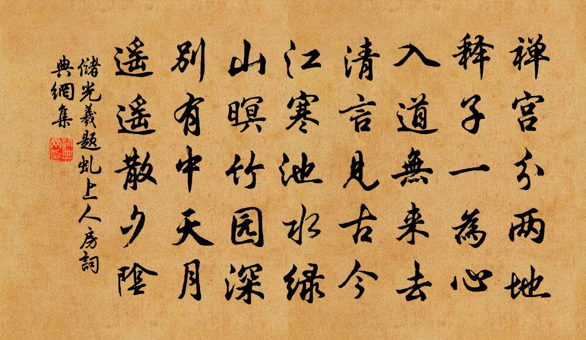 詩詞名句歷史字典書法欣賞書法字典國語詞典說文解字康熙字典古漢語字典標 題 作 者 詩 句 題虬上人房作者:儲光羲 朝代:唐代題虬上人房原文禪宮分兩地,釋子一為心。入道無來去,清言見古今。江寒池水綠,山暝竹園深。別有中天月,遙遙散夕陰。詩詞問答問:題虬上人房的作者是誰?答:儲光羲問:題虬上人房寫於哪個朝代?答:唐代問:題虬上人房是什麼體裁?答:五律儲光羲題虬上人房書法欣賞題虬上人房書法作品注釋全唐詩:卷139_10全唐詩:卷139_10詩詞推薦南歌子洪适〔宋代〕頑健輸村老,嬉遊付後生。七旬才有五清明。須趁良辰美景、繞園行。雲意將飛雪,天心未肯晴。難將性命作人情次韻答羅鄂州二首項安世〔宋代〕相望才信宿,一出尚徘徊。誰謂堅高處,真成竭蹶來。人情傷蹭蹬,學力諱遲回。 * 焚林去,如何水一杯。掛金索佚名〔宋代〕過了一年,又是添一歲。每日隨緣,爭甚閒和氣。可憐韶華,奔走如*指。莫待臨頭,臘月三十日。夜句三首蘇泂〔宋代〕四更過盡五更來,看見參旗卷復開。澄澈定非人世酒,就渠斗柄酌三杯。答卜者白居易〔唐代〕病眼昏似夜,衰鬢颯如秋。除卻須衣食,平生百事休。知君善易者,問我決疑不。不卜非他故,人間無所求。好事近謝逸〔宋代〕疏雨洗煙波,雨過滿江秋色。風起白鷗零亂,破嵐光深碧。荻花楓葉只供愁,清吟寫岑寂。吟罷倚闌無語,聽一聲去春劉克莊〔宋代〕去春烽火照江邊,曾草軍書夕廢眠。萬里旌旗真屬命,一丘耕釣且隨緣。偶然謝客元非病,間亦尋僧不為禪。尚有新正過沙堤陳著〔宋代〕朝雨黃鸝靜,春風暗蕊低。極知來令節,未肯踏深泥。狼藉桃無語,侵尋草滿蹊。還聞騎馬客,躑躅向沙堤。九誦岳神鮮于侁〔宋代〕雲蓊蔚兮山之巔,瞻岳靈兮望青天。嶄岩崷崒兮磅礴無垠,龍從律師勃兮寧一以為仁。草木雜而羅生兮人不可名,春雪秦韜玉〔唐代〕雲重寒空思寂寥,玉塵如糝滿春朝。片才著地輕輕陷,力不禁風旋旋銷。惹砌任他香粉妒,縈叢自學小梅嬌。誰家偈頌四首釋惟一〔宋代〕臘月二十 * ,家家戶戶盡有。不是北禪露地牛,便是清源白家酒。羅旬杯盤,同歡共笑。不睡白居易〔唐代〕焰短寒缸盡,聲長曉漏遲。年衰自無睡,不是守三屍。偈頌一百一十七首釋紹曇〔宋代〕秋陽肆酷,劃地奔雷。洗滌袢襟,喜而不寐。懿德山王贈之以偈:大旱逢甘雨,他鄉遇故知。攧崖泉漱玉,嘗稻雪立秋日司空曙〔唐代〕律變新秋至,蕭條自此初。花酣蓮報謝,葉在柳呈疏。澹日非雲映,清風似雨餘。捲簾涼暗度,迎扇暑先除。草靜初夏山中陸游〔宋代〕又報東皇促駕歸,醉中闕賦送春詩。佛瓶是處見紅藥,僧榻有時聞子規。野客款門聊倒屣,溪潭照影一軒眉。年光雙頭蓮陸游〔宋代〕風卷征塵,堪嘆處、青驄正搖金轡。客襟貯淚。漫萬點如血,憑誰持寄。佇想艷態幽情,壓江南佳麗。春正媚。怎八節長歡(登高詞)毛滂〔宋代〕澤國秋深。繡楹天近,坐久魂清。溪山繞尊酒,雲霧浥衣襟。餘霞孤雁送愁眼,寄寒閨、一點離心。杜老兩峰秀處雲州秋望屈大均〔清代〕白草黃羊外,空聞觱篥哀。遙尋蘇武廟,不上李陵台。風助群鷹擊,雲隨萬馬來。關前無數柳,一夜落龍堆。寄題嵩巫亭歐陽修〔宋代〕平地煙霄向此分,繡楣丹檻照清芬。風簾春卷秋空碧,剩見西山數嶺雲。曲江解舟釋紹嵩〔宋代〕動靜非常態,此行風正秋。巉巉孤棹起,渺渺大江流。蟬噪日將落,煙生山欲浮。無心與時競,吟憑釣魚舟。名句推薦沅有芷兮澧有蘭,思公子兮未敢言。屈原《九歌·湘夫人》 世間無限丹青手,一片傷心畫不成。高蟾《金陵晚望》 念佳人、音塵別後,對此應解相思。晁端禮《綠頭鴨·詠月》 好時節,願得年年,常見中秋月。徐有貞《中秋月·中秋月》 野童扶醉舞,山鳥助酣歌。孟浩然《夏日浮舟過陳大水亭 / 浮舟過滕逸人別業》 吹到一片秋香,清輝了如雪。納蘭性德《琵琶仙·中秋》 亂碧萋萋,雨後江天曉。梅堯臣《蘇幕遮·草》 今宵絕勝無人共,臥看星河盡意明。陳與義《雨晴·天缺西南江面清》 風吹仙袂飄颻舉,猶似霓裳羽衣舞白居易《長恨歌》 一霎荷塘過雨,明朝便是秋聲。項鴻祚《清平樂·池上納涼》