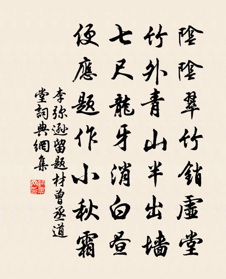 詩詞名句歷史字典書法欣賞書法字典國語詞典說文解字康熙字典古漢語字典標 題 作 者 詩 句 留題材曾丞道堂作者:李彌遜 朝代:宋代留題材曾丞道堂原文陰陰翠竹銷虛堂,竹外青山半出牆。七尺龍牙消白晝,便應題作小秋霜。詩詞問答問:留題材曾丞道堂的作者是誰?答:李彌遜問:留題材曾丞道堂寫於哪個朝代?答:宋代李彌遜留題材曾丞道堂書法欣賞留題材曾丞道堂書法作品詩詞推薦幽軒歐陽玭〔唐代〕幽軒斜映山,空澗復潺潺。重疊岩巒趣,遙來窗戶間。桃花飄岫幌,燕子語松關。衣桁侵池翠,階痕露蘚斑。臨風雜詩二十七首曹勛〔宋代〕飛去鶯兒黃一點,壓低梅子綠團枝。鉤窗卷箔涼生坐,但覺新陰轉影遲。贈道者劉威〔唐代〕五雲深處有真仙,歲月催多卻少年。入郭不知今世事,賣丹猶覓古時錢。閒尋白鹿眠瑤草,暗摘紅桃去洞天。時向偈頌一百二十三首釋崇岳〔宋代〕十五日已前取不得,十五日已後捨不得。正當十五日,取即是,舍即是。問汝問余都不會,可憐只解那斯祁。題潯陽樓 自此後詩,江州司馬時作。白居易〔唐代〕常愛陶彭澤,文思何高玄。又怪韋江州,詩情亦清閒。今朝登此樓,有以知其然。大江寒見底,匡山青倚天。深夜秋懷十首韓元吉〔宋代〕江南四百八十寺,未抵西湖勝處多。不用樓台帶煙雨,只看宮殿壓晴波。植芙蓉有懷任希夷〔宋代〕為愛秋花霜後紅,故栽千樹待西風。卻民少日拊頭語,淚落花前鬢影髼。偶作劉黻〔宋代〕四十一年身,天南作逐臣。病居僧卻到,淡飯仆猶嗔。州淺稀高木,山荒闕伏神。退藏還有味,所憾遠雙親。仲晦監簿和放翁七十三吟三篇華予初度走筆□劉克莊〔宋代〕鏡中雪鬢數莖新,歸作田間負耒民。仕五十年難諱老,封三百戶敢嫌貧。諸無物實師龐蘊,萬苦非真試子春。到得清夜施樞〔宋代〕客身隨取止,一室冷如冰。景遠吟何托,情疏夢不曾。雨粘初蘚壁,風謝欲花燈。豈是無家者,甘為有發僧。春日山居好十首舒岳祥〔宋代〕春日山居好,西湖樂事非。青黃雖未接,紅紫自交輝。酒在何憂死,詩成可療飢。典書猶可醉,何必有金揮。菩薩蠻(十之七)鄧肅〔宋代〕腰肢欲趁楊花去。歌聲能遏行雲住。杯酒醉東風。羈愁一洗空。謫仙清飲露。意在飛瓊侶。未醉即求歸。新詞句欲晨起聞雞趙蕃〔宋代〕宿雨收茅屋,群雞叫遠村。病羸深擁褐,廚罄晚開門。流落何年已,荒涼莫自存。束書徒負載,飢至不堪論。臥治齋詩張舜民〔宋代〕為治固有術,公臥有人立。直須緊閉關,勿使龐公人。虛谷張煒〔宋代〕虛室既生白,空谷亦傳聲。山翁抱高標,借為虛谷名。中有如帶水,流出心源清。我欲從之游,臨風濯塵纓。黑漆弩 曲山亦作言懷一詞,遂繼韻戲贈王惲〔元代〕休官彭澤居閒久。縱清苦、愛吾子能守。幸年來、所事消磨,只有苦吟甘酒。平生道在初心,富貴浮云何有。恐此戲酬李勉之留江州懷琴窗之什董嗣杲〔宋代〕當時兩別惜分雙,客了三吳客九江。何處揮金曾駐馬,此身懷寶尚迷邦。水流歲月添新恨,塵撲簫弦失舊腔。柳下縣齋秋懷程公許〔宋代〕幼學自魯鄒,心卑管商。誰令簡書縛,課我星火忙。我自友古人,渠肯兄孔方。飛檄浩盈幾,泛窺陷中腸。閣束且敷水驛權德輿〔唐代〕空見水名敷,秦樓昔事無。臨風駐征騎,聊復捋髭鬚。書懷劉學箕〔宋代〕園成日以待東風,綠李黃梅已前業。種竹自期千戶等,舉杯誰伴八仙同。機忘鷗鳥情相狎,興適琴書趣獨窮。坎止名句推薦獨上小摟春欲暮,愁望玉關芳草路。韋莊《木蘭花·獨上小樓春欲暮》 青山如黛遠村東,嫩綠長溪柳絮風。高珩《春日雜詠》 聞說東風亦多情,被竹外、香留住。史達祖《留春令·詠梅花》 酒後競風采,三杯弄寶刀。李白《白馬篇》 足不強則跡不遠,鋒不銛,則割不深。王充《論衡·卷十三·超奇篇》 朝辭白帝彩雲間,千里江陵一日還。李白《早發白帝城 / 白帝下江陵》 榮所眾羨,亦引眾怨。來俊臣《羅織經·固榮卷第六》 出其東門,有女如雲。佚名《出其東門》 書當快意讀易盡,客有可人期不來。陳師道《絕句·書當快意讀易盡》 烹羊宰牛且為樂,會須一飲三百杯。李白《將進酒》