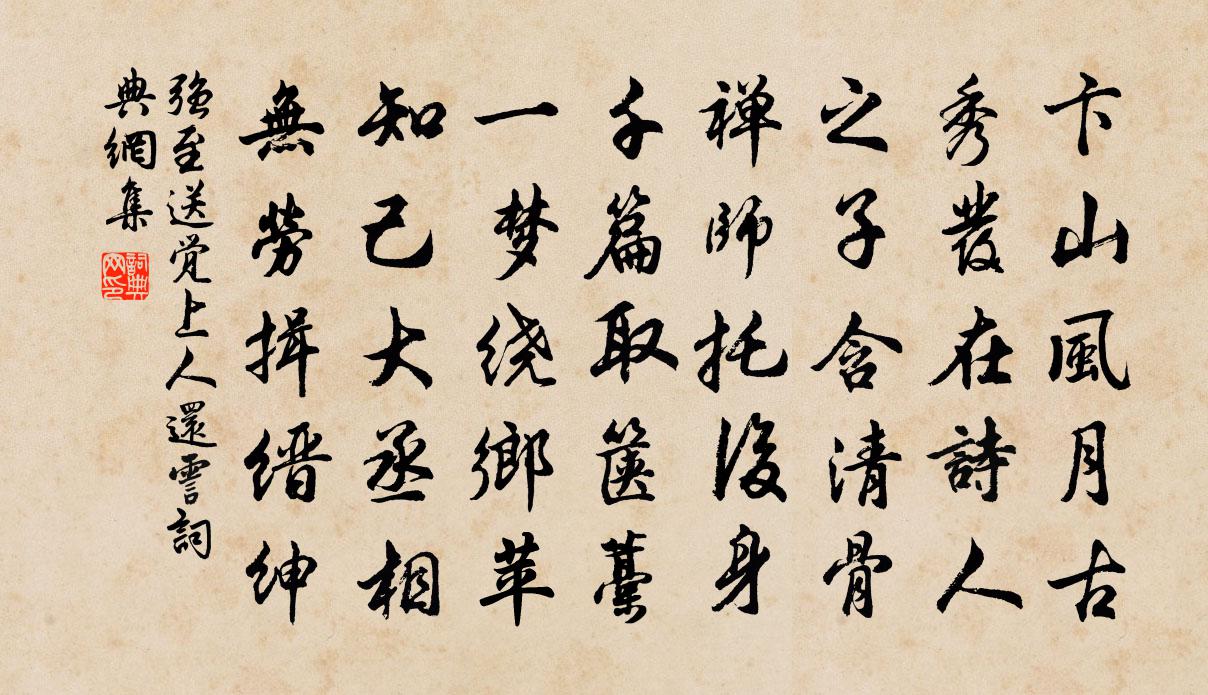 詩詞名句歷史字典書法欣賞書法字典國語詞典說文解字康熙字典古漢語字典標 題 作 者 詩 句 送覺上人還霅作者:強至 朝代:宋代送覺上人還霅原文卞山風月古,秀髮在詩人。之子含清骨,禪師托後身。千篇取篋藁,一夢繞鄉苹。知己大丞相,無勞揖縉紳。詩詞問答問:送覺上人還霅的作者是誰?答:強至問:送覺上人還霅寫於哪個朝代?答:宋代強至送覺上人還霅書法欣賞送覺上人還霅書法作品詩詞推薦寄友人李頻〔唐代〕一別一相見,須臾老此生。客衣寒後薄,山思夜深清。詩近吟何句,髭新白幾莖。路岐如昨日,來往夢分明。黃侍郎元章題處士何熙績所居日肥遁熙績又結曾豐〔宋代〕圭蓽逸民宅,羊鶉處士衣。人才於古有,天命與時違。初不厭肥遁,終何辭大歸。初張兩題目,君自一其機。枕屏子佚名〔宋代〕涉歷名山,岩巒盡皆游過。上高坡。登峻岭,勞神怎么。道在身,心著物,交加相躲。終不失、本來這個。白日同與子上雪中入東園望春楊萬里〔宋代〕草草東園未整齊,卻於看雪最清奇。莫嫌蹈濕青鞋子,自有瓊瑤隔路泥。一春未嘗行樂而群花今已離披感而成篇強至〔宋代〕只知倦馬趁風沙,不覺啼鶯破物華。始擬尊前謀小酌,早堪枝上數殘花。壯圖慘澹流年駛,樂事參差暮景斜。薄醉還通上人卷王之道〔宋代〕格清詞苦與誰論,攜繞錢塘給事墳。所得豈容人繼和,朗吟應被鶴聽聞。月輪冷照千岩雪,霞片輕裝萬疊雲。投向嘲蝶釋文珦〔宋代〕耳聲眼色總非真,物我同為一窖塵。蝴蝶不知身是夢,花間栩栩過青春。十月四日夜記夢陸游〔宋代〕四客聯轡來,我醉久不知;倒衣出迎客,媿謝前致辭。客意極疏豁,大笑軒鬚眉。禮豈為我設,度外以相期。袞袞又和仲鹹謔成口號以代優人之句王禹偁〔宋代〕就轉專城喜氣舒,開筵應待雨晴初。又淹駮正春坊筆,為重循良刺史車。事簡郡齋唯撿藥,夜長鈴合只看書。好傾次毛一齋韻黃庚〔宋代〕詩夢驚殘何處棋,書窗又是夕陽時。柳限分綠籠琴幾,花片飛紅占硯池。覽鏡自鄰吳白髮,傳杯不復倩蛾眉。東風臨江仙 偶成舒遜〔元代〕銀燭光搖秋夜永,一天涼侵詩脾。鳴蟲唧唧漏遲遲。半生春夢裡,彷佛是耶非。萬事破除惟有酒,當歌不飲何如。寄舍弟韋莊〔唐代〕每吟富貴他人合,不覺汍瀾又濕衣。萬里日邊鄉樹遠,何年何路得同歸?答人書言邵雍〔宋代〕無位立事難,逢時建功易。求全自有毀,舉大須略細。去惡慮傷恩,存惡憂害義。徒有仁者心,殊無仁者意。思還人四方四首釋文珦〔宋代〕念郎南行在桂林,蠻風瘴雨眾毒侵。到家團欒第一樂,原郎早歸無久淫。十五日雨後微月遺安堂前有梔花一枝行之有效舒岳祥〔宋代〕雨足清寒月色微,風將幽磬落柴扉。一瓶檐蔔修清供,童子岩腰取水歸。秦鏡仲子陵〔唐代〕萬古秦時鏡,從來抱至精。依台月自吐,在匣水常清。爛爛金光發,澄澄物象生。雲天皆洞鑒,表里盡虛明。但見次韻李參政見寄三首魏了翁〔宋代〕怕放紅樓目,浮雲斷復連。遠看壺聚拓,近眎室如縣。耿耿自許國,悠悠誰訊天。天心那可識,拄頰看晴川。送了守衡州李曾伯〔宋代〕雁峰自昔號名州,爾既難辭我莫留。臨政毋忘宣上德,持身謹勿遺親羞。當令民誦循良守,罔俾人譏恩澤侯。國事戲題斌老所作兩竹梢黃庭堅〔宋代〕老竹帖妥不作奇,嫩篁翹翹動風枝。是中有目世不知,吾宗落筆風煙隨。東蜀春晚鄭谷〔唐代〕如此浮生更別離,可堪長慟送春歸。潼江水上楊花雪,剛逐孤舟繚繞飛。名句推薦慎終如始,則無敗事。老子《老子·德經·第六十四章》 鳳尾森森,龍吟細細。曹雪芹《紅樓夢·第二十六回》 此身如傳舍,何處是吾鄉。蘇軾《臨江仙·送王緘》 今又重陽,戰地黃花分外香。 * 《採桑子·重陽》 春日遲遲,卉木萋萋。佚名《出車》 桃李務青春,誰能貫白日。李白《長歌行》 夫魚食其餌,乃牽於緡;人食其祿,乃服於君。姜子牙《六韜·文韜·文師》 天涯也有江南信。梅破知春近。黃庭堅《虞美人·宜州見梅作》 知人者智,自知者明。老子《老子·道經·第三十三章》 清露晨流,新桐初引,多少遊春意。李清照《念奴嬌·春情》