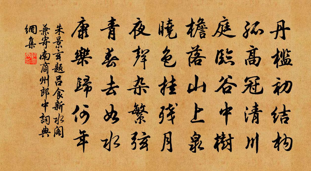 詩詞名句歷史字典書法欣賞書法字典國語詞典說文解字康熙字典古漢語字典標 題 作 者 詩 句 題呂食新水閣兼寄南商州郎中作者:朱景玄 朝代:唐代原文丹檻初結構,孤高冠清川。庭臨谷中樹,檐落山上泉。曉色掛殘月,夜聲雜繁弦。青春去如水,康樂歸何年。詩詞問答問:《題呂食新水閣兼寄南商州郎中》的作者是誰?答:朱景玄問:該詩寫於哪個朝代?答:唐代問:該詩是什麼體裁?答:五律書法欣賞題呂食新水閣兼寄南商州郎中書法作品注釋全唐詩:卷547-1詩詞推薦上馮使君渡水僧障子貫休〔唐代〕跣足拄巴藤,潺湲渡幾曾。盡權無著印,不是等閒僧。熊耳應初到,牛頭始去登。畫來偏覺好,將寄柳吳興。下牢溪歐陽修〔宋代〕隔谷聞溪聲,尋溪度橫嶺。清流涵白石,靜見千峰影。岩花無時歇,翠栢郁何整。安能戀潺湲,俯仰弄雲景。嶺上紅梅范成大〔宋代〕霧雨臙脂照松竹,江南春風一枝足。滿城桃李各嫣然,寂莫傾城在空谷。城中誰解惜娉婷?遊子路傍空復情。花不昨日訪子上,不遇。裴回庭砌觀木犀而歸,再楊萬里〔宋代〕昨攜兒輩扣雲開,繞遍岩花恣意看。苔砌落深金布地,水沉烝透栗堆盤。寄詩北阮賒秋色,供我西窗當晚餐。小朵悶歌行十二首楊萬里〔宋代〕新詩喔罷倦來眠,蝴蝶飛游八極邊。船外風濤如霹靂,一聲不到睡鄉天。九月十七日夜度蔡道嶺宿彌勒院洪邁〔宋代〕月出度松嶺,露香霏羽衣。肅肅夜氣清,蒼蒼煙徑微。川光浴秋容,蘿影掛夕輝。冰輪碾空闊,飛轍無因依。擬掬讀史有感陸游〔宋代〕英雄自古埋秋草,世上兒童共笑狂。射賊曾飛白羽箭,閉門空枕綠沉槍。隆中高臥人千載,易水悲歌淚數行。讀盡壽史石泉二首吳泳〔宋代〕露洗秋容一片清,遠山高與雪爭明。賢侯無陽岳神降,上相先從佛臘生。畫戟不妨當燕寢,白囊無復到雞城。新來揖仙閣王安石〔宋代〕結閣揖仙子,疏塘臨隱扉。水花紅四出,山竹翠相圍。雲度疑軿下,鳧驚恐舄飛。蜀姜寧可恃,投釣此忘歸。遺任子淵省元六首員興宗〔宋代〕妙想語不周,中夜興抱膝。憶昨親蛟蜃,風浪身惻惻。天意增吳濤,滄江渺何極。君舟且勿理,南首快所歷。何如送金橘與徐釣舟釋善珍〔宋代〕竹籠盛來露未乾,試嘗數顆已無酸。味同楚水赤萍實,色比韓郎金彈刃。委地兒童難識價,經霜桃李不同盤。緘題臨江仙辛棄疾〔宋代〕醉帽吟鞭花不住,卻招花共商量。人生何必醉為鄉。從教斟酒淺,休更和詩忙。一斗百篇風月地,饒他老子當行。送錢唐路少府赴制舉皇甫冉〔唐代〕公車待詔赴長安,客里新正阻舊歡。遲日未能銷野雪,晴花偏自犯江寒。東溟道路通秦塞,北闕威儀識漢官。共許書堂山劉克莊〔宋代〕子厚文章宗,仲塗豈後身。不肯作崑體,寧來牧湘濱。誅茅翠麓顛,日與書卷親。划去五季衰,挽回六籍醇。歐尹觀黃筌畫花二首崔鶠〔宋代〕淺淺紅顴與白腮,臥枝斜葉抱新開。何人與作春風面,誑得蜂兒日日來。和毛中書勸宵韻三首袁甫〔宋代〕歷遍田疇問我農,都言杼柚久虛空。吏胥祗是工椎剝,倉廩何曾識腐紅。願得家家歌樂歲,直須日日扇和風。如今水調歌頭(陪福帥宴集口占以授官奴)張元乾〔宋代〕縹緲九仙閣,壯觀在人間。涼飈乍起,四圍晴黛入闌乾。已過中秋時候。便是菊花重九。為壽一尊歡。今古登高意都門晚望朱慶餘〔唐代〕綠槐花墮御溝邊,步出都門雨後天。日暮野人耕種罷,烽樓原上一條煙。江上逢故人陳陶〔唐代〕十年蓬轉金陵道,長哭青雲身不早。故鄉逢盡白頭人,清江顏色何曾老。送舍利宿定普岩孔德紹〔唐代〕仁祠表虛曠,祇園展肅恭。棲息翠微嶺,登頓白雲峰。映流看夜月,臨峰聽曉鍾。澗芳十步草,崖陰百丈松。蕭然名句推薦人情送匹馬,買賣不饒針!佚名《增廣賢文·下集》 胭脂淚,相留醉,幾時重。李煜《相見歡·林花謝了春紅》 艱難苦恨繁霜鬢,潦倒新停濁酒杯。杜甫《登高》 繁飾有命,以教眾愚朴之人。墨子《墨子·36章 非命(中)》 亂鴉三四點,愁坐話無憀。陳維崧《臨江仙·寒柳》 遙望洞庭山水色,白銀盤裡一青螺劉禹錫《望洞庭》 但得一片橘皮吃,莫便忘了洞庭湖。施耐庵《水滸傳·第二十四回》 沉舟側畔千帆過,病樹前頭萬木春。劉禹錫《酬樂天揚州初逢席上見贈》 聖人不法古,不脩今。法古則後於時,脩今則塞於勢。商鞅《商君書·開塞》 無為在歧路,兒女共沾巾。王勃《送杜少府之任蜀州 / 送杜少府之任蜀川》