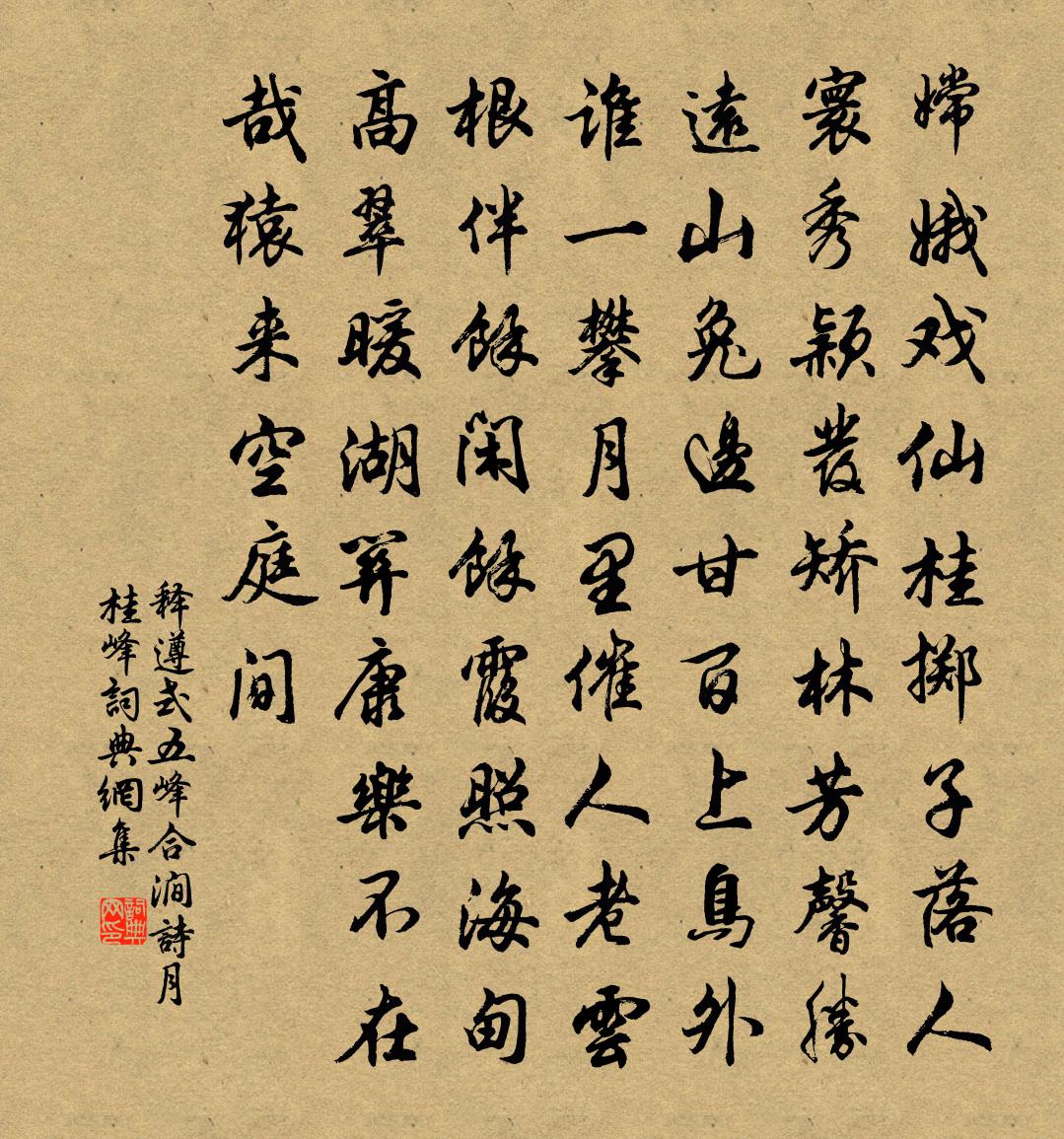 詩詞名句歷史字典書法欣賞書法字典國語詞典說文解字康熙字典古漢語字典標 題 作 者 詩 句 五峰合澗詩月桂峰作者:釋遵式 朝代:宋代五峰合澗詩月桂峰原文嫦娥戲仙桂,擲子落人寰。秀穎發矯林,芳馨勝遠山。兔邊甘百上,鳥外誰一攀。月里催人老,雲根伴餘閒。餘霞照海甸,高翠暖湖關。康樂不在哉,猿來空庭間。詩詞問答問:五峰合澗詩月桂峰的作者是誰?答:釋遵式問:五峰合澗詩月桂峰寫於哪個朝代?答:宋代釋遵式五峰合澗詩月桂峰書法欣賞五峰合澗詩月桂峰書法作品詩詞推薦游昌化山精舍盧照鄰〔唐代〕寶地乘峰出,香台接漢高。稍覺真途近,方知人事勞。代壽陳宗遠〔宋代〕自上黃樞贊萬機,曾將謀略定邊陲。平淮便放裴公逸,去越猶嫌范相遲。瀲灩池塘蓮萬朵,嬋娟亭館竹千枝。居東秋宿梓州牛頭寺李洞〔唐代〕月去檐三尺,川雲入寺樓。靈山頓離眾,列宿不多稠。篆字焚初缺,翻經誦若流。窗閒二江冷,簾卷半空秋。詔散金錢菊楊巽齋〔宋代〕清曉幽業露作團,籬邊積疊喜人看。落英欲買真無價,唯許騷人罄一餐。忠厚吟邵雍〔宋代〕小人斯須,君子長久。斯須傾邪,長久忠厚。詩二首王恕〔宋代〕地高風易作,天漏雨偏多。訪橘蘇仙井,看碑義帝坡。登聖善寺閣(一題作登少室山)褚朝陽〔唐代〕飛閣青霞里,先秋獨早涼。天花映窗近,月桂拂檐香。華岳三峰小,黃河一帶長。空間指歸路,煙際有垂楊。雪陸游〔宋代〕但苦奇寒惱病翁,豈知上瑞報年豐。一庭不掃待新月,萬壑盡平號斷鴻。繭紙欲書先研凍,羽觴才舉已尊空。若耶重題薔薇皮日休〔唐代〕濃似猩猩初染素,輕如燕燕欲凌空。可憐細麗難勝日,照得深紅作淺紅。和津喜雪二首吳芾〔宋代〕我愛平湖繞碧山,山光倒碧到樽前。同云何事迷千嶂,飛雪俄然蔽一川。縱使玉樓從地涌,便教銀闕與天連。到頭種梅陳舜俞〔宋代〕始我窺山中,早與梅花期。低回遂四十,種樹計已遲。樵夫致遠枿,園官送新枝。故土謹包裹,深根屢培滋。連宵黃孝恭失官多作歌詩極於哀麗宋庠〔宋代〕禿瓮無版出無軒,清藻千章愬舊冤。可惜騷人能設問,皇天終不答根源。如夢令·道是梨花不是嚴蕊〔宋代〕道是梨花不是。道是杏花不是。白白與紅紅,別是東風情味。曾記。曾記。人在武陵微醉。念奴嬌(梅)袁去華〔宋代〕蕊珠宮女弄幽妍,初著春心嬌小。自白真香,渾勝似、姑射冰肌窈窕。帶雪茅檐,臨溪籬落,占卻春多少。天寒日代人上建守四首李呂〔宋代〕可怪鄉風最不情,生兒不舉世相仍。自從節省歸新曆,添得王民幾萬丁。雁山紀游七首能仁寺薛嵎〔宋代〕過盡盤山險,登臨意忽平。殿燈搖佛影,瀑布雜鐘聲。湫闊龍居頂,路回峰換名。曉行林日薄,海氣接雲生。送王子林節推官融水楊萬里〔宋代〕桂嶺梅花欲爭發,融水幕賓來訪別。可憐疋馬犯霜風,吟遍梅花更吟雪。我如病蠶已三眠,作繭不就黏壁乾。君如青玉案(凌歊台懷姑溪老人李端叔)周紫芝〔宋代〕青鞋忍踏江沙路。恨人已、騎鯨去。筆底驊騮誰與度。西州重到,可憐不見,華屋生存處。秋江渺渺高台暮。滿壁陪張龍圖南湖暑飲司馬光〔宋代〕紅旆縈林卻轉,瓊筵就水重開。荷香著衣不去,竹色映酒遙來。避世行陸游〔宋代〕君渴未嘗飲鴆羽,君飢未嘗食烏喙。惟其知之審,取捨不待議。有眼看青天,對客實少味;有口啖松柏,火食太多名句推薦結髮為夫妻,恩愛兩不疑。蘇武《留別妻》 人生大病,只是一傲字。王陽明《傳習錄·卷下·門人黃以方錄》 腳踏車欲問邊,屬國過居延。王維《使至塞上》 今歲早梅開,依舊年時月。張孝祥《卜運算元·雪月最相宜》 暖風熏得遊人醉,直把杭州作汴州。林升《題臨安邸》 道在不可見,用在不可知。韓非及後人《韓非子·主道》 盤心清露如鉛水,又一夜、西風吹折。張炎《疏影·詠荷葉》 洛陽城裡見秋風,欲作家書意萬重。張籍《秋思》 擬把疏狂圖一醉,對酒當歌,強樂還無味。柳永《蝶戀花·佇倚危樓風細細》 執古之道,以御今之有。能知古始,是謂道紀。老子《老子·道經·第十四章》
