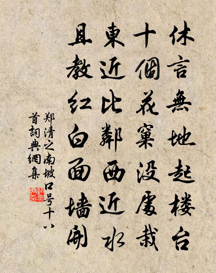 詩詞名句歷史字典書法欣賞書法字典國語詞典說文解字康熙字典古漢語字典標 題 作 者 詩 句 南坡口號十八首作者:鄭清之 朝代:宋代南坡口號十八首原文休言無地起樓台,十個花窠沒處栽。東近比鄰西近水,且教紅白面牆開。詩詞問答問:南坡口號十八首的作者是誰?答:鄭清之問:南坡口號十八首寫於哪個朝代?答:宋代鄭清之南坡口號十八首書法欣賞南坡口號十八首書法作品詩詞推薦蕪湖晚步李流謙〔宋代〕迥陂積水長蒲蔣,散步郊原借夕涼。塵袖風巾嗟久旅,稻畦柘逕似吾鄉。蛙聲月色當空曠,爨火人家在莽蒼。望合西湖初夏周弼〔宋代〕花飛春減綠陰成,不住風光繞禁城。山寺晚晴蟬欲噪,柳林猶囀數聲鶯。送晁堯民守徐陳師道〔宋代〕中年為別不堪憂,束髮登門到白頭。南省望郎仍國士,東方千騎更吾州。彭翁老壽終遺骨,燕子飛來只故樓。知己崔白敗荷折葦寒鷺文同〔宋代〕疏葦雨中老,亂荷霜外凋。多情惟白鳥,常此伴蕭條。候人佚名〔先秦〕彼候人兮,何戈與祋。彼其之子,三百赤芾。維鵜在梁,不濡其翼。彼其之子,不稱其服。維鵜在梁,不濡其咮。晚秋喜雨李嶠〔唐代〕積陽躔首夏,隆旱屆徂秋。炎威振皇服,歊景暴神州。氣滌朝川郎,光澄夕照浮。草木委林甸,禾黍悴原疇。國懼三三徑楊萬里〔宋代〕三徑初開自蔣卿,再開三徑是淵明。誠齋奄有三三徑,一徑花開一逕行。醜奴兒/採桑子周邦彥〔宋代〕南枝度臘開全少,疏影當軒。一種宜寒。自共清蟾別有緣。江南風味依然在,玉貌韶顏。今夜憑闌。不似釵頭子細蝶戀花·旅月懷人宋琬〔清代〕月去疏簾才數尺,烏鵲驚飛,一片傷心白。萬里故人關塞隔,南樓誰弄梅花笛?蟋蟀燈前欺病客,清影徘徊,欲睡陪鄭史君泛舟晚歸許渾〔唐代〕南郭望歸處,郡樓高捲簾。平橋低皂蓋,曲岸轉彤襜。江晚笙歌促,山晴鼓角嚴。羊公莫先醉,清曉月纖纖。淳熙十二年加上太上皇帝太上皇后尊號十一首佚名〔宋代〕大矣母慈,德備且純。思古齊敬,佐我皇文。明章茂典,金玉其音。帝親奉之,以翼以欽。南山十詠鳴弦峰劉仲堪〔宋代〕奇峰枕高岸,回合藏雲煙。直上數百仞,倒影浮清漣。民傳舜南狩,向此鳴朱弦。至今萬籟寂,雅韻猶泠然。雨韓琮〔唐代〕陰雲拂地散絲輕,長得為霖濟物名。夜浦漲歸天塹闊,春風灑入御溝平。軒車幾處歸頻濕,羅綺何人去欲生。不及頌古五十五首釋紹曇〔宋代〕颺下山藤設意深,嗅烏喙藥禍沾身。腳跟未斷紅絲線,智鑒難逃明眼人。送黃生兼寄二謝二首陳師道〔宋代〕城西兩謝俱能文,穰丞精悍吾所聞。每讀吾詩得人意,使不能文已可人。我昔謝公門下士,早年妄作功名意。如今次蒲心泉韻釋善珍〔宋代〕京華厭塵土,借屋瞰湖邊。驢蹇馱詩笈,鷗閒傍酒船。啼鵑殘月曉,細雨落花天。何日東林伴,同修蓮社緣。寄壽二親三首3劉黻〔宋代〕甘向清朝作逐臣,茹蔬親草即經綸。心香都在寒梅上,宇宙常逢不老春。頌古十六首釋心月〔宋代〕室內孤燈只自知,入流須辨截流機。遼天一鏃三關外,玉兔金烏不敢飛。翠羽辭梅堯臣〔宋代〕秦女乘鸞遺翠羽,落在人間與風舞。風休不歸誰作主,此郎拾取裝金縷。郎家主婦愛且憐,系向裙腰同出處。朝來書初涼夜至將曉:{靈壽寺作}張耒〔宋代〕秋房燈火清,人語久已寂。城遠不聞更,警柝鳴未息。橫參已入地,斗柄當天直。乃知三更中,市廛已寂歷。我時名句推薦即從巴峽穿巫峽,便下襄陽向洛陽。杜甫《聞官軍收河南河北》 習讀書之業,便當知讀書之樂王永彬《圍爐夜話·第五五則》 殘雪壓枝猶有桔,凍雷驚筍欲抽芽。歐陽修《戲答元珍》 一顧傾人城,再顧傾人國。李延年《李延年歌》 宮女如花滿春殿,只今惟有鷓鴣飛。李白《越中覽古》 取次花叢懶回顧,半緣修道半緣君。元稹《離思五首·其四》 過橋分野色,移石動雲根。賈島《題李凝幽居》 此心終合雪,去已莫思量。虛中《送遷客》 萬頃風濤不記蘇。雪晴江上麥千車。蘇軾《浣溪沙·萬頃風濤不記蘇》 秋鬢含霜白,衰顏倚酒紅。尹式《別宋常侍》