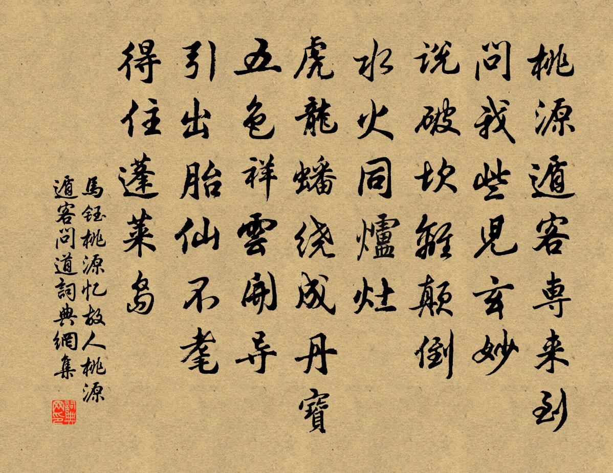 詩詞名句歷史字典書法欣賞書法字典國語詞典說文解字康熙字典古漢語字典標 題 作 者 詩 句 桃源憶故人 桃源遁客問道作者:馬鈺 朝代:元代桃源憶故人 桃源遁客問道原文桃源遁客專來到。問我些兒玄妙。說破坎離顛倒。水火同爐灶。虎龍蟠繞成丹寶。五色祥雲開導。引出胎仙不耄。得住蓬萊島。詩詞問答問:桃源憶故人 桃源遁客問道的作者是誰?答:馬鈺問:桃源憶故人 桃源遁客問道寫於哪個朝代?答:元代問:桃源憶故人 桃源遁客問道是什麼體裁?答:詞馬鈺桃源憶故人 桃源遁客問道書法欣賞桃源憶故人 桃源遁客問道書法作品詩詞推薦用楊誠齋韻再題歐陽長老墨梅袁說友〔宋代〕後來冰雪體,引墨為君開。寄語金鸞客,和羹人正來。杭州一百五日水心亭留題張詠〔宋代〕湖邊三月百花紅,湖上遊人處處通。莫怪此渠來便去,都緣心地似虛空。大酺(壽江東運使陸雲西集撰)陳著〔宋代〕把雪冰心,鈞韶手,飛上青雲時早。紅塵難染著,十年前曾坐,鳳池鰲島。暈錦鏘環,重金壓帶,相去能爭多少。示表弟沈見可趙蕃〔宋代〕裴公台上送入日,道鄉台上看出雲。窮居逼仄不屢到,拄杖容與能平分。江湖鶴髮嘆老我,道路繭足嗟夫君。畫手從軍行張玉娘〔宋代〕三十遴驍勇,從軍事北荒。流星飛玉彈,寶劍落秋霜。書角吹楊柳,金山險馬當。長驅空朔漠,馳捷報明王。送雪峰化主釋道生〔宋代〕三毬輥動錯流傳,大用何曾得現前。千五百僧無頓放,累人走得腳皮穿。久雨驟晴山園桃李爛熳獨海棠未甚開戲作陸游〔宋代〕雨霽風和日漸長,小園尊酒答年光。直令桃李能言語,何似多情睡海棠?【雙調】沉醉東風(五首)關漢卿〔元代〕一咫尺的天南地北,霎時間月缺花飛。手執著餞行杯,眼閣著別離淚。剛道得聲保重將息"金剛隨機無盡頌無斷無滅分第二十七釋印肅〔宋代〕毛吞巨海深,一頓飽忻忻。曹溪一滴水,猶尚帶辛勤。謝李伯時自臨安見過台州二首曹勛〔宋代〕念公萬里回異俗,睠我南來忘趼足。它時短幅問死生,為向荒寒訪雲屋。道旁花張耒〔宋代〕長夏百草秀,道旁多野花。無名自紅紫,有意占年華。灼灼照流水,斑斑上古槎。中原何日掃,將爾付泥沙。山中即事徐照〔宋代〕著履上崔嵬,呼兒注瓦杯。千岑經雨後,一雁帶秋來。野艇乘潮發,山園逐主開。餘生落樵牧,開卷少塵埃。宿大徹禪師故院雍陶〔唐代〕竹房誰繼生前事,松月空懸過去心。秋磬數聲天欲曉,影堂斜掩一燈深。揚州三絕句晁說之〔宋代〕便風五兩更悠悠,回望鄉閭煙霧浮。若問無情唯潁水,不來隨我到揚州。南至日隔仗望含元殿爐香裴次元〔唐代〕冕旒初負扆,卉服盡朝天。暘谷初移日,金爐漸起煙。芬馨流遠近,散漫入貂蟬。霜仗凝逾白,朱欄映轉鮮。始看玉漏遲(和趙立之)林表民〔宋代〕並湖遊冶路。垂冶萬柳,麴塵籠霧。草色將春,離思暗傷南浦。舊日愔愔坊陌,尚想得、畫樓窗戶。成遠阻。鳳箋次前韻寄天寧老可舉避生日於西山陳著〔宋代〕迎錫清風掃宿埃,煙霏空翠畫圖開。西山山上千年鶴,認取年年一度來。游日山郭三益〔宋代〕洗光朝日上旋旋,瑞色分臨此地先。門迥帆收江市密,山深龍臥海潭圓。靜然柏子聽幽偈,閒立苔痕問小禪。莫訝偈頌九十三首釋梵琮〔宋代〕打破虛空無縫,衲僧隨處受用。卻因聖制入山,雲北雲南做夢。端午行葉適〔宋代〕仙門諸水,會流下瓦窰溝。中有吊湘客,西城南北樓。旗翻稻花風,棹澀梅子雨。夜邏無騷音,絳紗蒙首去。名句推薦山外青山樓外樓,西湖歌舞幾時休?林升《題臨安邸》 憂勤是美德,太苦則無以適性怡情;淡泊是高風,太枯則無以濟人利物。洪應明《菜根譚·概論》 知往日所往之非,則學日進矣王永彬《圍爐夜話·第五六則》 忽憶故人天際去,計程今日到梁州。白居易《同李十一醉憶元九》 紅臉青腰,舊識凌波女。晏幾道《蝶戀花·笑艷秋蓮生綠浦》 從今若許閒乘月,拄杖無時夜叩門。陸游《游山西村》 最傷情、送客鹹陽,佩結西風怨。吳文英《瑣窗寒·玉蘭》 鶯嘴啄花紅溜,燕尾點波綠皺。秦觀《如夢令·春景》 拜華星之墜幾,約明月之浮槎。文天祥《回董提舉中秋請宴啟》 沅有芷兮澧有蘭,思公子兮未敢言。屈原《九歌·湘夫人》