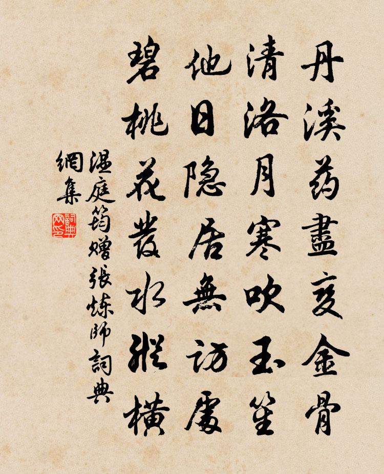 詩詞名句歷史字典書法欣賞書法字典國語詞典說文解字康熙字典古漢語字典標 題 作 者 詩 句 贈張鍊師作者:溫庭筠 朝代:唐代贈張鍊師原文丹溪藥盡變金骨,清洛月寒吹玉笙。他日隱居無訪處,碧桃花發水縱橫。詩詞問答問:贈張鍊師的作者是誰?答:溫庭筠問:贈張鍊師寫於哪個朝代?答:唐代問:贈張鍊師是什麼體裁?答:七絕問:溫庭筠的名句有哪些?答:溫庭筠名句大全溫庭筠贈張鍊師書法欣賞贈張鍊師書法作品注釋全唐詩:卷579-27詩詞推薦與士繇游金山翌日分袂二絕陳東〔宋代〕早別金山恰曉鍾,離帆分破一江風。瓜洲渡口波聲遠,後夜相思明月中。又次韻二首廖行之〔宋代〕年來那復不時須,斗酒珍藏敢罪孥。安我饋漿窮逆旅,有誰攜榼訪幽居。粗粱何擇皆庚癸,題品寧當辨酪酥。自笑鷓鴣天辛棄疾〔宋代〕出處從來自不齊。後車方載太公歸。誰知孤竹夷齊子,正向空山賦採薇。 * 嫩,晚香枝。一般同是採花時。蜂兒寄象岑上人釋行海〔宋代〕宴坐凌霄峰頂寺,時時音信得相聞。十年寥落長為客,四海交遊少似君。楊柳重青相送處,鷺鷥潔白自成群。寒思題畫扇晁說之〔宋代〕秦秦何處樂,獨自託孤枝。玉粒知無分,清風也自戲。普化和尚贊釋智遇〔宋代〕呈真哧殺盤山,對眾侮慢臨際。靜處畏影逃形,鬧里掀天撲地。鎮州城外活埋,至今雞驚犬吠。虞美人(黃州江上寄王帥)黃機〔宋代〕三年萬里黃塵路。只欠江湖去。扁舟二月下湘灣。過了洞庭青草、又春殘。□□□□□□□。□□□□□。□□□天寧節楊時〔宋代〕祥開若木射瑤光,淑氣先春影自長。玉陛風閒飛彩綬,獸爐煙暖襲珠囊。雲門羽鶴儀仙仗,天上蟠桃薦壽觴。已見一翦梅謝應芳〔元代〕東風吹醒老梅枝。南也芳菲。北也芳菲。月明半夜五更時。笛也爭吹。角也爭吹。青松澗底獨離奇。寒也誰知。暖投座主張子猷給事王之望〔宋代〕東風入雕檻,百卉無不花。一經造化手,各若矜春華。主人最好事,護養從萌芽。澆灌與封植,恩光無等差。其間招彝叟厚之飲台上花間韓維〔宋代〕恍然身世出塵心,香靄只園地布金。秉燭聽歌不知醉,夜深清露滿衣襟。再次寄肯堂韻五首陳造〔宋代〕住山今日得宗師,妙與緇徒示總持。衣缽更緣延客盡,衲衣包卻鄭當時。句釋惠崇〔宋代〕曉風飄磬遠,暮雪入廊深。蘭谷釋斯植〔宋代〕空谷寄深雲,靈根自不群。地閒平草長,香遠隔溪聞。靜與騷人佩,清同楚客分。唯慶千載後,餘韻在湘汶。剡中詩林表民〔宋代〕遺蹤曾記晉諸賢,乘興今無雪後船。斷塹毀垣難借問,磚文猶著太康年。御試後進詩王貞白〔唐代〕三時賜食天廚近,再宿偷吟禁漏清。二十五家齊拔宅,人間已寫上升名。逢老人隱巒〔唐代〕路逢一老翁,兩鬢白如雪。一里二里行,四回五回歇。淳祐祭海神十六首佚名〔宋代〕儵忽會同,裴回安留。牲肥酒香,晨事聿修。惟德之涼,曷奄九州。帝命是祗,多福自求。恭謁靈康祠下二首謝伋〔宋代〕生求同志論心事,沒聳邦人福禍間。吏奉敕書躋舊典,廟長血食配崇山。刲羊刺豕來村社,鼓瑟吹笙出市闤。報祭賢者之孝二百四十首葉公諸梁林同〔宋代〕隨母適異國,先歸汝忍能。致人不見視,應是得人憎。名句推薦蜃散雲收破樓閣,虹殘水照斷橋粱。白居易《江樓晚眺景物鮮奇吟玩成篇寄水部張員外》 枕上十年事,江南二老憂,都到心頭。徐再思《水仙子·夜雨》 春蠶到死絲方盡,蠟炬成灰淚始乾。李商隱《無題·相見時難別亦難》 近鄉情更怯,不敢問來人。宋之問《渡漢江》 為君之道,必須先存百姓。吳兢《貞觀政要·卷一·論君道》 武公不但歌淇澳,賢女猶能唁衛侯。姜塘《摘星樓九日登臨》 柳梢聽得黃鸝語,此是春來第一聲。楊載《到京師》 盡道豐年瑞,豐年事若何羅隱《雪》 九月九日眺山川,歸心歸望積風煙。盧照鄰《九月九日玄武山旅眺》 農夫無草萊之事則不比;商賈無市井之事則不比莊子《莊子·雜篇·徐無鬼》