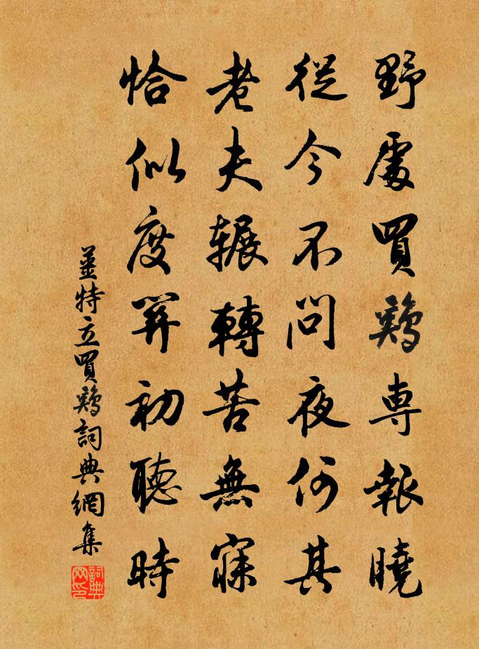 詩詞名句歷史字典書法欣賞書法字典國語詞典說文解字康熙字典古漢語字典標 題 作 者 詩 句 買雞作者:姜特立 朝代:宋代買雞原文野處買雞專報曉,從今不問夜何其。老夫輾轉苦無寐,恰似度關初聽時。詩詞問答問:買雞的作者是誰?答:姜特立問:買雞寫於哪個朝代?答:宋代姜特立買雞書法欣賞買雞書法作品詩詞推薦鷓鴣天 夏長筌子〔元代〕弄舌閒禽向鬱林。滌蒸散發趁松陰。清風習習來冰簟,陶寫真情取次吟。天似水,柳如金。火雲疊翠出遙岑。危樓定子(此詩又見《杜牧外集》,題作隋苑)李商隱〔唐代〕檀槽一抹廣陵春,定子初開睡臉新。卻笑吃虛隋煬帝,破家亡國為何人。南陽道中作竇鞏〔唐代〕東風雨洗順陽川,蜀錦花開綠草田。彩雉斗時頻駐馬,酒旗翻處亦留錢。新晴日照山頭雪,薄暮人爭渡口船。早晚西施篇蔡襄〔宋代〕越國無只艷,吳官未始知。誰言勾踐黠,不自愛西施。送客陸游〔宋代〕有客相與飲,酒盡惟清言。坐久飢腸鳴,殷如車輪翻。烹栗煨芋魁,味美敵熊蹯。一飽失百憂,抵掌談羲軒。意倦早發白帝城 / 白帝下江陵李白〔唐代〕朝辭白帝彩雲間,千里江陵一日還。兩岸猿聲啼不盡,輕舟已過萬重山。東坡釋善珍〔宋代〕天津橋上聽啼鵑,從此南人弄相權。多少衣冠落沙漠,朱崖宜著玉堂仙。虱白玉蟾〔宋代〕褲里無供給,褌頭盡受降。賜之湯沐罷,投置不毛邦。失題王昌齡〔唐代〕主家新邸第,相國舊池台。館是招賢辟,樓因教囗囗。軒車人已散,簫管鳳初來。今日龍門下,誰知文舉才,[一偈頌七十一首釋了惠〔宋代〕大地為囹圄,鞫勘佛與祖。款案猶未圓,棒喝如雷雨。平白累山僧,有屈無雪處。有雪處,楖{左木右栗}橫擔不如夢令倪瓚〔元代〕削跡松陵華寓。藏密白雲深處。造物已安排,萬事何須先慮。歸去。歸去。海鶴山猿同住。滿江紅 游南岩和范廓之韻辛棄疾〔宋代〕笑拍洪崖,問千丈、翠岩誰削?依舊是、西風白馬,北村南郭。似整復斜僧屋亂,欲吞還吐林煙薄。覺人間、萬事秋夜吟尚顏〔唐代〕梧桐雨畔夜愁吟,抖擻衣裾蘚色侵。枉道一生無繫著,湘南山水別人尋。李侯 其一王冕〔元代〕李侯世名仕,譽重才德優。清白樹嘉政,藉藉載歌謳。夫何挽塵鞅?幽幽滯南州。遊魂未能歸,永懷故園丘。孤雲鑒堂把酒鄧深〔宋代〕池館媚春華,憑欄午更嘉。日光凝水面,波影炫檐牙。魚出沖浮梗,萍交載落花。半酣拿小艇,落調唱漁家。念奴嬌梁棟〔宋代〕一場春夢,待從頭,說與旁人聽著。罨畫溪山紅錦障,舞燕歌鶯台閣。碧海傾春,黃金買夜,猶道看承薄。雕香剪天屋歌為盧洪賦趙希桐〔宋代〕霞扃雲牖高窿穹,八荒四野垂檐櫳。羲璘勃窣行西東,茫茫塵世如飛蓬。玉川公子乘清風,飄然據作吟詩宮。穿心和汪正夫梅鄭獬〔宋代〕少陵老杜獨憐才,長句還如鐵馬來。酒味漸佳春漸好,苦教陸凱詠寒梅。渡江司空圖〔唐代〕秋江共僧渡,鄉淚滴船回。一夜吳船夢,家書立馬開。種菜蘇轍〔宋代〕久種春蔬早不生,園中汲水亂瓶罌。菘葵經火未出土,僮僕何朝飽食羹。強有人功趨節令,悵無甘雨困耘耕。家居名句推薦多欲則貪,尚私則枉,其罪遂生。來俊臣《羅織經·閱人卷第一》 君安游兮西入秦,願為影兮隨君身。傅玄《車遙遙篇》 粉黛暗愁金帶枕,鴛鴦空繞畫羅衣,那堪辜負不思歸!顧敻《浣溪沙·雲淡風高葉亂飛》 一聲梧葉一聲秋,一點芭蕉一點愁,三更歸夢三更後。徐再思《水仙子·夜雨》 燕子來時新社,梨花落後清明。晏殊《破陣子·春景》 子規夜半猶啼血,不信東風喚不回。王令《送春》 美人贈我錦繡段,何以報之青玉案。張衡《四愁詩》 匈奴草黃馬正肥,金山西見煙塵飛,漢家大將西出師。岑參《走馬川行奉送出師西征 / 走馬川行奉送封大夫出師西征》 叩枻長歌,嫦娥欲下,萬里揮冰雪。趙秉文《大江東去·用東坡先生韻》 或飲食,或坐走。長者先,幼者後。李毓秀《弟子規·出則弟》