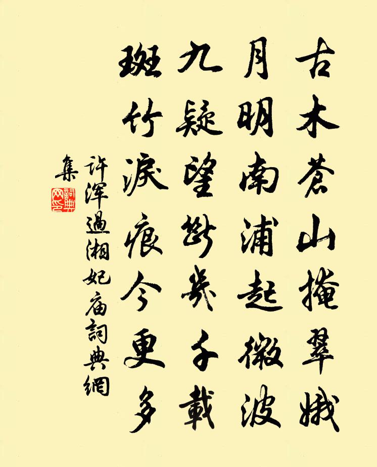 詩詞名句歷史字典書法欣賞書法字典國語詞典說文解字康熙字典古漢語字典標 題 作 者 詩 句 過湘妃廟作者:許渾 朝代:唐代過湘妃廟原文古木蒼山掩翠娥,月明南浦起微波。九疑望斷幾千載,斑竹淚痕今更多。詩詞問答問:過湘妃廟的作者是誰?答:許渾問:過湘妃廟寫於哪個朝代?答:唐代問:過湘妃廟是什麼體裁?答:七絕問:許渾的名句有哪些?答:許渾名句大全許渾過湘妃廟書法欣賞過湘妃廟書法作品注釋全唐詩:卷538-33詩詞推薦吳興辯長老以達磨畫像請贊釋正覺〔宋代〕長蘆駕浪,只履西歸。求 * 之法器,付屈眴之田衣。度九年之緘默,印二祖之靈知。海犀酣月而暈,寒烏帶雪而再用奴字韻寄李廷吉王之道〔宋代〕霜余菊暗荷葉枯,千頭喜見君家奴。離離丹實照綠葉,不減五松官大夫。邇來萬木凍欲死,東君信到梅花須。一枝紹興以後蜡祭四十二首佚名〔宋代〕除壇西郊,坎其聲鼓。百靈至止,結來作主。秬鬯湛淡,玉斝觩觖。是謂嘉德,神其安留。過生米市艤舟求浴望山巔有屋巋然至石岸數步趙蕃〔宋代〕枕水危磯峙不流,是誰曾此被羊裘。遺蹤幾覓無從問,落日清風過樹頭。送唐介南遷五首謝景初〔宋代〕身任言責地,眼見公路埋。胡寧包心顏,踐履天了階。言出說隨至,吏送南海涯。一臣不足惜,喋血狽與豺。頌二首釋道行〔宋代〕我不會兮不如你,堪笑千花知碓觜。善才謾說百城游,何曾踏著自家底。五位釋子淳〔宋代〕偏中正,嫫母臨妝羞照鏡。三更玉戶不挑燈,混融非露當年影。鵲橋仙姬翼〔元代〕瓊分石碎。珠離蚌壞。文豹豐狐自害。眾中誰肯密藏身,但鼓髻、爭頭要賣。誇功即退。成名即敗。鏡里朱顏不再過望亭六首楊萬里〔宋代〕暮鴻作陣猛相追,風有何忙也急吹。惱殺詩人真枉卻,雲窗霧合不曾知。三疊仇遠〔宋代〕在昔金淵池,煙花錦不如。衣冠尊史祖,山水識靈胥。富歲人多賴,前修日以疏。洪崖仙可問,願乞雪精驢。挽方宋賢四絕黃公度〔宋代〕管輅相無壬甲壽,鄭玄夢告已辰年。收書恨未齊東觀,作記虛傳上九天。言羅隱〔唐代〕珪玷由來尚可磨,似簧終日復如何。成名成事皆因慎,亡國亡家只為多。須信禍胎生利口,莫將譏思逞懸河。猩猩和四兄清泉香餅子晃沖之〔宋代〕清絕端因柏子香,風流特可付文房。如何石火須臾頃,得盡人間一日長。枕上二首錢時〔宋代〕自心有過有誰知,看此初萌一念時。一念不分真與妄,十分伶俐十分痴。濟川阻雪九月二十七日客況 其三王冕〔元代〕滕州濟州山不多,平林大野少人家。解貂且問將軍酒,對雪誰言學士茶?直北五更聞玉笛,江南十月老梅花。相逢過嶺寄子由三首(此詩第三首為子由作)蘇軾〔宋代〕七年來往我何堪,又試曹溪一勺甘。夢裡似曾遷海外,醉中不覺到江南。波生濯足鳴空澗,霧繞征衣滴翠嵐。誰遣觀物吟四首邵雍〔宋代〕人之耳所聞,不若目親照。耳聞有異同,目照無多少。並棄耳目官,專用舌口較。不成天下功,止成天下笑。春情寄子安魚玄機〔唐代〕山路欹斜石磴危,不愁行苦苦相思。冰銷遠澗憐清韻,雪遠寒峰想玉姿。莫聽凡歌春病酒,休招閒客夜貪棋。如松壽安雜詩十首游神林谷寄邵堯夫司馬光〔宋代〕山人有山未嘗游,俗客遠來仍久留。白雲滿眼望不見,可惜宜陽一片秋。畫工又作道裝王邁〔宋代〕揚州節鉞非吾愛,肯要腰纏十萬錢。只願天公多與壽,道巾野服伴胎仙。名句推薦花明柳暗繞天愁,上盡重城更上樓。李商隱《夕陽樓》 爐火照天地,紅星亂紫煙。李白《秋浦歌十七首》 雨里雞鳴一兩家,竹溪村路板橋斜。王建《雨過山村》 入苑白泱泱,宮人正靨黃。李賀《同沈駙馬賦得御溝水》 扁舟去作江南客,旅雁孤雲。朱敦儒《採桑子·彭浪磯》 得不為喜,去不為恨。司馬遷《史記·日者列傳》 輕舟泛月尋溪轉,疑是山陰雪後來李白《東魯門泛舟二首》 雲開遠見漢陽城,猶是孤帆一日程。盧綸《晚次鄂州》 掩淚空相向,風塵何處期盧綸《李端公/送李端》 短景歸秋,吟思又接愁邊。史達祖《玉蝴蝶·晚雨未摧宮樹》