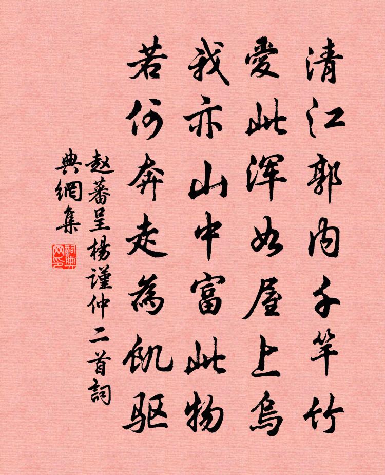 詩詞名句歷史字典書法欣賞書法字典國語詞典說文解字康熙字典古漢語字典標 題 作 者 詩 句 呈楊謹仲二首作者:趙蕃 朝代:宋代呈楊謹仲二首原文清江郭內千竿竹,愛此渾如屋上烏。我亦山中富此物,若何奔走為飢驅。詩詞問答問:呈楊謹仲二首的作者是誰?答:趙蕃問:呈楊謹仲二首寫於哪個朝代?答:宋代趙蕃呈楊謹仲二首書法欣賞呈楊謹仲二首書法作品詩詞推薦傷春黃庚〔宋代〕園林芳事已闌珊,梅未生仁筍未竿。堤上柳棉風脫盡,綠陰應在雨中寒。野軒邵雍〔宋代〕一軒名野非塵境,嵩少煙岑送好風。日月歲時都屬已,更於何處覓壺中。再遊園亭王宏〔唐代〕一夜春膏漲碧溪,水濱沙際潤無泥。幽人綠野臨江曲,太守紅旗轉竹西。初月二首李群玉〔唐代〕灩灩流光淺,娟娟泛露輕。雲間龍爪落,簾上玉鉤明。桂樹枝猶小,仙人影未成。欲為千里別,倚幌獨含情。凝顰一枝花·杭州景關漢卿〔元代〕普天下錦繡鄉,環海內風流地。大元朝新附國,亡宋家舊華夷。水秀山奇,一到處堪遊戲,這答兒忒富貴。滿城中恭次家大人初抵季弟海陵官舍之韻孫應求〔宋代〕一家千里赴吳陵,沿道遲留不問程。風物蕭條鄉愈遠,山川開豁眼增明。春田未有歸耕計,夜雨聊聽對榻聲。幸向滿江紅(八窗叔和,再用韻)李曾伯〔宋代〕竹馬同游,平生志、相期霄壑。今老矣,儒冠寧誤,戎妝徒著。捲起鯨鯢江海事,放教禽鳥山林樂。問尚堪、舞劍逍遙詠宋太宗〔宋代〕雅澹玄中得,常人故不知。幽深無遠近,道外細推之。碧落神仙境,煙霞日月隨。參詳寰宇內,邪正豈相離。題譙國評事壁蔡襄〔宋代〕長岡隆雄來北邊,勢到合下方迴旋。三世白士猶醉眠,山翁作善天應憐。如彼發源今流泉,子孫何數鷹馬然。有起余以檄出陳機宜往西津候別余阻風不得前曾豐〔宋代〕孺子未來圮水上,遠公已過虎溪頭。佳人密邇不相見,弱水瀰漫那自由。非負酪奴辜玉友,莫誅風伯訟陽侯。明年領客君子軒木芙蓉盛開分韻得紅字魏了翁〔宋代〕天公富萬有,盈宇何充充。秋風一搖落,所得緣手空。忽於臞悴中,睹此寒露叢。天然真富貴,送盡人間窮。雅傳句邵伯溫〔宋代〕自昔充城號奧區,蜀人喚作小成都。春日衛宗武〔宋代〕天公軌與物為春,人事紛紛藹若雲。錦繡山川誰管領,只應魚鳥得平分。隨師東李商隱〔唐代〕東征日調萬黃金,幾竭中原買斗心。軍令未聞誅馬謖,捷書惟是報孫歆。但須鸑鷟巢阿閣,豈假鴟鴞在泮林。可惜答使者釋定御〔宋代〕三年過了又三年,閱遍華岩滿五千。功德完滿珍重去,何勞使者上高田。生查子王千秋〔宋代〕雄姿畫麒麟,朽骨分螻蟻。爭似及生前,常為鶯花醉。雲山靜有情,天地寬無際。且放兩眉開,萬事非人意。丙除夜泊舟東湖用白石歸苕溪韻書懷徐端〔宋代〕一卷陰符偶自隨,奴星解事亦忘歸。參橫斗轉吟魂瘦,愁絕寒梢兩綠衣。挽陳孺人劉克莊〔宋代〕鄉井公評推內則,掖垣銘筆寫徽音。不煩陶子羞蚶鮓,肯與黔婁共布衾。三語未酬將母志,九原無負托孫心。樗翁句許庚〔宋代〕思苦無一字,意來成數篇。閒適二首陳造〔宋代〕人間火烈更風蜚,笑殺幽人詠檜枝。貪赴敵場爭腐鼠,寧知造物玩痴兒。百年擾擾玄駒聚,萬化悠悠野馬馳。老子名句推薦灼灼野花香,依依金柳黃。佚名《菩薩蠻·霏霏點點回塘雨》 池花春映日,窗竹夜鳴秋。李白《謝公亭·蓋謝朓范雲之所游》 千金之裘,非一狐之腋也;台榭之榱,非一木之枝也;三代之際,非一士之智也司馬遷《史記·劉敬叔孫通列傳》 君行逾十年,孤妾常獨棲。曹植《明月上高樓》 人生若只如初見,何事秋風悲畫扇。納蘭性德《木蘭花·擬古決絕詞柬友》 兒童強不睡,相守夜歡嘩。蘇軾《守歲》 拼將一死酬知己,致令千秋仰義名。羅貫中《三國演義·第五十回》 天涯也有江南信。梅破知春近。黃庭堅《虞美人·宜州見梅作》 傷高懷遠幾時窮。無物似情濃。張先《一叢花令·傷高懷遠幾時窮》 亭皋木葉下。隴首秋雲飛。柳惲《搗衣詩》