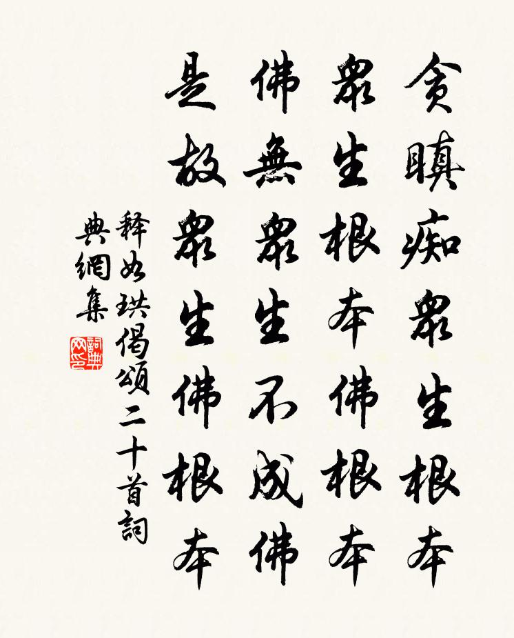 詩詞名句歷史字典書法欣賞書法字典國語詞典說文解字康熙字典古漢語字典標 題 作 者 詩 句 偈頌二十首作者:釋如珙 朝代:宋代偈頌二十首原文貪瞋痴眾生根本,眾生根本佛根本。佛無眾生不成佛,是故眾生佛根本。詩詞問答問:偈頌二十首的作者是誰?答:釋如珙問:偈頌二十首寫於哪個朝代?答:宋代釋如珙偈頌二十首書法欣賞偈頌二十首書法作品詩詞推薦入都席上答曼叔見送韓維〔宋代〕少乏四方誌,所懷在林丘。塵埃豈我事,義往不得留。進酒長亭上,離馬儼行輈。臨分子無慘,且復相從游。題嶽麓西軒三絕胡寅〔宋代〕偶向紅塵得此生,歲寒松竹尚多情。道人亦有生前契,幽處開軒巧見迎。夏日西湖閒居十首汪莘〔宋代〕醉把青荷當篛笠,亂披紅芰作蓑衣。漁翁家在蓬瀛上,欲駕蓮舟一葉歸。月下獨酌·其三李白〔唐代〕三月鹹陽城。千花晝如錦。誰能春獨愁。對此徑須飲。窮通與修短。造化夙所稟。一樽齊死生。萬事固難審。醉後送方復大宣城學錄方回〔宋代〕莆田鄣郡本同宗,更著深衣臭味同。禿筆有天猶易補,孤燈無地可能容。不趨宰相翹材館,寧糾諸侯泮水宮。十載赴召道中王安石〔宋代〕海氣冥冥漲楚氛,汀洲回薄水橫分。青松十里鍾山路,只隔西南一片雲。失鶴劉學箕〔宋代〕頂上新成九轉丹,□花日日到春壇。夜深飛上雲霄去,華表月明風露寒。題四賢像陳希夷劉克莊〔宋代〕錢子非仙者,種郎豈隱哉。先生閉門睡,弟子下山來。去冬鄭剛中〔宋代〕去冬竹瓦迎新雪,曾下珠璣到酒盤。正月便回春意暖,五更微帶雁聲寒。門諳寂寞何須翟,鬢就衰殘豈是潘。祗有送五尉歸覲方岳〔宋代〕喜有吟詩癖,吾儕得往還。客惟依竹語,官只似僧閒。夜雨燈誰共,秋崖藁未刪。柴門黃葉下,別後正須關。詩一首釋邁賢〔宋代〕揚子江頭浪最深,行人到此盡沉吟。他時若向無波處,還似有波時用心鄰叟招飲於石〔宋代〕燈火隔籬落,呼兒掩柴門。鄰叟挽我衣,笑指老瓦盆。酒盡意未已,語雜情更真。嗟嗟行路難,勸我歸與鄰。團圞醉蓬萊(代人上高御帶,時在太學)王之道〔宋代〕正薰風解慍,萱草忘憂,黃梅新霽。縹緲歌台,半金衣公子。丹桂香中,碧梧枝上,兩兩飛還止。似說當年,而今題墨梅王柏〔宋代〕胸中含靜操,筆下走寒梢。一見孤山客,清香盡拆苞。飯罷登山楊萬里〔宋代〕樹遠通鸚響,花晴帶雨痕。登山偶回首,隔水見前村。澹往孤無伴,清歸笑不言。還家更遲著,松菊未應存。贈竇五判官韋渠牟〔唐代〕故舊相逢三兩家,愛君兄弟有聲華。文輝錦彩珠垂露,逸興江天綺散霞。美玉自矜頻獻璞,真金難與細披沙。終須句劉夔〔宋代〕題詩人已貴,袞路冠三台。見牽牛花有感釋寶曇〔宋代〕籬落牽牛又著花,摘花心在鬢先華。故園紅染薑絲在,安得緘封寄各槎。答士宜張埴〔宋代〕老來凡事不須知,只著沖襟向聖涯。怊悵無人思禍水,一窗夜雨客談詩。金剛隨機無盡頌淨心行善分第二十三釋印肅〔宋代〕我人訊息盡,忘軀失卻命。參方不遇人,卻乃成心病。名句推薦花開深洞仙門小,路過懸橋羽節輕。劉滄《贈道者》 馬驕泥軟錦連乾,香袖半籠鞭。薛昭蘊《喜遷鶯·清明節》 有美一人,清揚婉兮。佚名《野有蔓草》 兩岸荔枝紅,萬家煙雨中。李師中《菩薩蠻·子規啼破城樓月》 彭蠡湖天晚,桃花水氣春。白居易《彭蠡湖晚歸》 人有短,切莫揭。人有私,切莫說。李毓秀《弟子規·泛愛眾》 無數春筍滿林生,柴門密掩斷行人。杜甫《詠春筍》 醉里秋波,夢中朝雨,都是醒時煩惱。時彥《青門飲·寄寵人》 倚竹不勝愁,暗想江頭歸路王之道《如夢令·一晌凝情無語》 楓樹夜猿愁自斷,女蘿山鬼語相邀李商隱《楚宮》