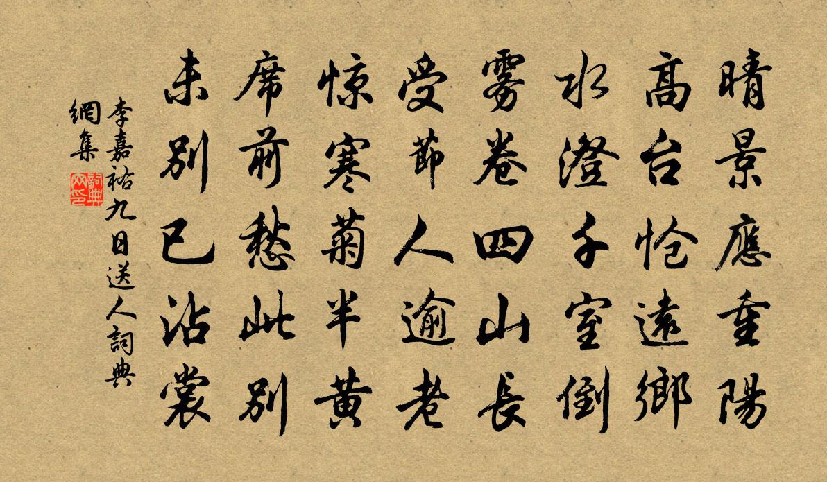 詩詞名句歷史字典書法欣賞書法字典國語詞典說文解字康熙字典古漢語字典標 題 作 者 詩 句 九日送人作者:李嘉祐 朝代:唐代九日送人原文晴景應重陽,高台愴遠鄉。水澄千室倒,霧卷四山長。受節人逾老,驚寒菊半黃。席前愁此別,未別已沾裳。詩詞問答問:九日送人的作者是誰?答:李嘉祐問:九日送人寫於哪個朝代?答:唐代李嘉祐九日送人書法欣賞九日送人書法作品注釋全唐詩:卷206_72詩詞推薦送浮屠宗立東遊二首王之道〔宋代〕西走漫償行腳債,南遊聊勘坐禪翁。不知色力能強健,又復觀潮過浙東。句高似孫〔宋代〕回舟指淞江,徑奔魚蟹海。多雨偶成張九成〔宋代〕謫居天南陲,終年寡儔侶。四月山氣行,淋漓滿城雨。獨坐北窗下,蕭然無一語。睡起復何如,雞鳴已亭午。鑑湖月夜行舟林概〔宋代〕湖光如鑒月如珪,月下湖中兩槳飛。鶴氅四垂冰骨爽,夜深疑自廣寒歸。春雨張耒〔宋代〕浪浪檐前雨,晝夜來不極。青苔生空廊,蝸涎被四壁。出門無所往,端居守籠翮。鳴呼林中鳩,聒聒方自得。林花贈淳邑風水山人何君方回〔宋代〕誰保南陽百世阡,控頤別頰每堪憐。發丘郎將焉容御,裸葬王孫幸獲全。何所不如圍即墨,厥今安在像祁連。小詩秋竹晁補之〔宋代〕秋風多煩冤,竹是歲寒物。朝寒階玲瓏,暮寒階恤勿。翻然下一葉,未覺瘦崷崒。豈無陳根旁,寂莫眾頭屈。何時晴望楊萬里〔宋代〕愁於望處一時銷,山亦霜前分外高。枸杞一叢渾落盡,只殘紅乳似櫻桃。和淮南王相公與賓僚同游瓜洲別業,題舊書齋許渾〔唐代〕碧油紅旆想青衿,積雪窗前盡日吟。巢鶴去時雲樹老,臥龍歸處石潭深。道傍苦李猶垂實,城外甘棠已布陰。賓御江陵送趙知縣二首項安世〔宋代〕萬壑千岩相送時,靈星小雪上豐頤。南雲北夢重分首,撲漉繁霜滿瘦髭。功業向來真自許,頭顱今日遂如斯。英雄寄星婺適莊居士釋智愚〔宋代〕稽首毗耶金粟身,靜中多見鬧中人。卻將不二門頭事,時與虛空細講論。次韻曾吉甫題畫屏風韓元吉〔宋代〕何許江山發興長,渾疑廬阜對彭郎。胸中丘壑元蕭爽,筆下煙波故渺茫。落落疏鬆長映座,冥冥飛雨欲侵床。冷然王君便衣挽章其子遷其母同穴姜特立〔宋代〕昔與先夫子,親如老弟兄。君能敬父執,我亦感交情。放意杯中物,無心世上名。佳城今夜月,應伴酒旗明。江城子無何有翁〔宋代〕小年底死路槐忙。嘆蟬聲,早斜陽。今夕何年,白骨照沙場。天上人間都是夢,石中火,鑊中湯。人如今且免秀才木犀初發呈張功父又和六首楊萬里〔宋代〕約齋詩客坐詩林,泒入江西徹底深。縫霧裁雲梭織錦,明堂清廟玉撞金。已呼毛穎喔齏臼,更約姮娥聘槁砧。細詠阮郎歸佚名〔宋代〕良辰佳景列華筵。笙歌奏筦弦。位居榮顯子孫賢。功名事雙全。慶祝壽,拜尊前。重重福祿堅。願如彭祖壽齊年。臨泉寺徐瑞〔宋代〕扁舟駐寒瀨,輕策到臨泉。僧說黃巢事,碑鑱慶曆年。幽花荒甃晚,落木古城煙。興廢俱陳跡,相看一茫然。答士宜張埴〔宋代〕老來凡事不須知,只著沖襟向聖涯。怊悵無人思禍水,一窗夜雨客談詩。讀天台侍郎黃公神道碑高斯得〔宋代〕昔纂寧宗紀,名臣嘆寂寥。鉅奸方枋國,多士謾盈朝。快讀黃公傳,如聞舜代韶。盡言醒眾聵,獨立聳清標。辨枉弋陽縣江上書觸目陸游〔宋代〕縣前奇哉一江水,日暮風吹碧鱗起。客恨征塵忽如洗,不用金篦刮眸子。丹楓岸邊雪色蘆,下有老翁方捕魚。欲求名句推薦近淚無乾土,低空有斷雲。杜甫《別房太尉墓》 人皆可以為堯舜。孟子《孟子·告子章句下·第二節》 尚憶先朝多樂事,孝皇曾為兩宮開。王守仁《元夕二首》 古者春夏二氣,不決重罪。姚思廉《陳書·本紀·卷三》 葉落風不起,山空花自紅。陳師道《妾薄命·為曾南豐作》 共敵不如分敵,敵陽不如敵陰。佚名《三十六計·圍魏救趙》 秋草獨尋人去後,寒林空見日斜時。劉長卿《長沙過賈誼宅》 粽包分兩髻,艾束著危冠。陸游《乙卯重五詩》 萬里橋西一草堂,百花潭水即滄浪。杜甫《狂夫》 浮雲蔽白日,遊子不顧返。佚名《行行重行行》