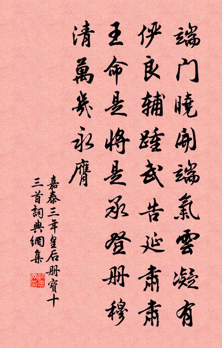 詩詞名句歷史字典書法欣賞書法字典國語詞典說文解字康熙字典古漢語字典標 題 作 者 詩 句 嘉泰三年皇后冊寶十三首作者:佚名 朝代:宋代嘉泰三年皇后冊寶十三首原文端門曉開,端氣雲凝。有儼良輔,踵武告延。肅肅王命,是將是承。登冊穆清,萬幾永膺。詩詞問答問:嘉泰三年皇后冊寶十三首的作者是誰?答:佚名問:嘉泰三年皇后冊寶十三首寫於哪個朝代?答:宋代問:佚名的名句有哪些?答:佚名名句大全佚名嘉泰三年皇后冊寶十三首書法欣賞嘉泰三年皇后冊寶十三首書法作品詩詞推薦沙塞子(中秋無月)周紫芝〔宋代〕秋雲微淡月微羞。雲黯黯、月彩難留。只應是、嫦娥心裡,也似人愁。幾時回步玉移鉤。人共月、同上南樓。卻重蠟梅二首吳芾〔宋代〕園林搖落獨芬芳,未讓江梅雪裡香。還恐人嫌梅太白,故來枝上盡塗黃。暑雨憶衢州一絕蘇籀〔宋代〕衣裳俎豆信華風,酒聖茶顛倚獨松。夏屋渠渠聽聚雨,數尋竹外瀉琤淙。旅寓杜荀鶴〔唐代〕暗算鄉程隔數州,欲歸無計淚空流。已違骨肉來時約,更束琴書何處游?畫角引風吹斷夢,垂楊和雨結成愁。去年哭崔常侍晦叔白居易〔唐代〕頑賤一拳石,精珍百鍊金。名價既相遠,交分何其深。中誠一以合,外物不能侵。逶迤二十年,與世同浮沉。晚有再次才夫韻二絕李流謙〔宋代〕燈窗仍有卷披黃,此地重來似故鄉。安得清江都是酒,勝金滿屋笏堆床。巫山一段雲 洞庭秋月李齊賢〔元代〕衡岳寬臨北,君山小近南。中開北百里湖潭。吳楚入包含。銀漢秋相接,金波夜正涵。舉杯長嘯待鸞驂。且對影成賦山 / 一七令·山令狐楚〔唐代〕山,聳峻,迴環。滄海上,白雲間。商老深尋,謝公遠攀。古岩泉滴滴,幽谷鳥關關。樹島西連隴塞,猿聲南徹荊永康道中戴栩〔宋代〕油笠芒鞋筇一枝,晚秋天氣半春時。雨多樵逕行人少,山崦青紅叫畫眉。少年游(十之十·林鐘商)柳永〔宋代〕佳人巧笑值千金。當日偶情深。幾回飲散,燈殘香暖,好事盡鴛衾。如今萬水千山阻,魂杳杳、信沈沈。孤棹煙波提宮宇文朝議輓辭郭印〔宋代〕憶昔我弱冠,辟廱尾群英。公時少二歲,籍注國子生。同舍氣味同,異姓而弟兄。厥後公筮仕,我亦獵科名。參辰小雨項安世〔宋代〕小雨散炎毒,微風生早秋。清涼人意足,厭浥草光浮。夜枕夢新熱,曉窗梳不收。茅欄聽好語,香稻起西疇。句汪崇亮〔宋代〕夢回酒醒不知處,月靜人稀方憶君。山居十三首蔡格〔宋代〕心遠不妨車馬過,地偏漸聽月風來。參差竹木皆清景,唯有梅枝手自栽。送王侍御赴宣城許棠〔唐代〕朝回離九陌,島外賞殘春。經宿留閒客,看雲作主人。時清難議隱,位重亦甘貧。岩洞真仙境,應休別臥鄰。挽知容詐明請陶公羅一鶚〔宋代〕昔曾親誨色,霜凜更春溫。貌古心猶古,年尊德亦尊。頓驚生列隔,奈有典型存。愁絕飛丹旐,憑誰為返魂。送方外上人 / 送上人劉長卿〔唐代〕孤雲將野鶴,豈向人間住。莫買沃洲山,時人已知處。紅梅 十六王冕〔元代〕仙子云中駕鶴歸,翩翩霧佩曉風吹。玉肌輕染燕脂色,恰似羅浮夜醉時。華頂道者項斯〔唐代〕仙人掌中住,生有上天期。已廢燒丹處,猶多種杏時。養龍於淺水,寄鶴在高枝。得道復無事,相逢盡日棋。一寸金佚名〔宋代〕頓悟修行道理,除情戰睡敵魔。不貪名利少風波。懶散隨緣且過。飢後尋街乞飯,飽時信步蹉跎。閒來古廟唱哩*名句推薦庭花蒙蒙水泠泠,小兒啼索樹上鶯。貫休《春晚書山家屋壁二首》 記取江湖泊船處,臥聞新雁落寒汀。陸游《夜泊水村》 宿空房,秋夜長,夜長無寐天不明。白居易《上陽白髮人》 連山變幽晦,綠水函晏溫柳宗元《飲酒》 如來說諸心皆為非心是名為心。鳩摩羅什譯《金剛經·一體同觀》 來時父母知隔生,重著衣裳如送死。王建《渡遼水》 荷花開後西湖好,載酒來時。歐陽修《採桑子·荷花開後西湖好》 一手獨拍,雖疾無聲。韓非及後人《韓非子·功名》 十年離亂後,長大一相逢。李益《喜見外弟又言別》 賈生年少虛垂淚,王粲春來更遠遊。李商隱《安定城樓》